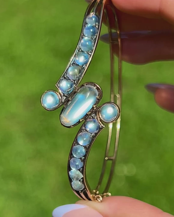 EXCELLENT: This antique Victorian bangle is in excellent overall condition for its age. The stones are beautifully matched and securely set, their mystical blue sheen capturing the light with every movement. The setting remains strong and the bypass design retains its original shape and integrity. There is some mild surface wear to the Gold, commensurate with age and gentle use, but nothing that detracts from the beauty or wearability of the piece.