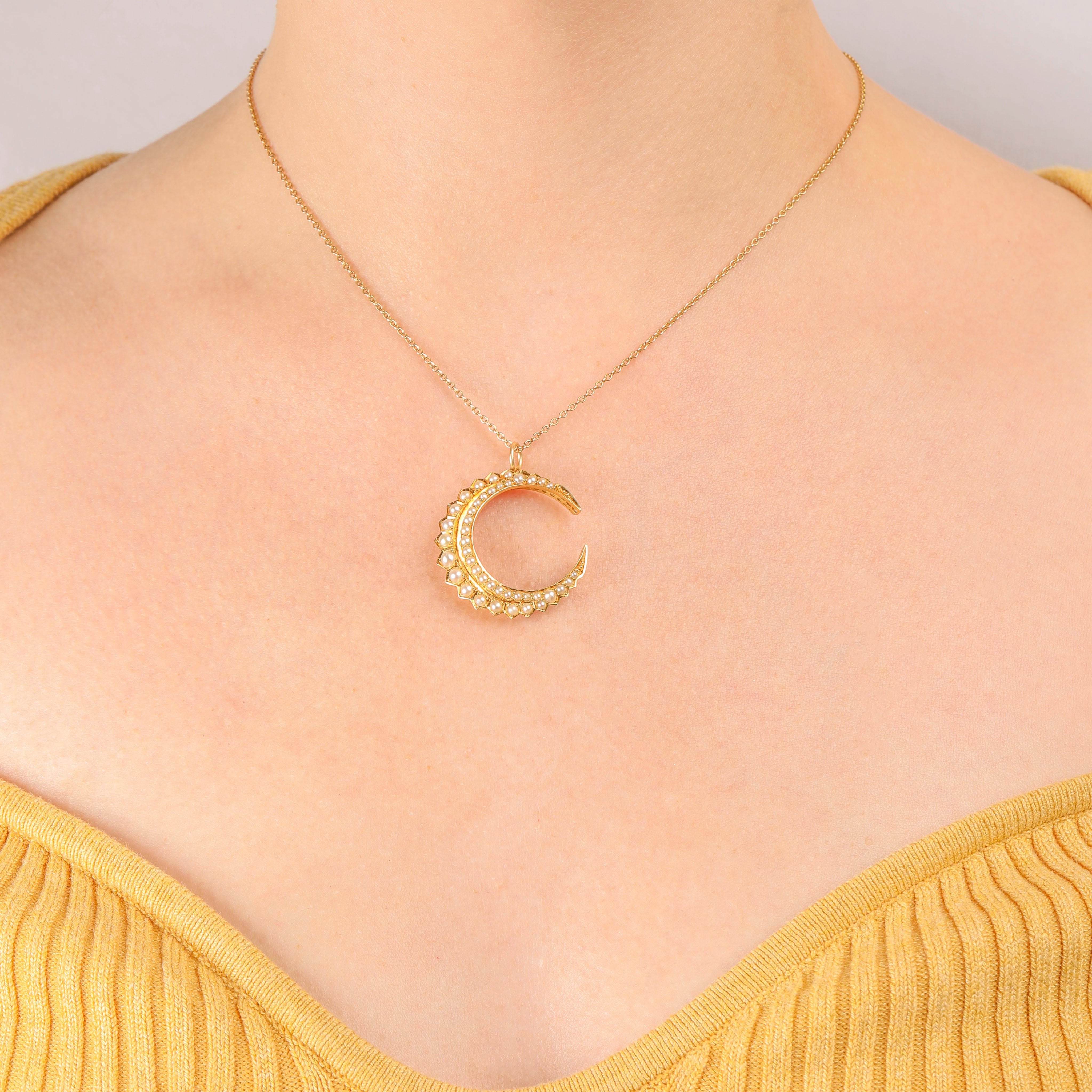 EXCELLENT. This antique 15ct Gold double row Pearl crescent moon pendant is in excellent condition! All Pearls are present, possessing a lovely luminosity and shimmer. They graduate in size, and sit securely within saturated 15ct Gold. She is an authentic Victorian find deserving of a home where she'll be cherished!