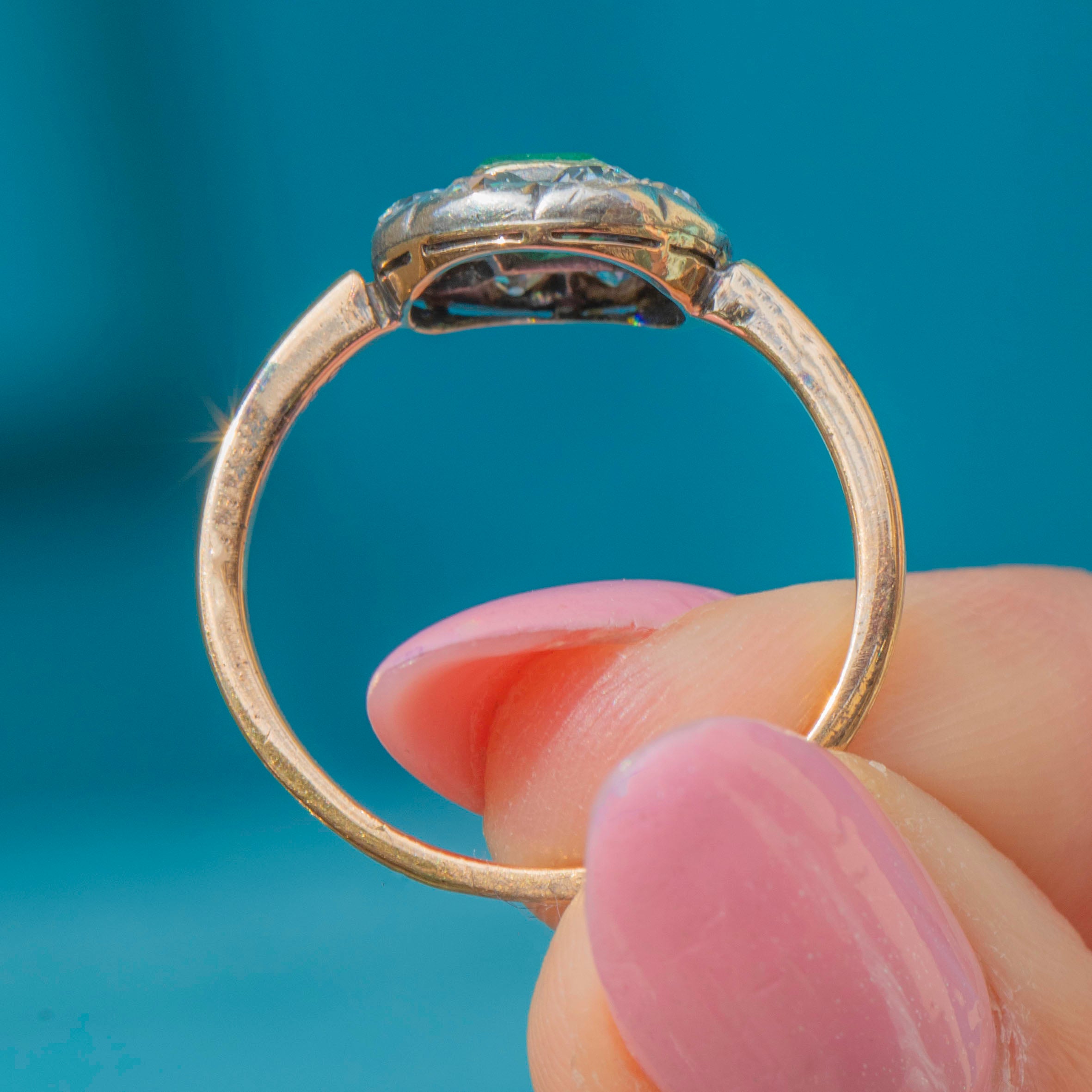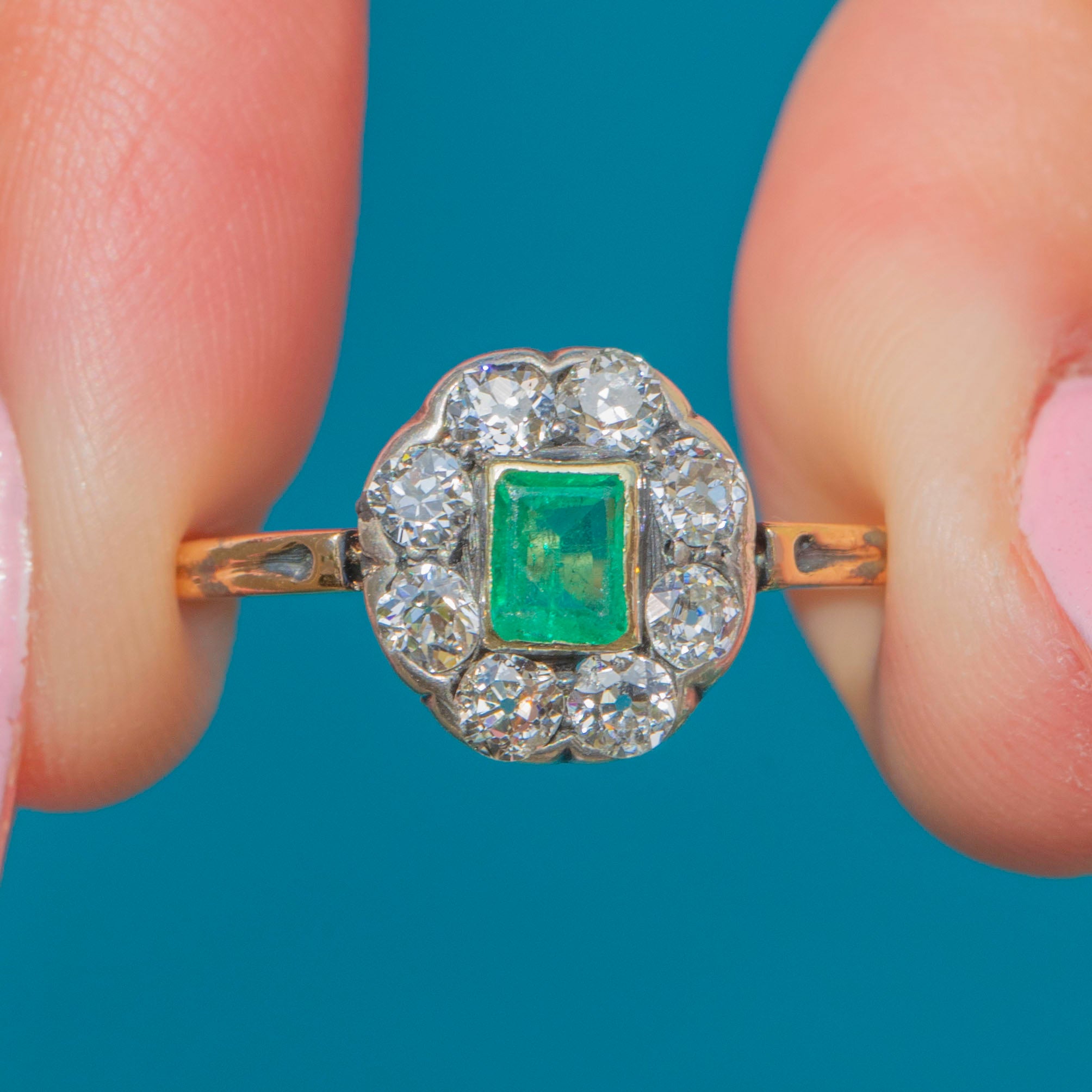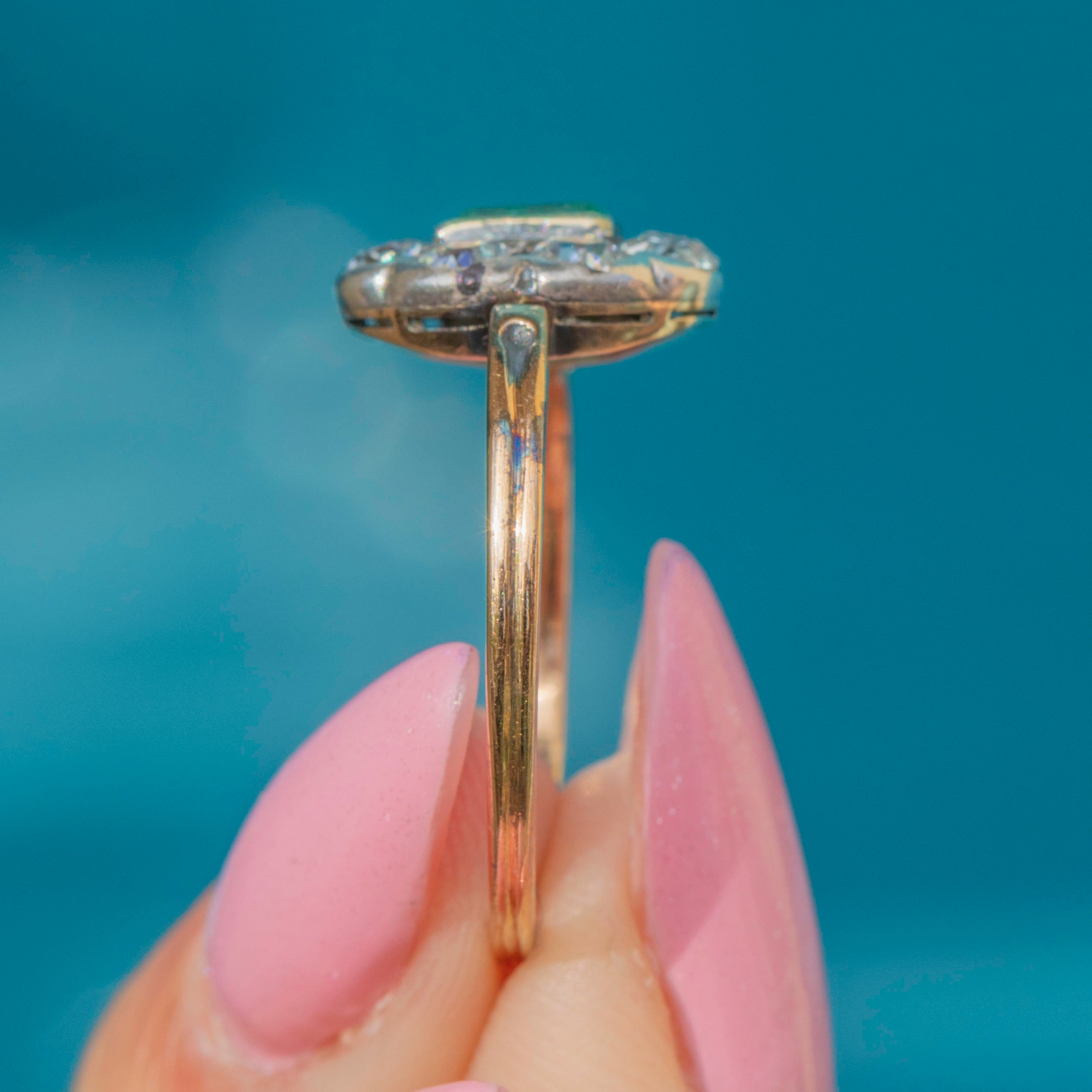 The impressive gemstones are arranged into an eye-catching floral cluster, providing wonderful finger coverage. Held round your finger by a luxurious 15ct Gold band, this Victorian Emerald Diamond exudes antique charm from its every curve.