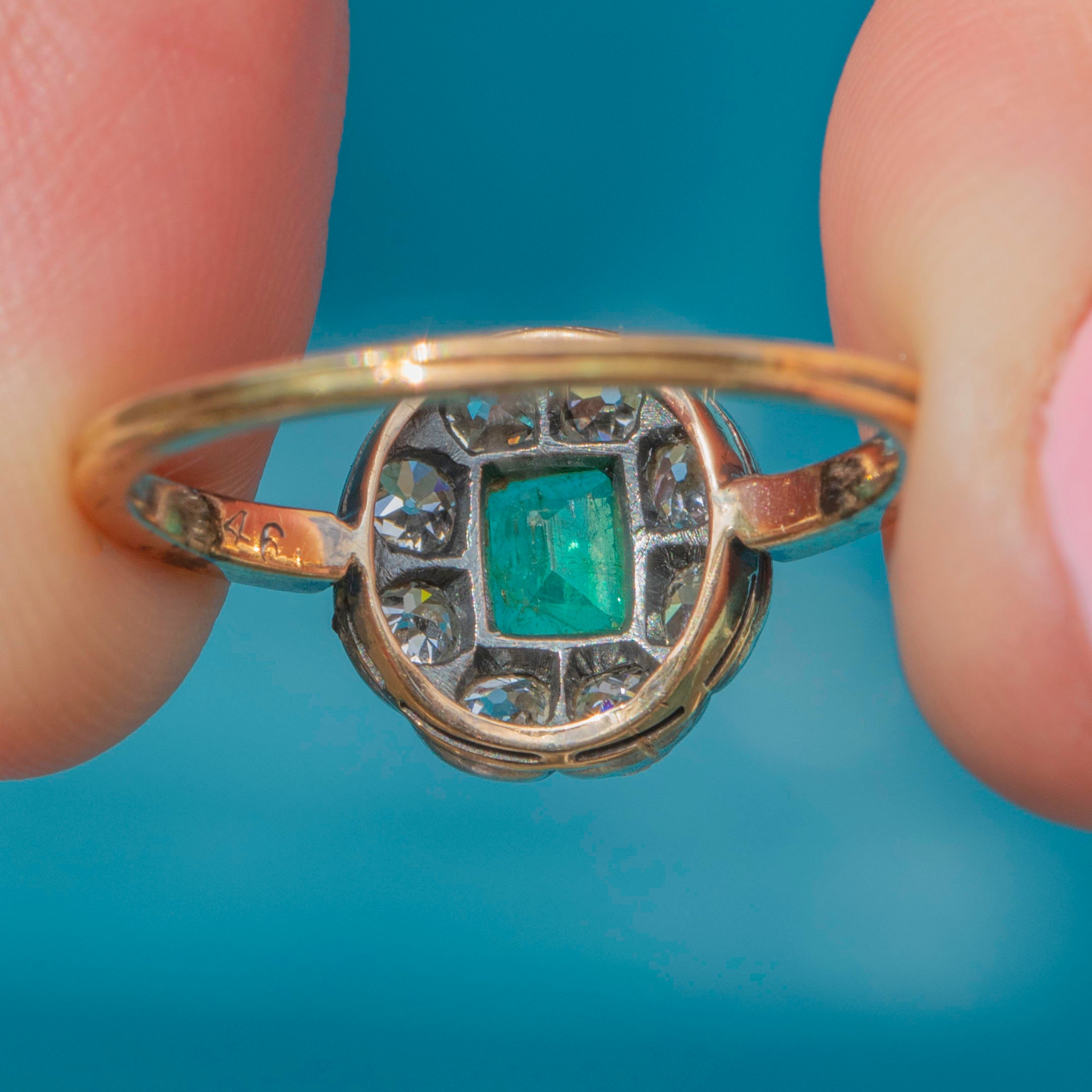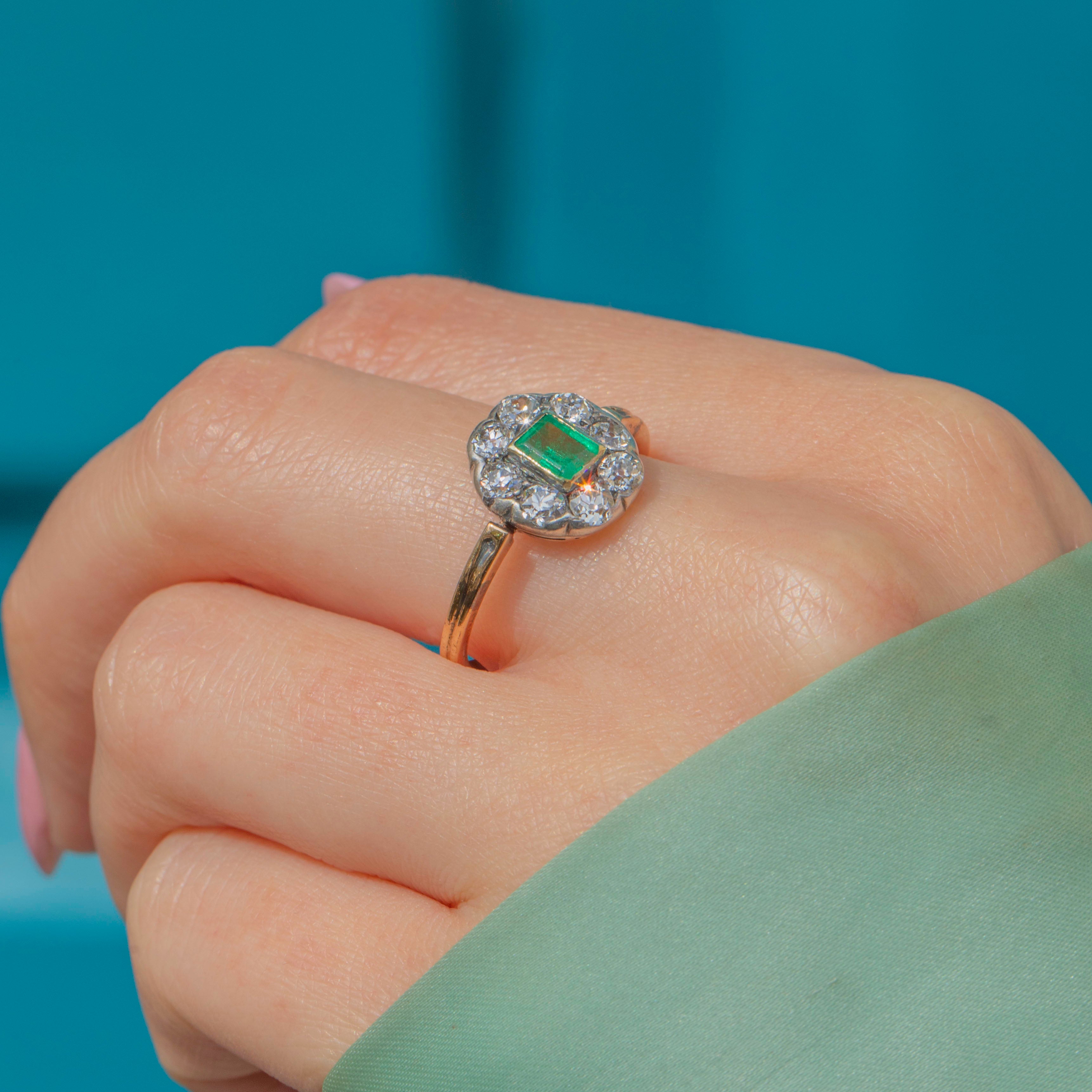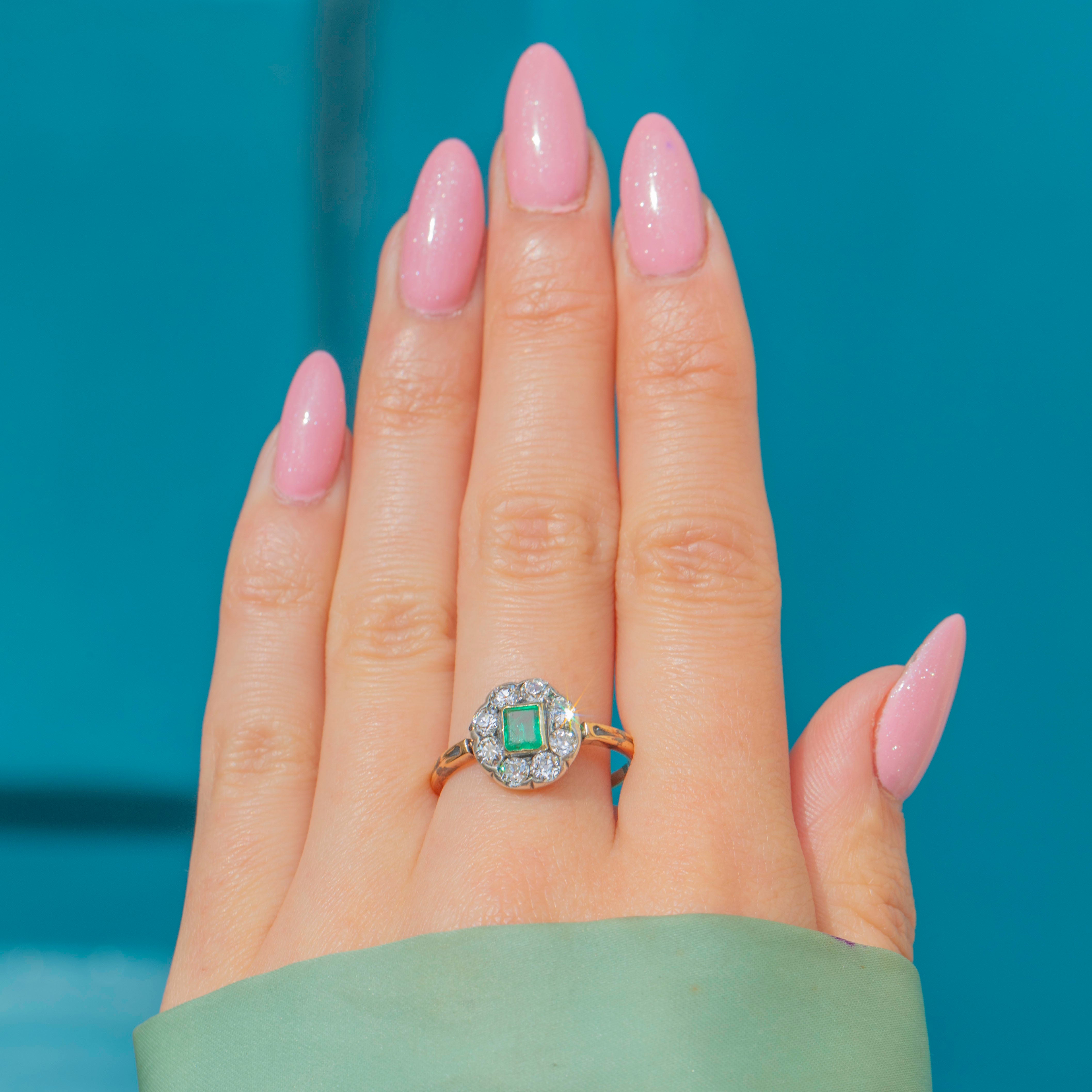 VERY GOOD: This antique 15ct Gold Emerald Diamond cluster ring is in very good condition. The gemstones are all present, with only the Emerald showing minor surface wear, commensurate with age. The Emerald is secure within its 15ct Gold bezel, and the Diamonds are securely set within lustrous Silver. Although the Gold shows mild age-related wear, it is still buttery, and the band has held its form well,  providing secure wear. Endlessly pleasing to look at, this Victorian ring will take pride of place in your antique jewellery collection!