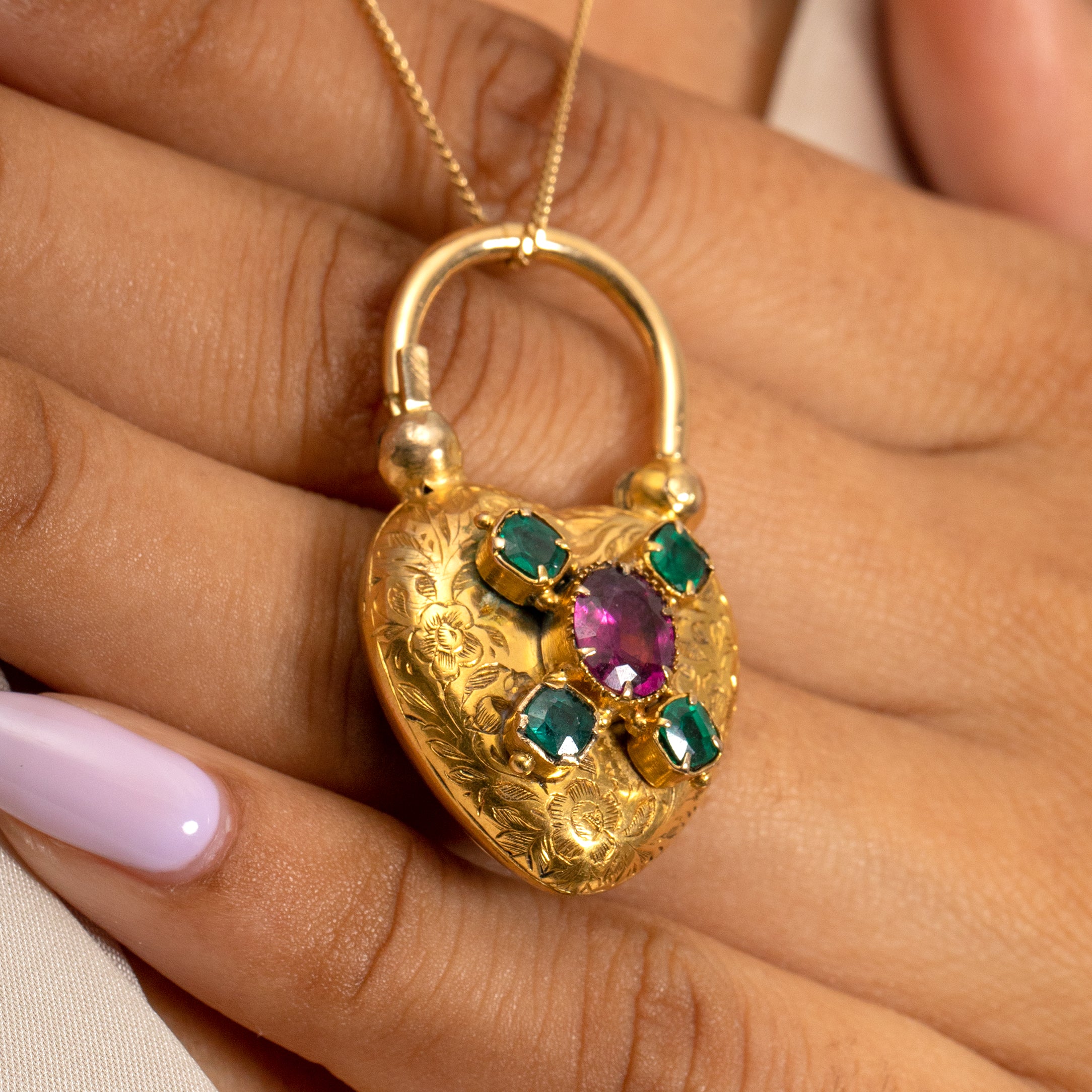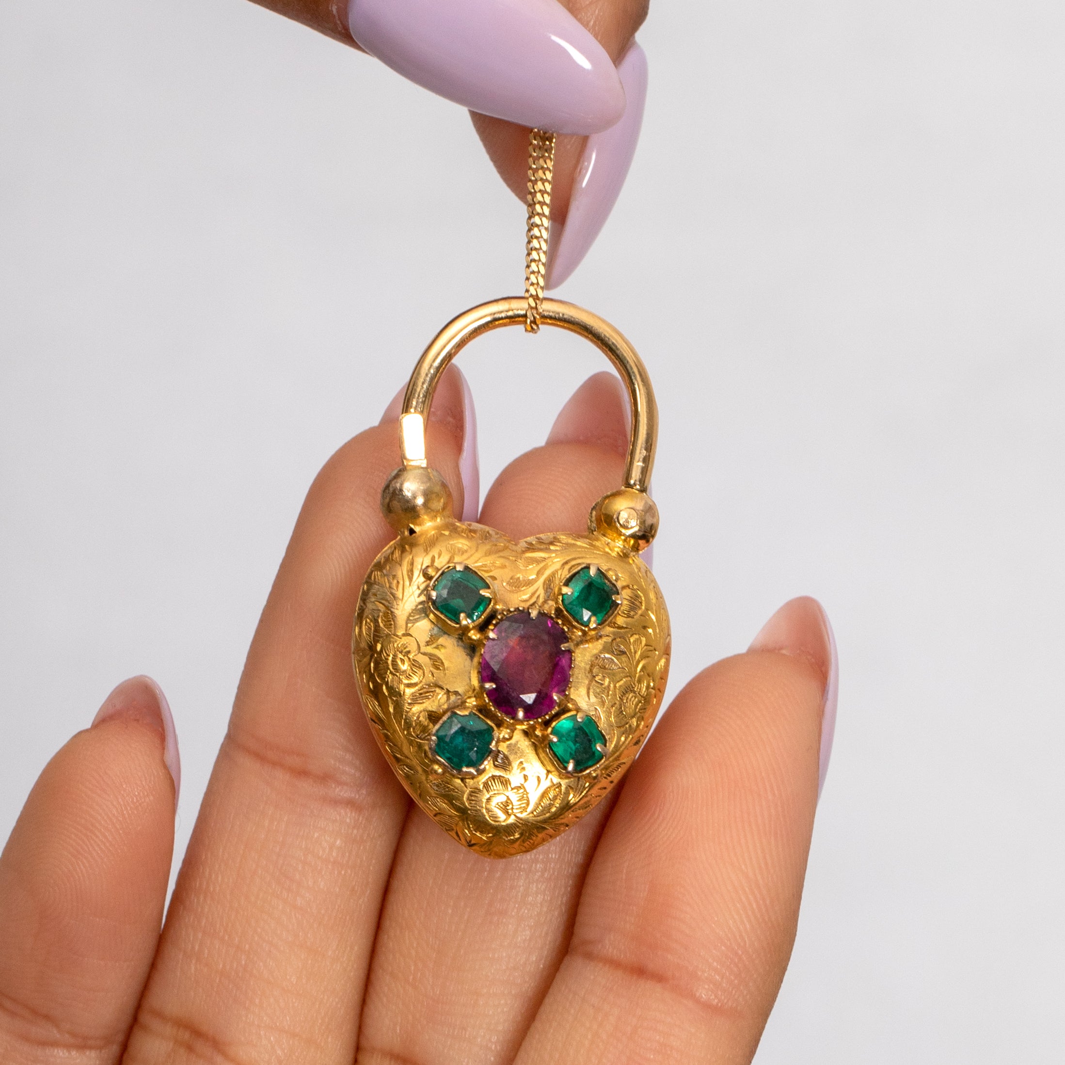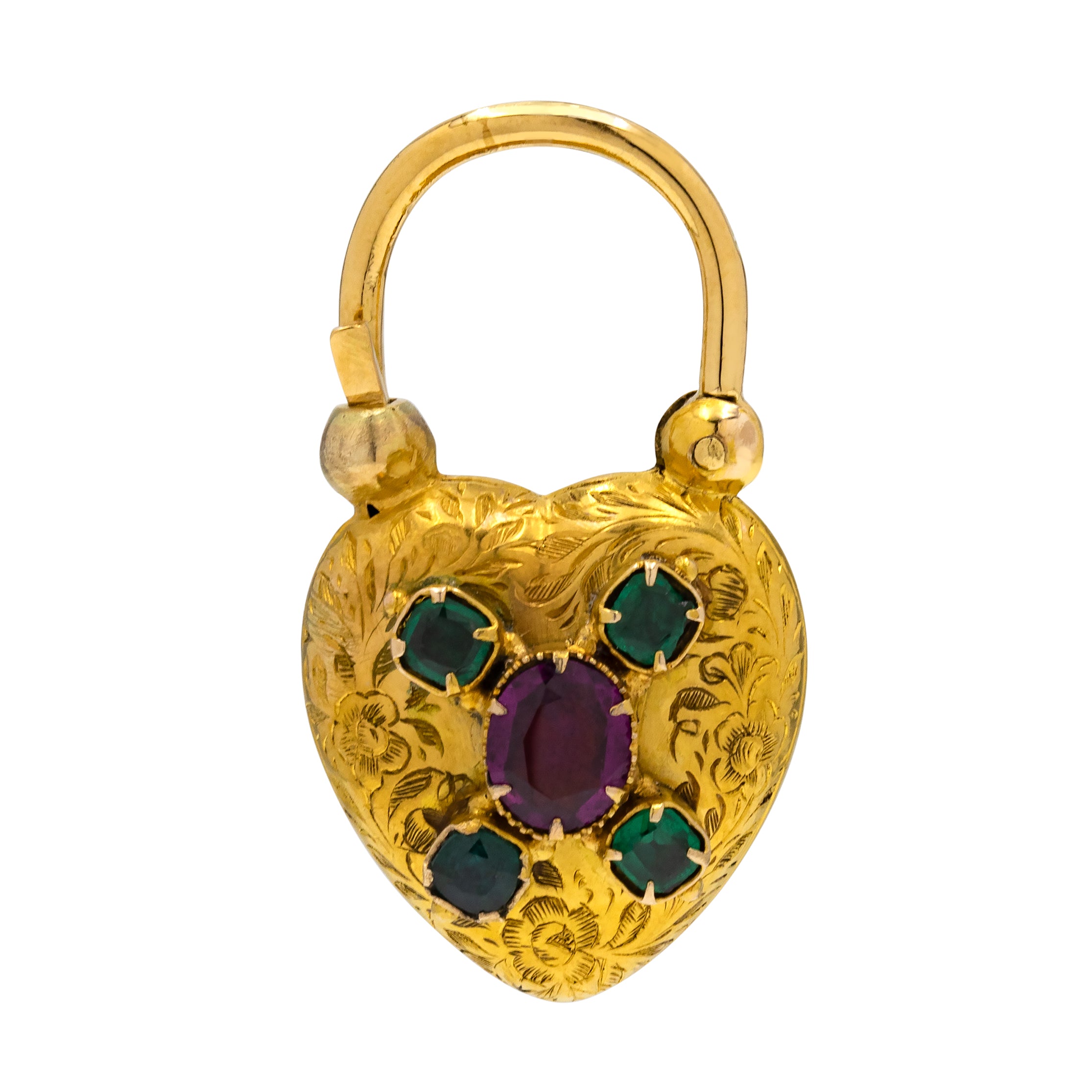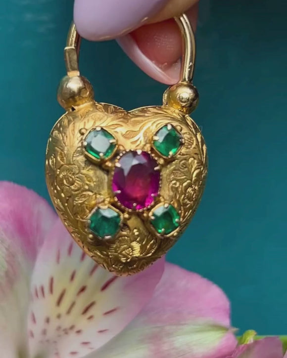 Lovers of romance and refinement will adore this antique 15ct Gold Emerald heart padlock! Hand-crafted during the mid-19th century, this Victorian padlock is adorned with a floral engraved front, embellished with a grape-hued flat-cut Garnet and bright green Emeralds.