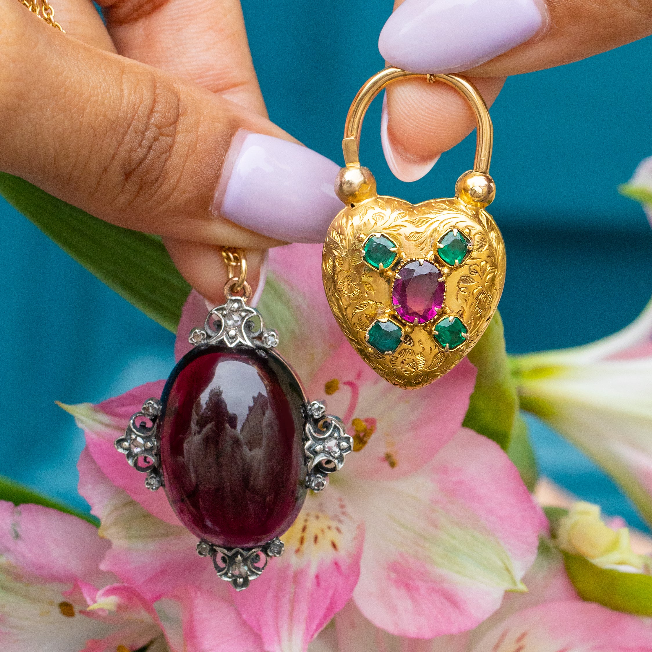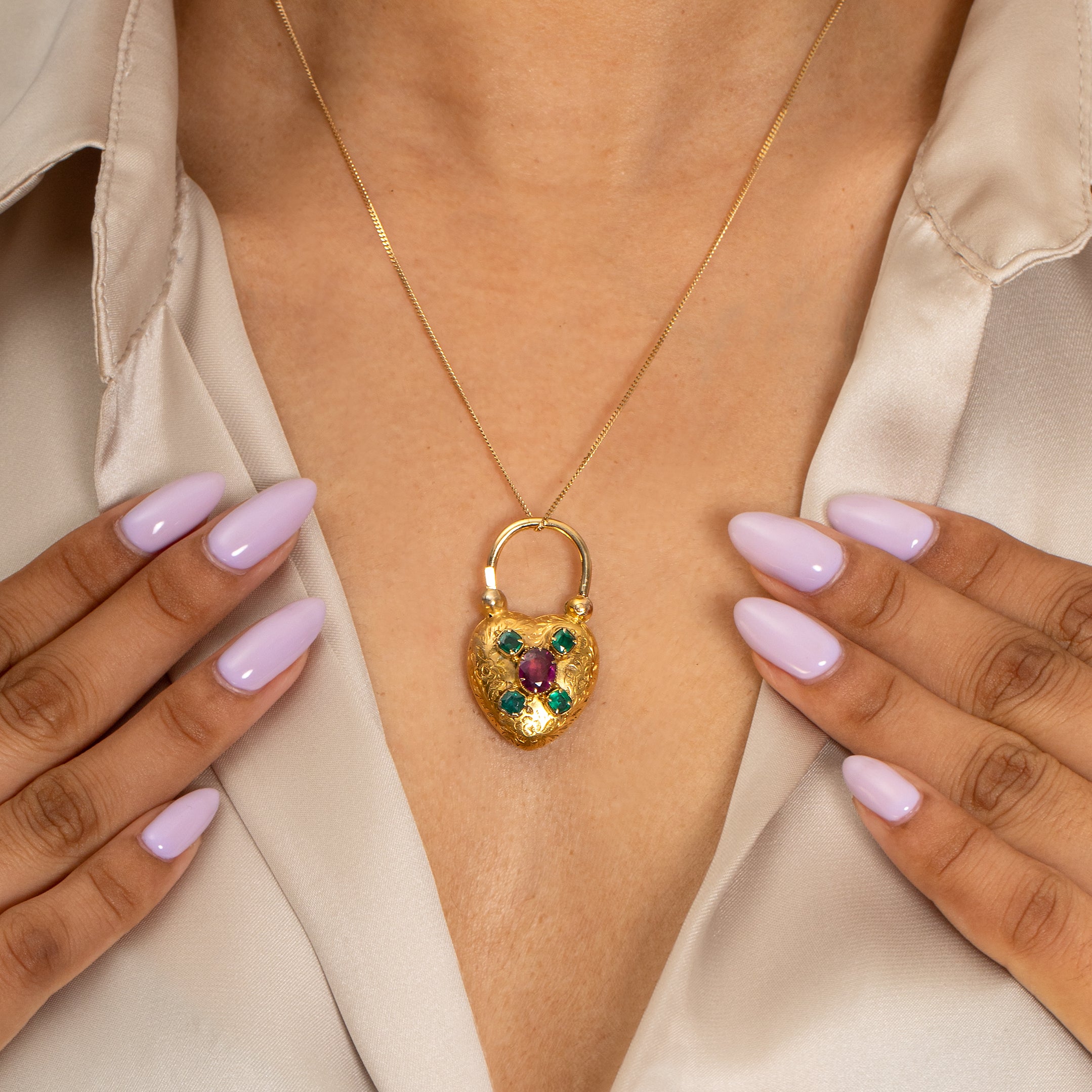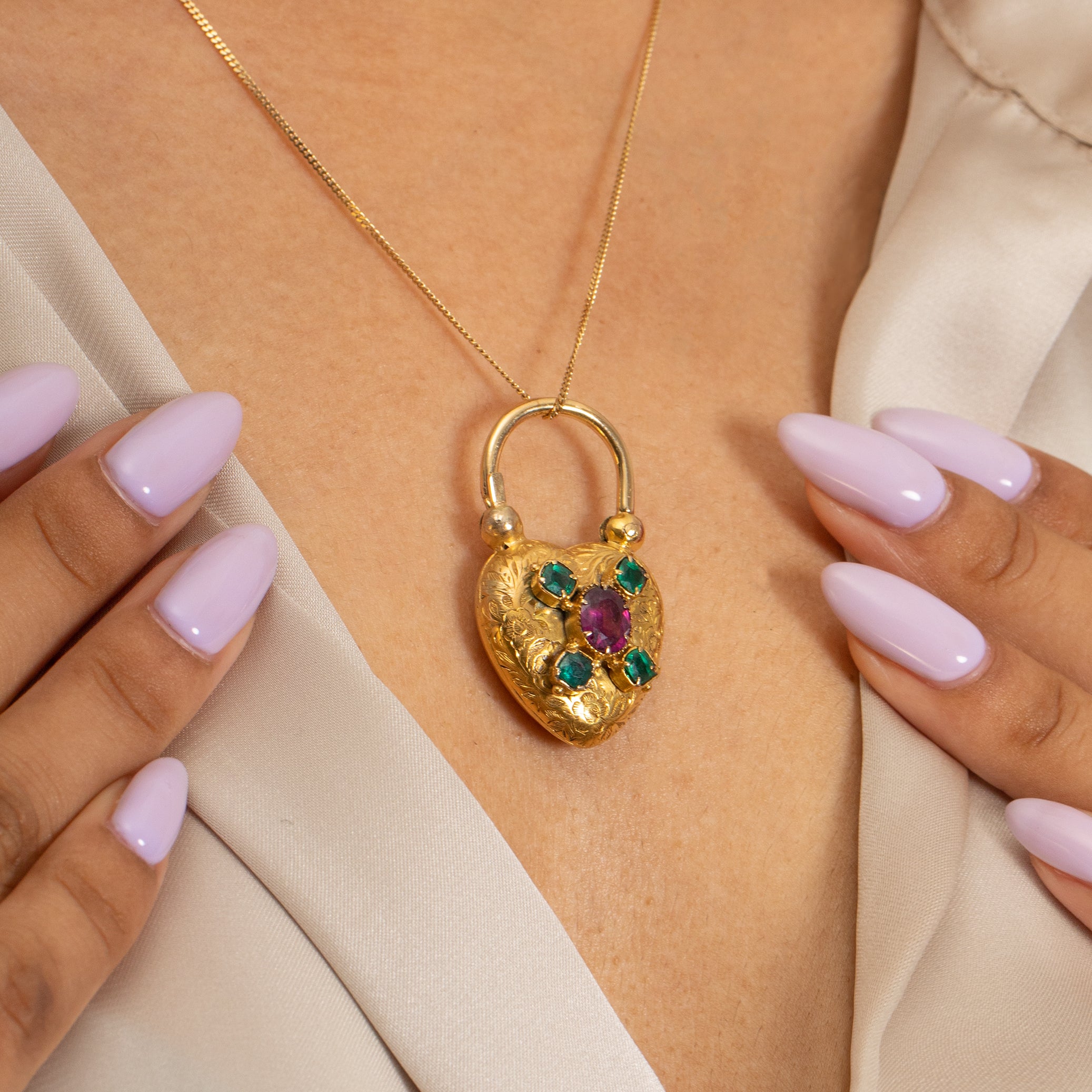 Lovers of romance and refinement will adore this antique 15ct Gold Emerald heart padlock! Hand-crafted during the mid-19th century, this Victorian padlock is adorned with a floral engraved front, embellished with a grape-hued flat-cut Garnet and bright green Emeralds.