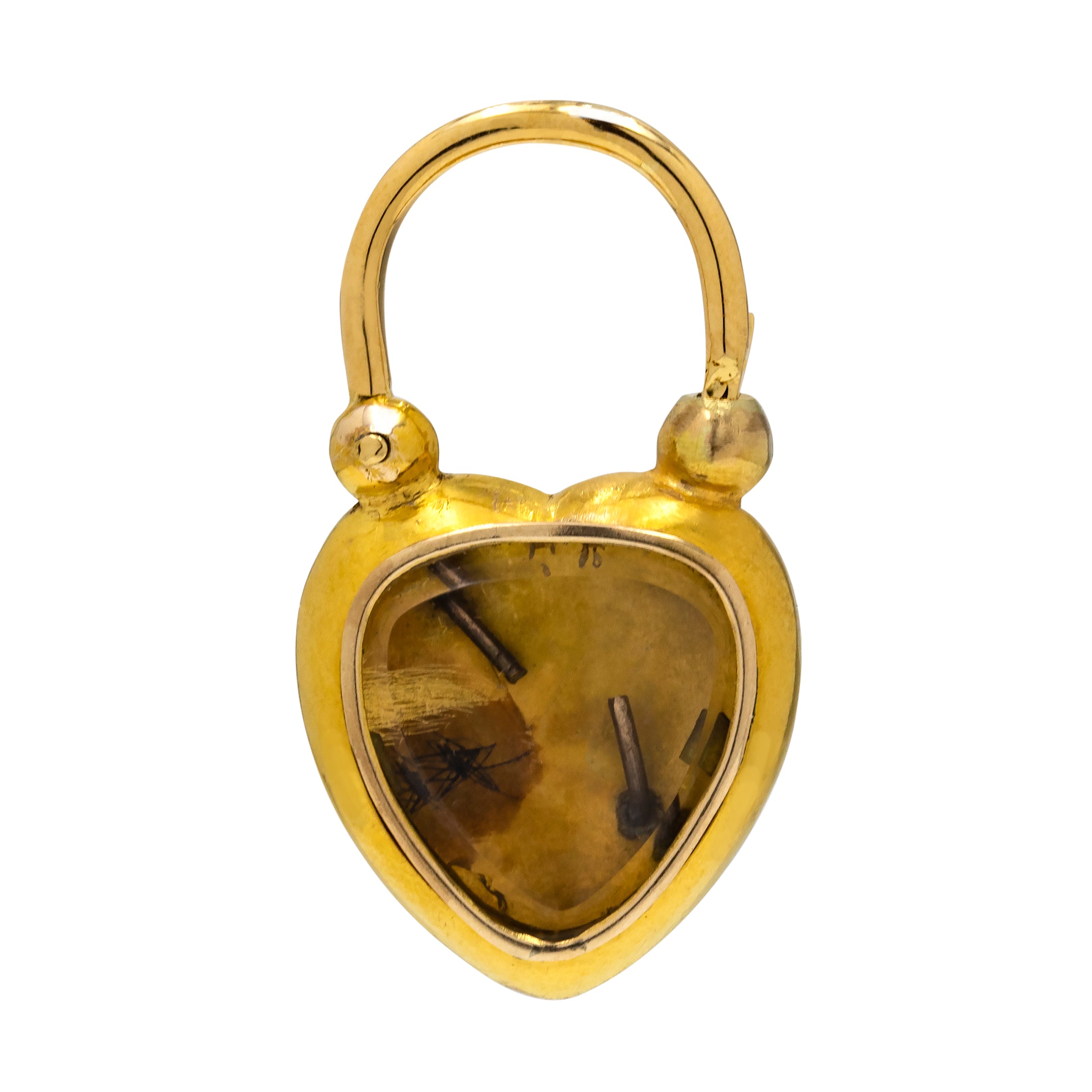 MATERIALS: The heart tests as solid 15ct Gold, with a solid 18ct Gold padlock "arm". The locket-back section is crafted from glass, a metal border for strength and a 9ct Gold rim. Emeralds, Garnet.