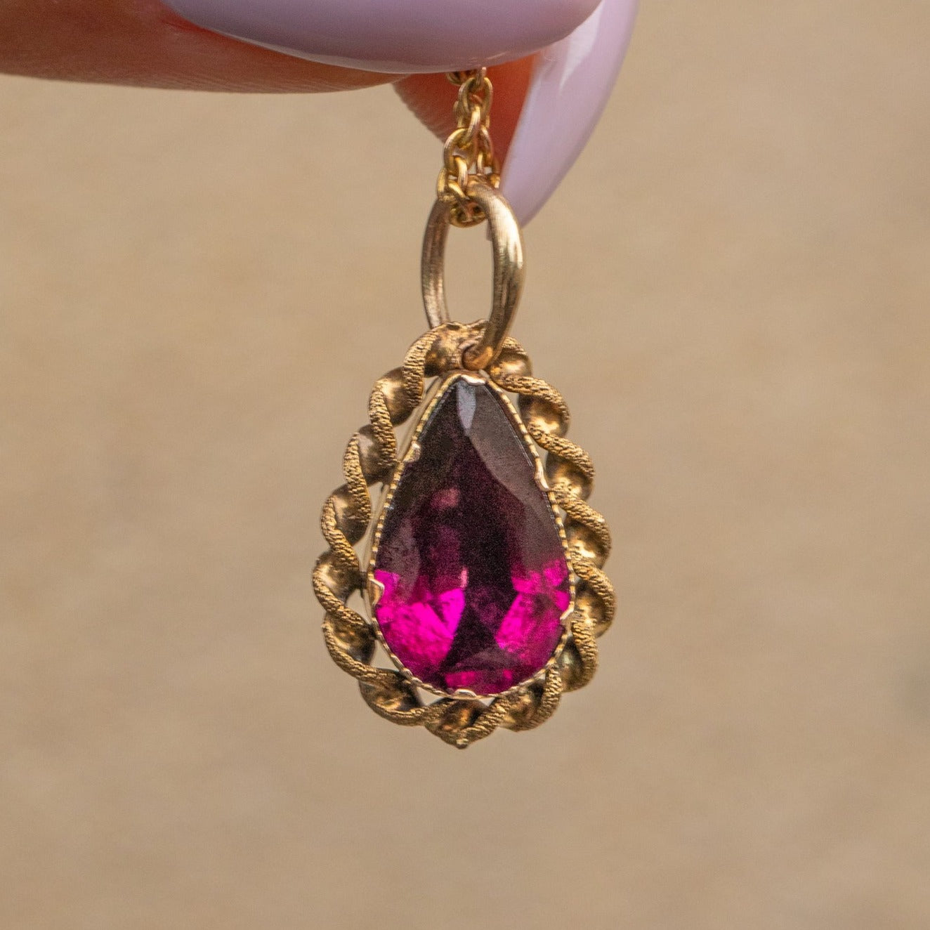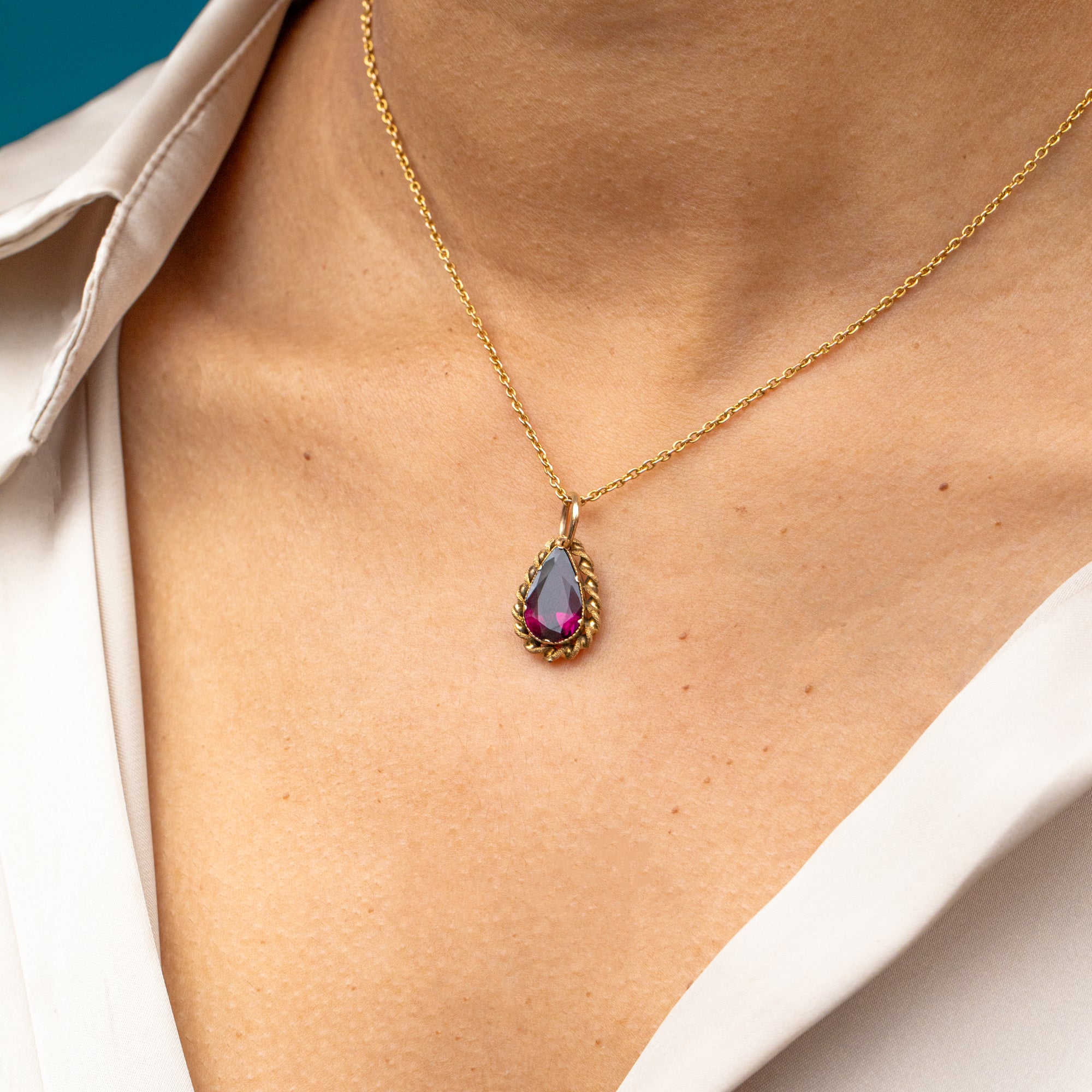 Add a touch of antique luxury to your outfit with the spectacular Georgian 15ct Gold flat-cut Garnet pear-shaped pendant! A mesmerising 3.40ct Garnet takes centre stage, flaunting a seductive crimson hue that dances across her facets as she catches the light.