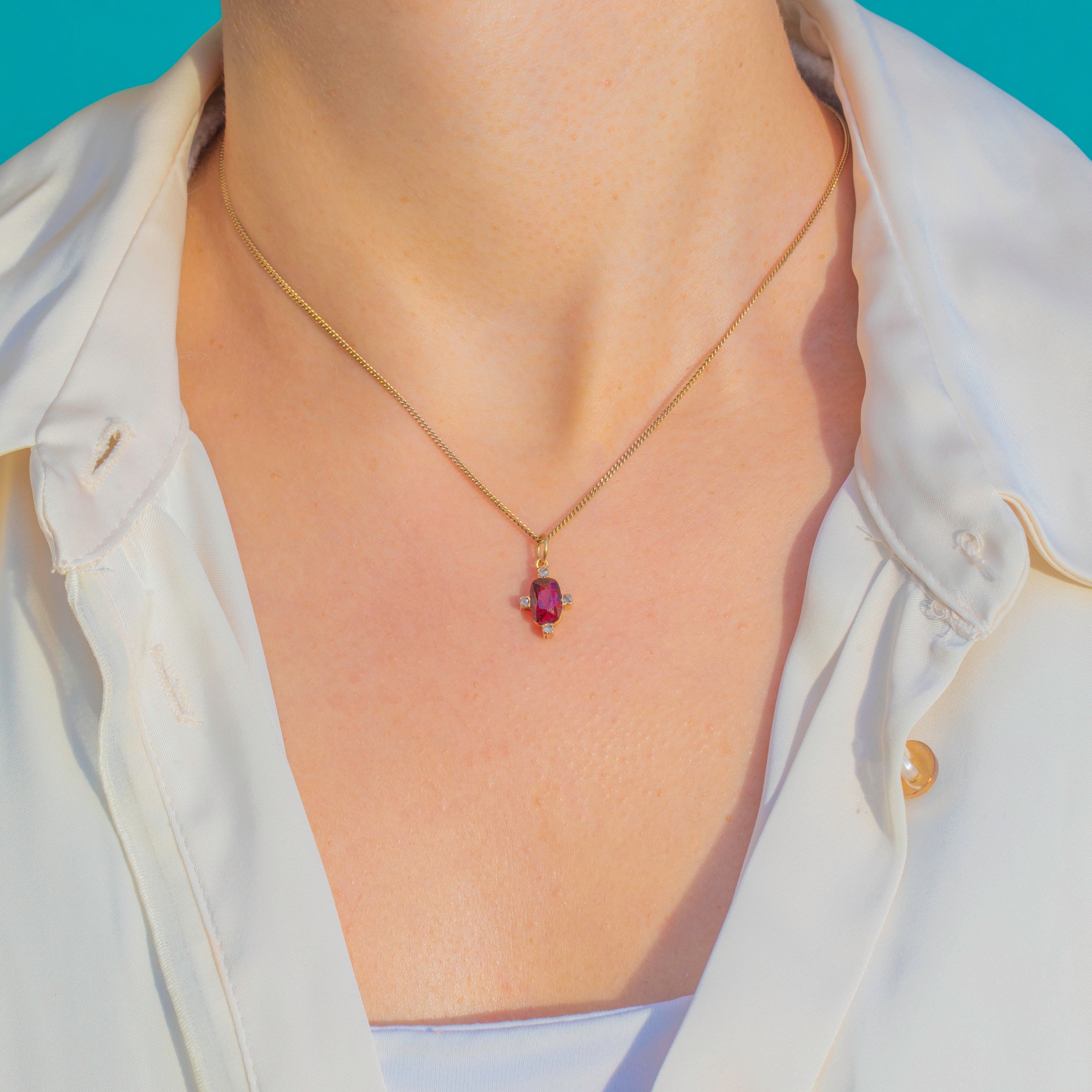 EXCELLENT: The Garnet is bright with minimal surface wear, and the Diamonds are lively with no chips or abrasions noted. The Gold setting is strong and well-preserved with only light antique patina. A beautifully kept Victorian charm.