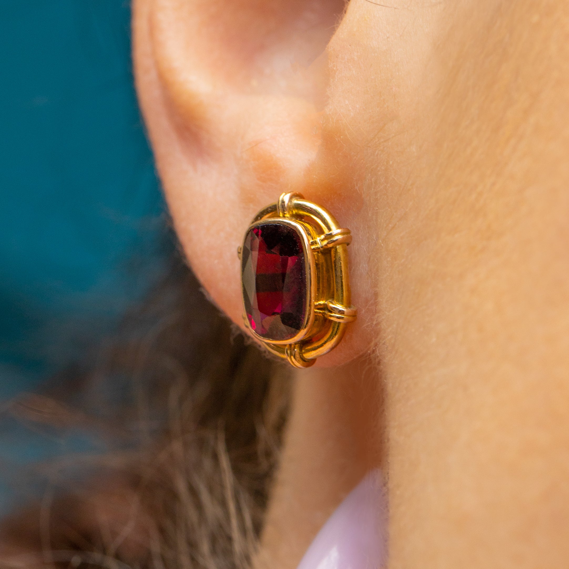 VERY GOOD-EXCELLENT. These antique 15ct Gold Garnet stud earrings are in wonderful condition! The Gold is brightly saturated and smooth with all the details firmly affixed. The Garnets have a brilliant red hue with only some minor surface wear noticeable under very close inspection. With securely soldered posts and tightly fitting butterfly backs, these Victorian Garnet earrings are ready to be worn with pride for years to come!