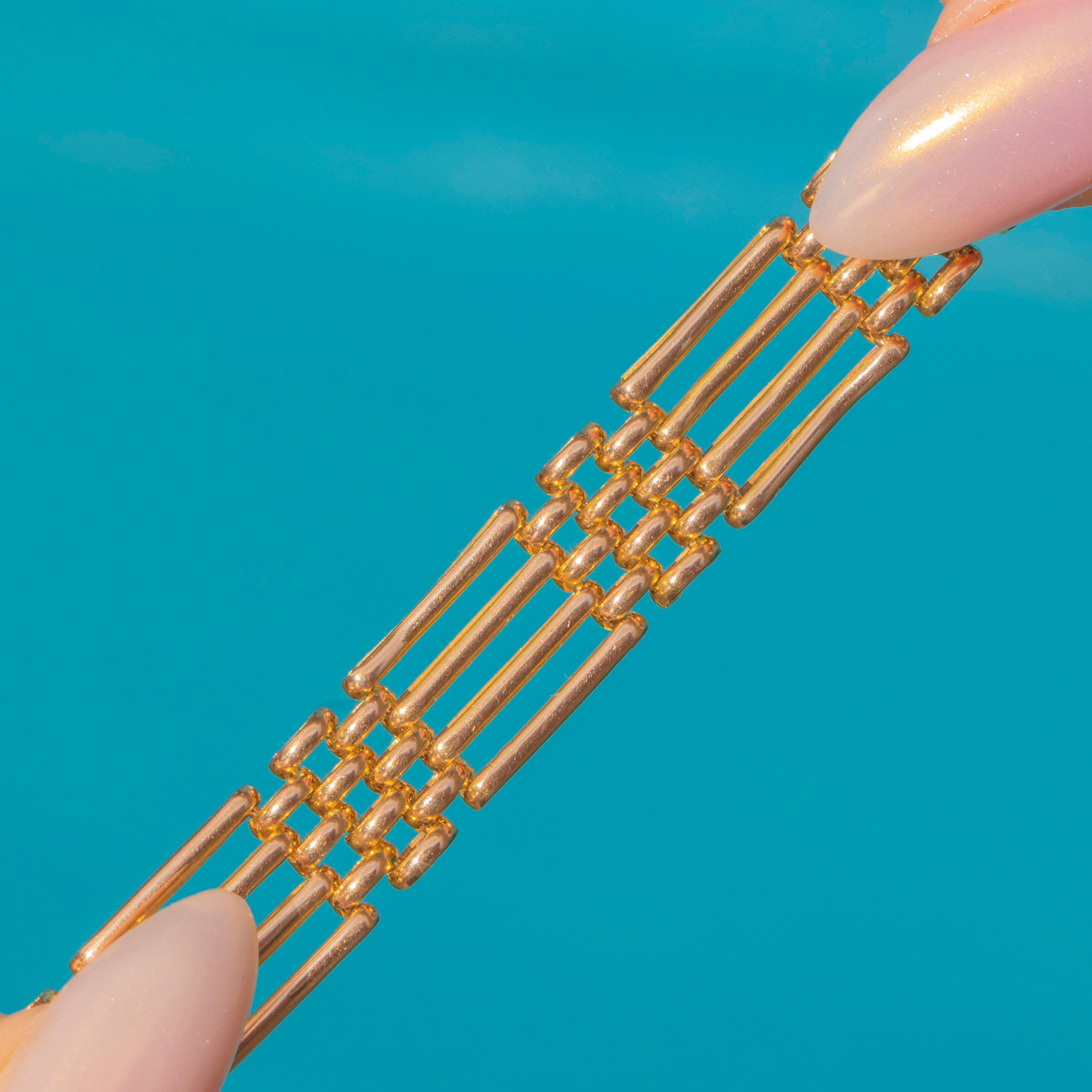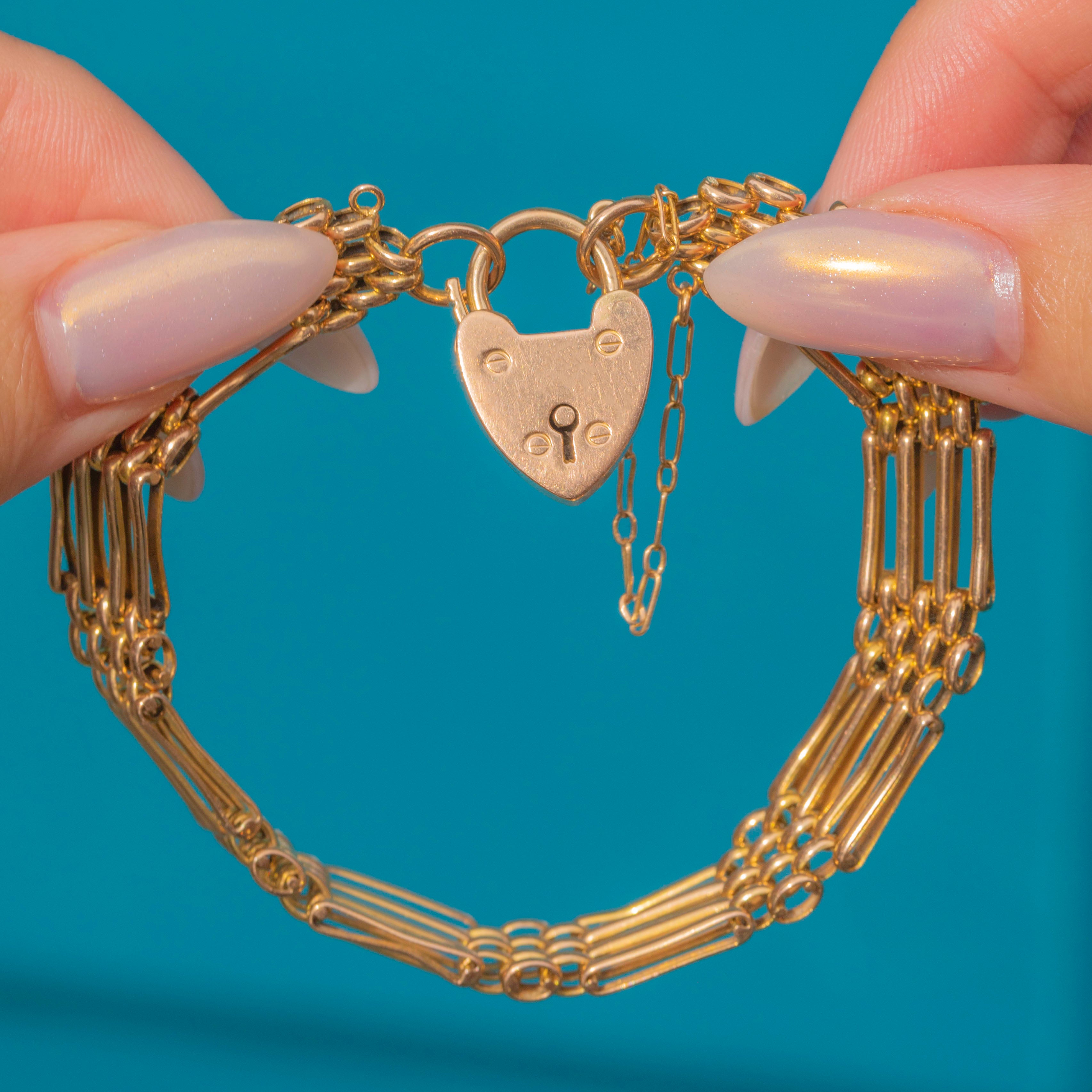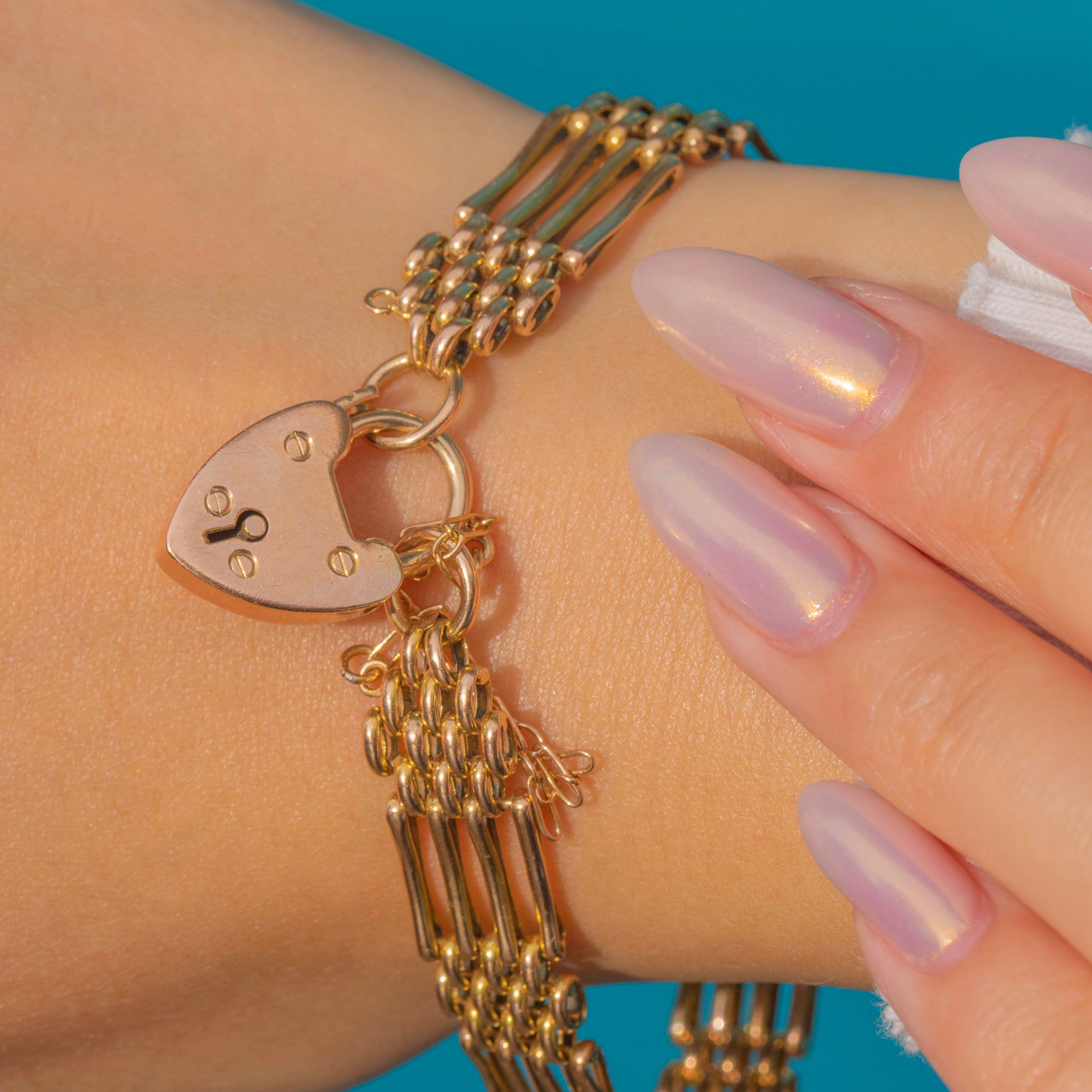 EXCELLENT: The Gold retains a bright, glossy finish throughout. The links are fully intact with no signs of damage or repair. The heart padlock clasp works perfectly, making this bracelet a secure and beautiful piece ready to wear.