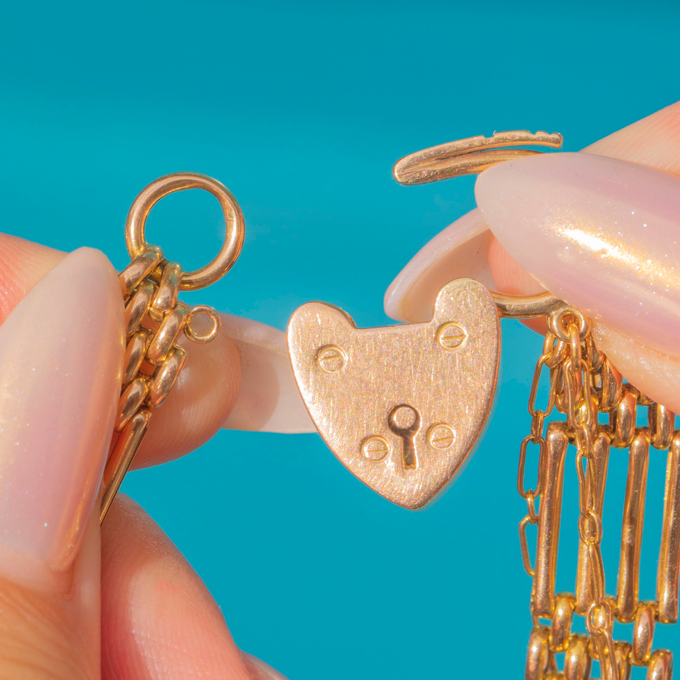 A superb Antique Victorian gate bracelet crafted in solid 15ct Gold, finished with a romantic heart padlock clasp. The classic multi-bar gate design offers both strength and elegance, with beautifully interlinked sections that drape fluidly around the wrist. A traditional symbol of love and commitment, the heart padlock clasp adds a sentimental touch and is fully functional.