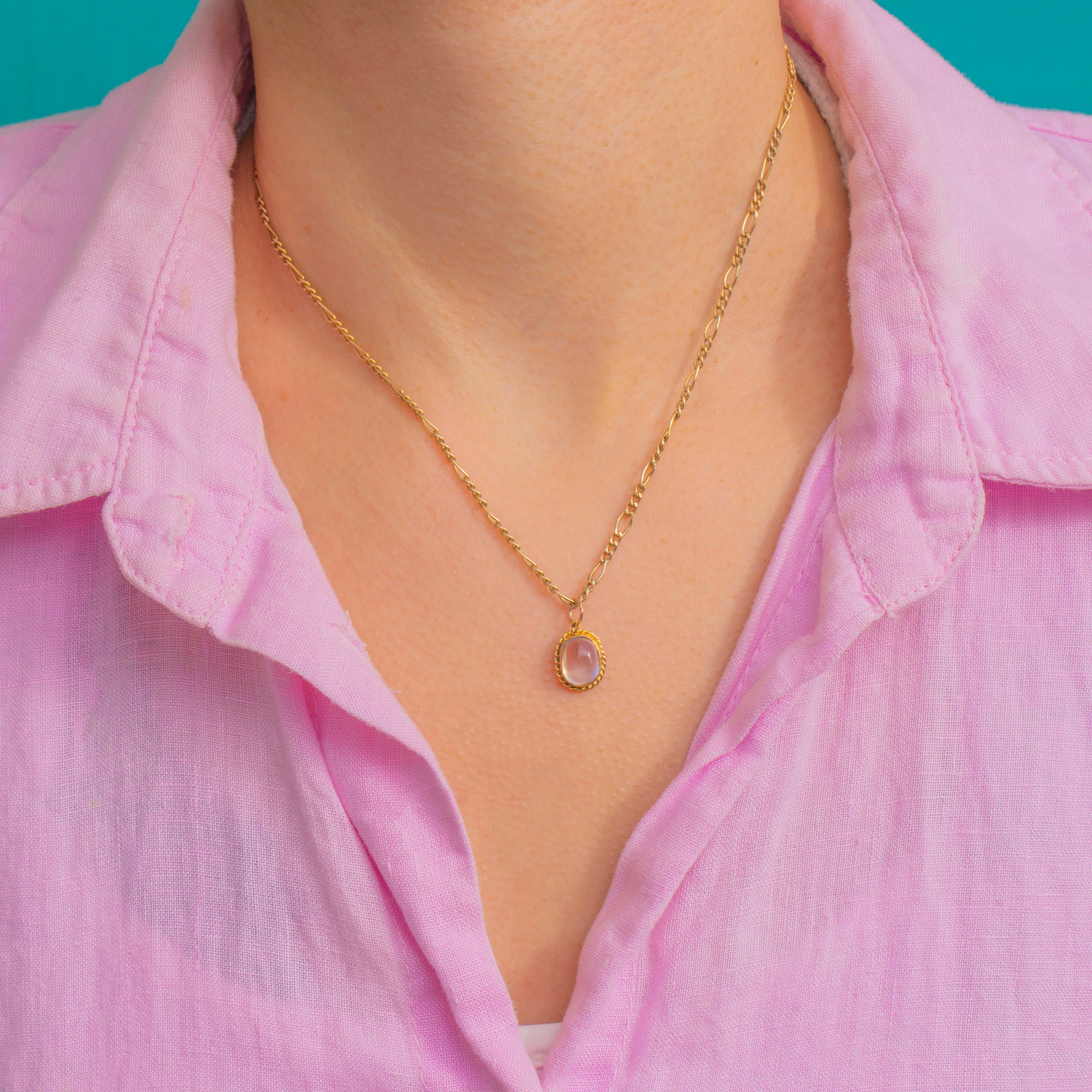 Ethereal and elegant, this Victorian Moonstone charm is a petite treasure in buttery 15ct Gold. The oval cabochon Moonstone shimmers with beautiful adularescence, casting blue-white flashes with hints of peach and lilac as it moves. A neatly executed bezel is framed by a delicate rope-twist border, lending subtle texture and vintage romance in a wearable, everyday scale.