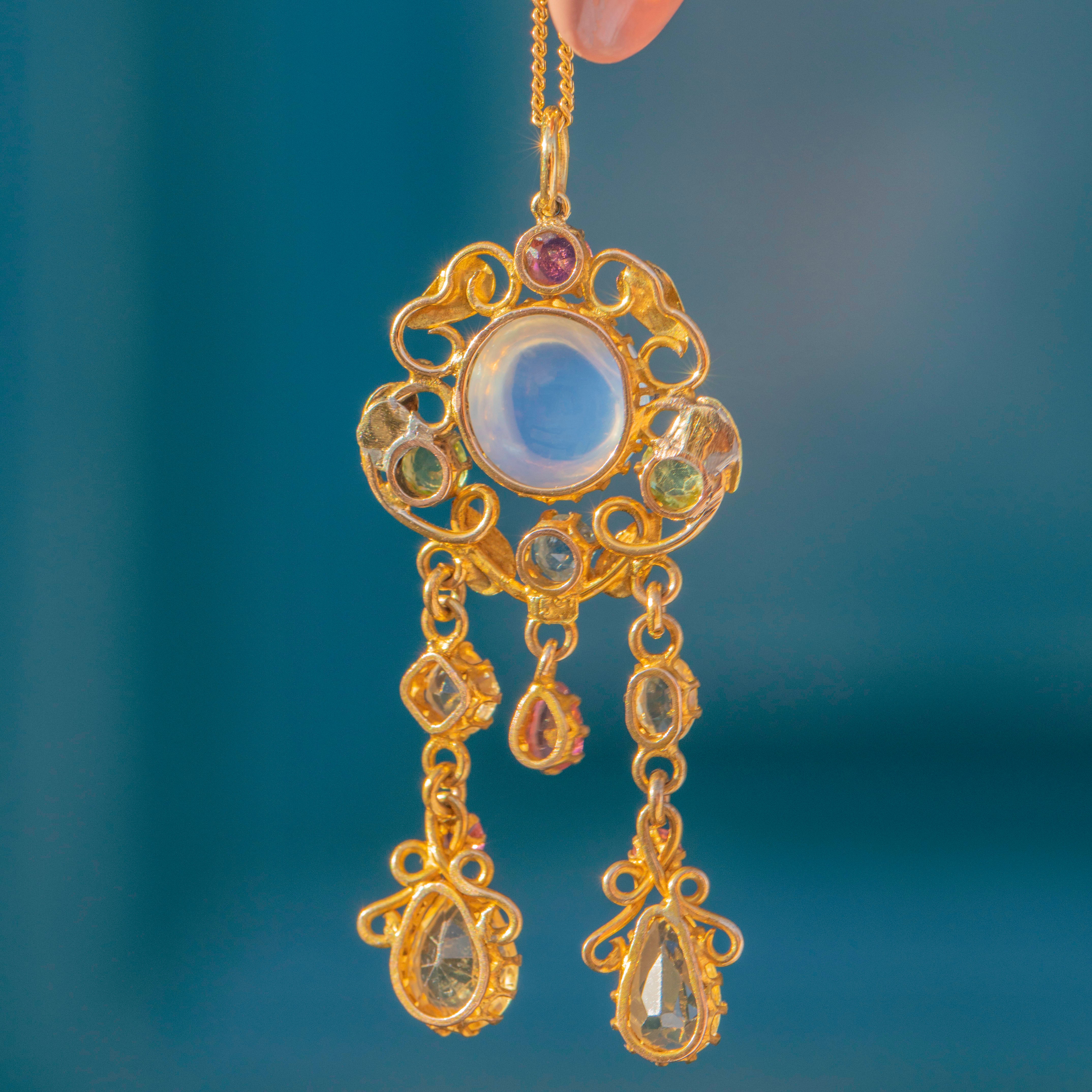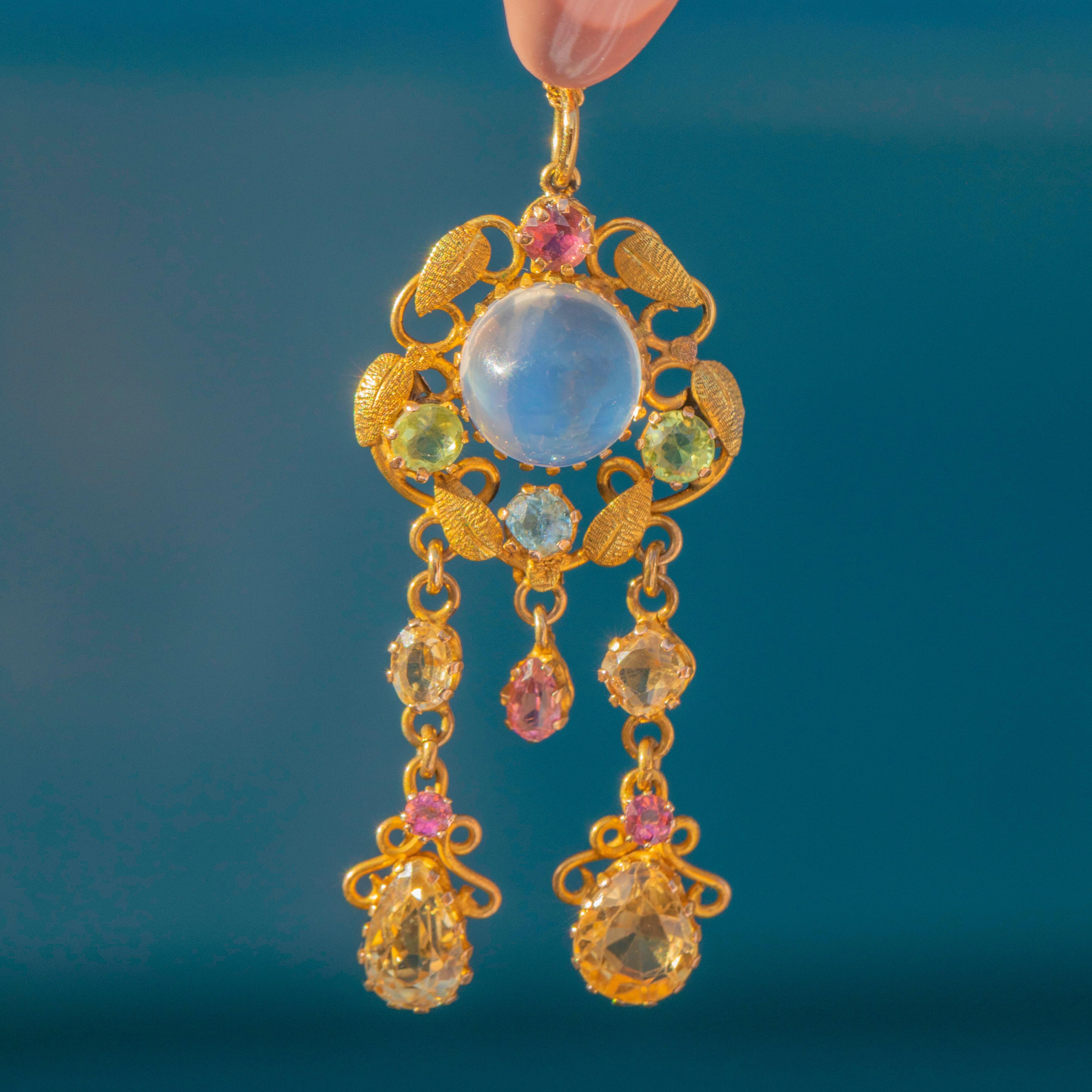 Antique 15ct Gold Moonstone Drop Pendant with Pink Tourmaline & Topaz