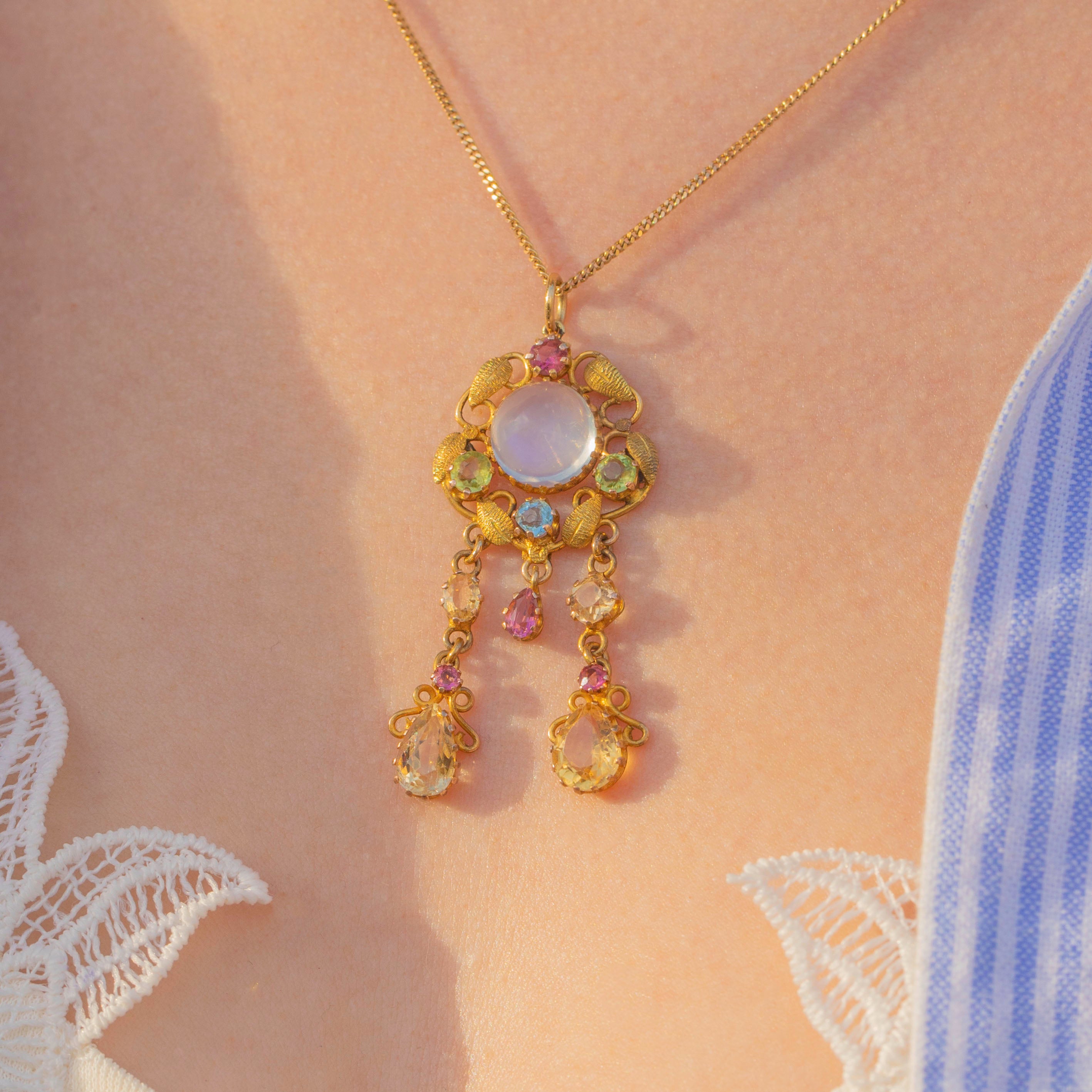 Crafted in buttery 15ct yellow Gold, this drop pendant showcases the elegance and sophistication of Victorian craftsmanship. Her captivating central Moonstone billows an ethereal, milky shimmer, and is wonderfully complimented by her accenting pastel Peridot and Aquamarine.