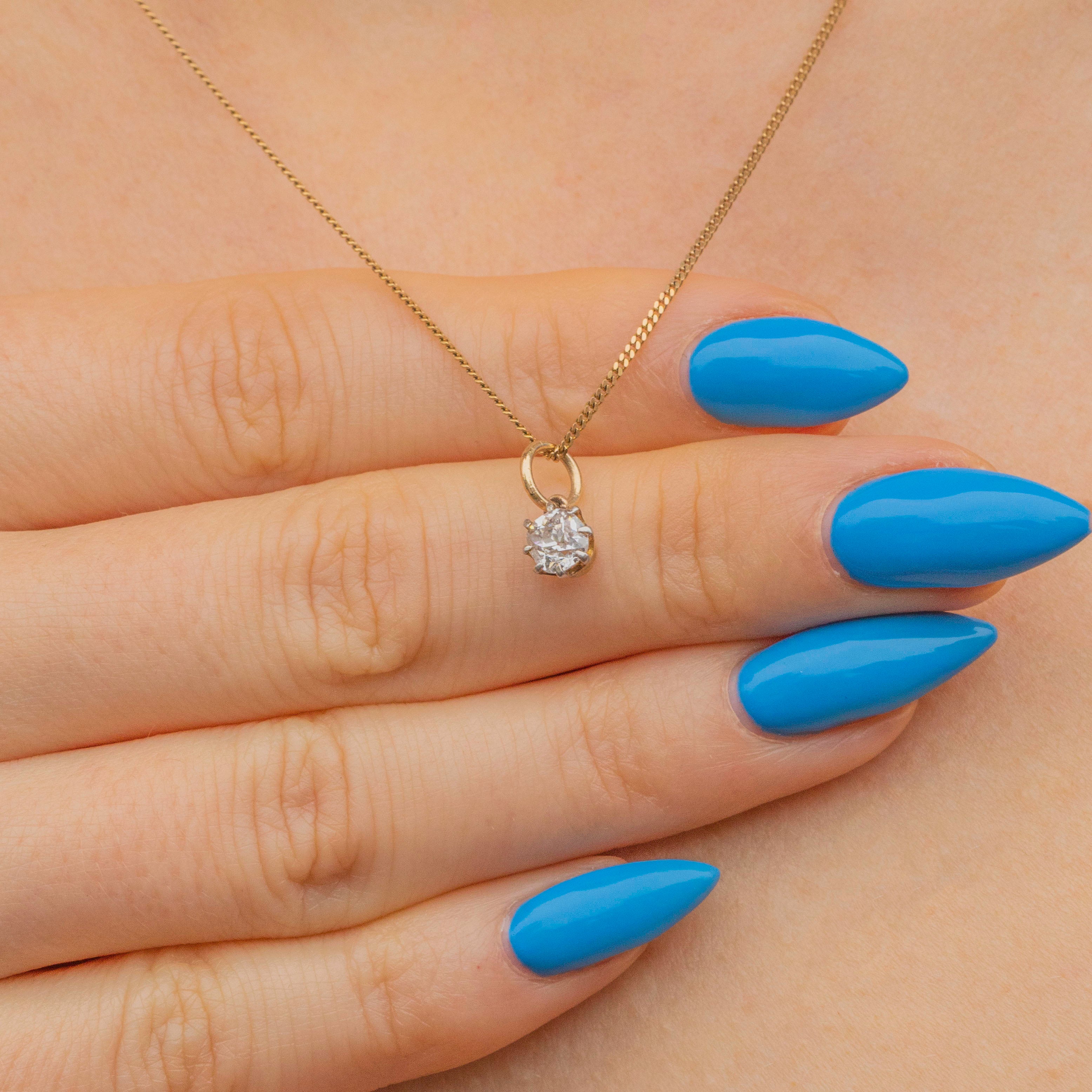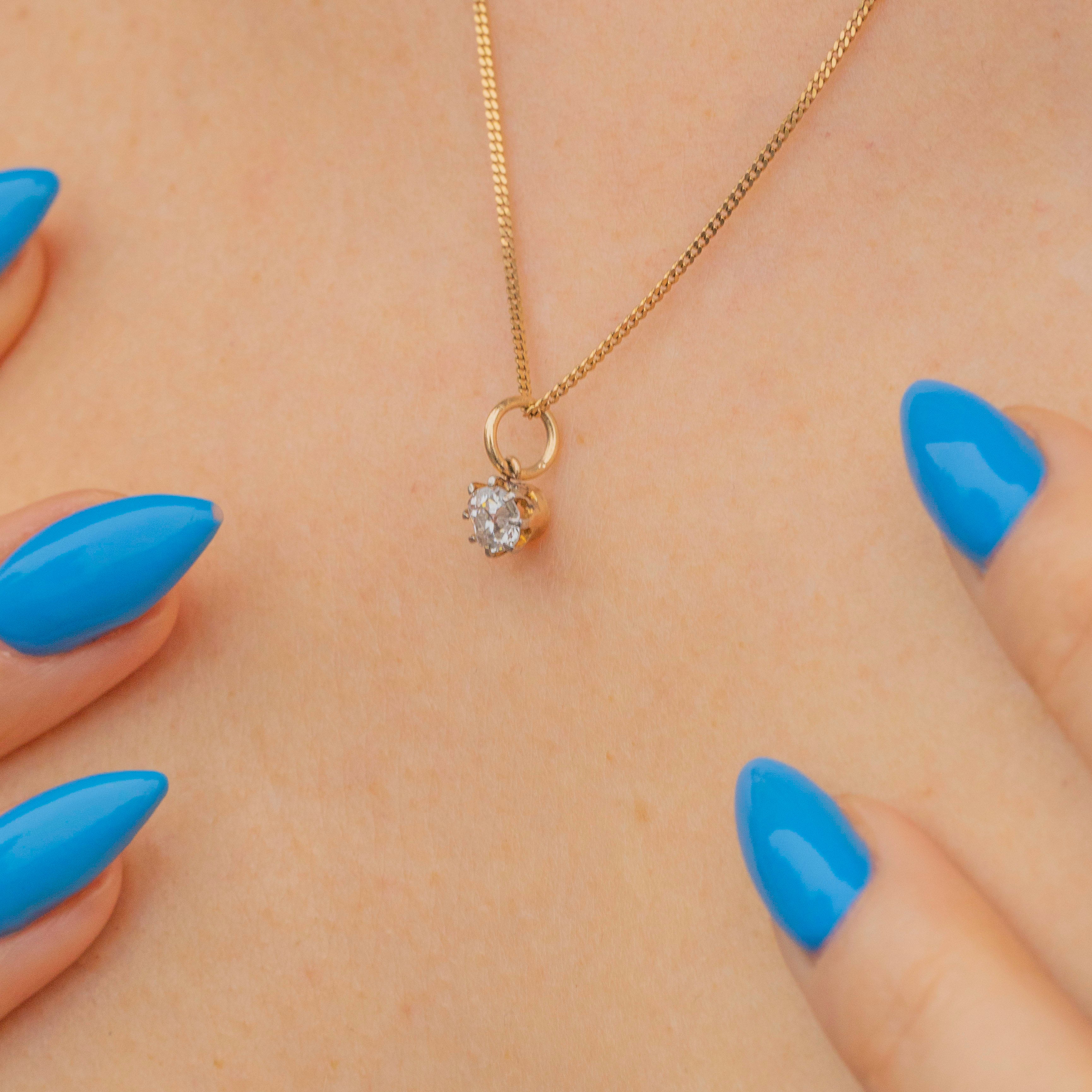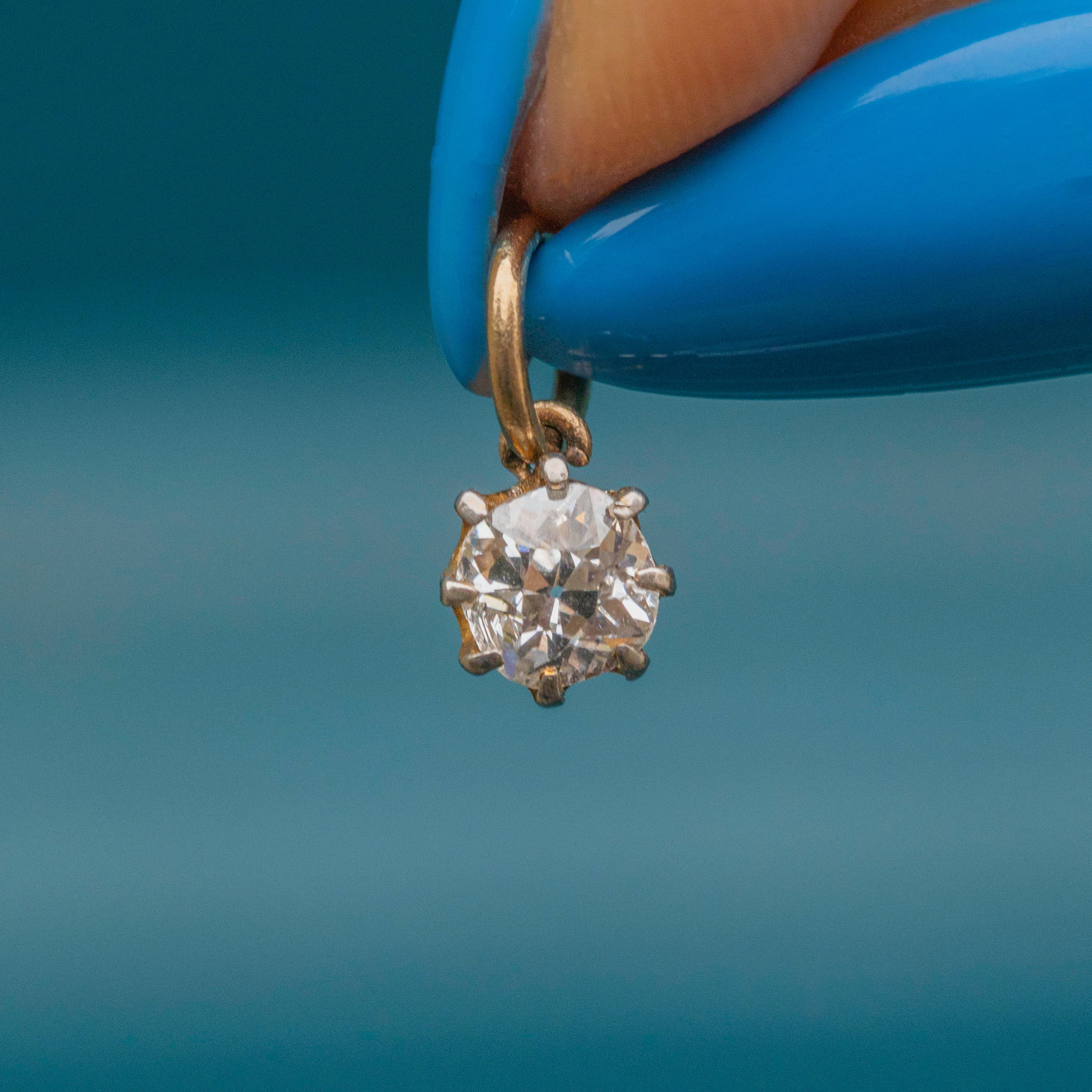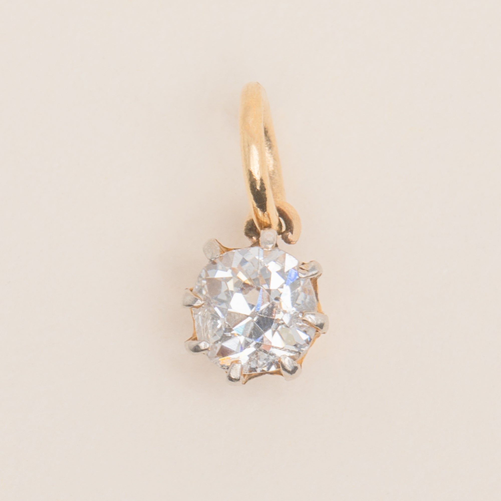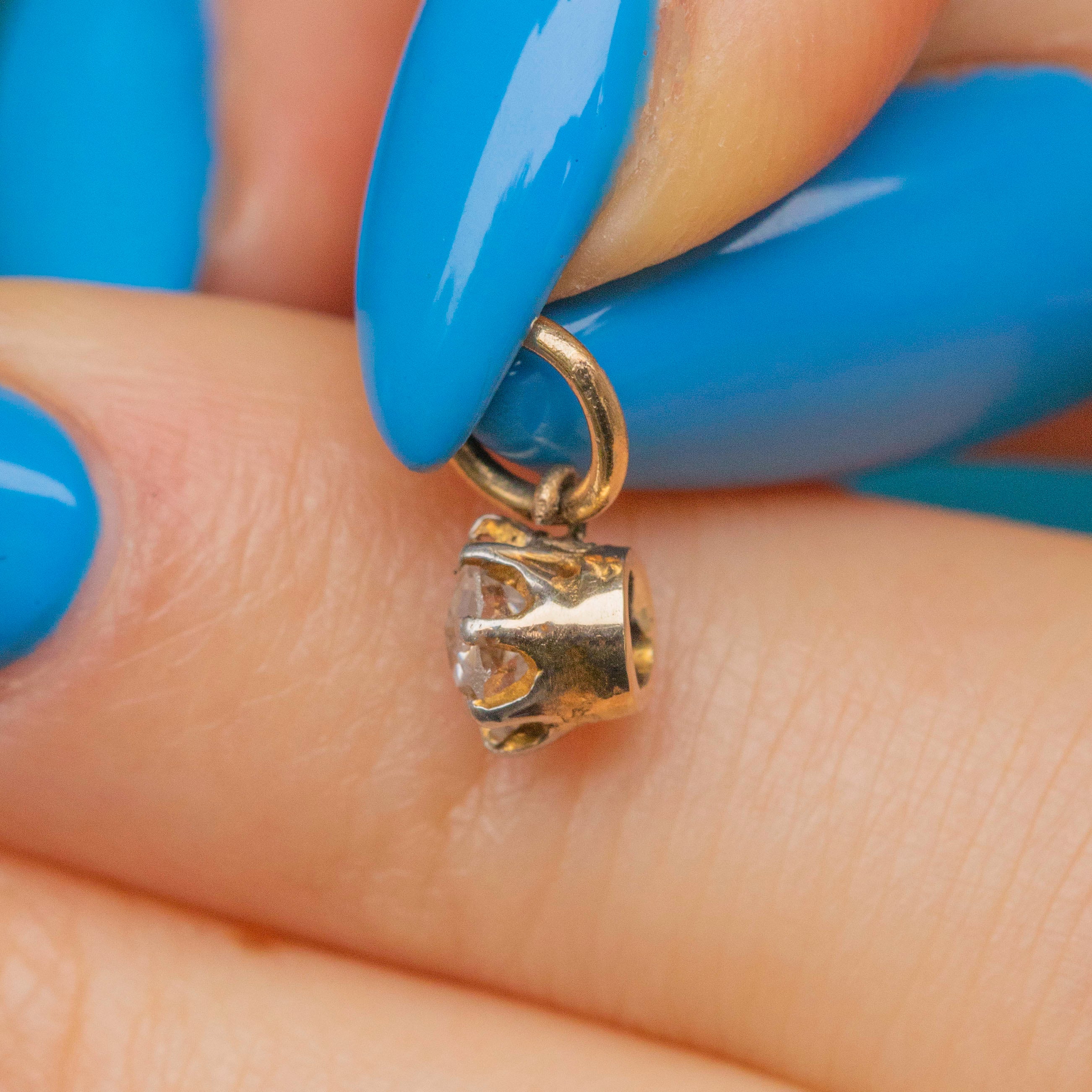 VERY GOOD-EXCELLENT. This antique 15ct Gold old-mine-cut Diamond charm is in wonderful condition. The Diamond is crisp and bright, securely held within its setting. The Diamond does have a small scuff on its surface, however, this is minuscule and only visible under the inspection of a loupe and doesn't affect the overall impact of the piece. The jump ring is soldered shut allowing for confident wear. A truly versatile and chic charm, you'll want to wear this pendant every day!