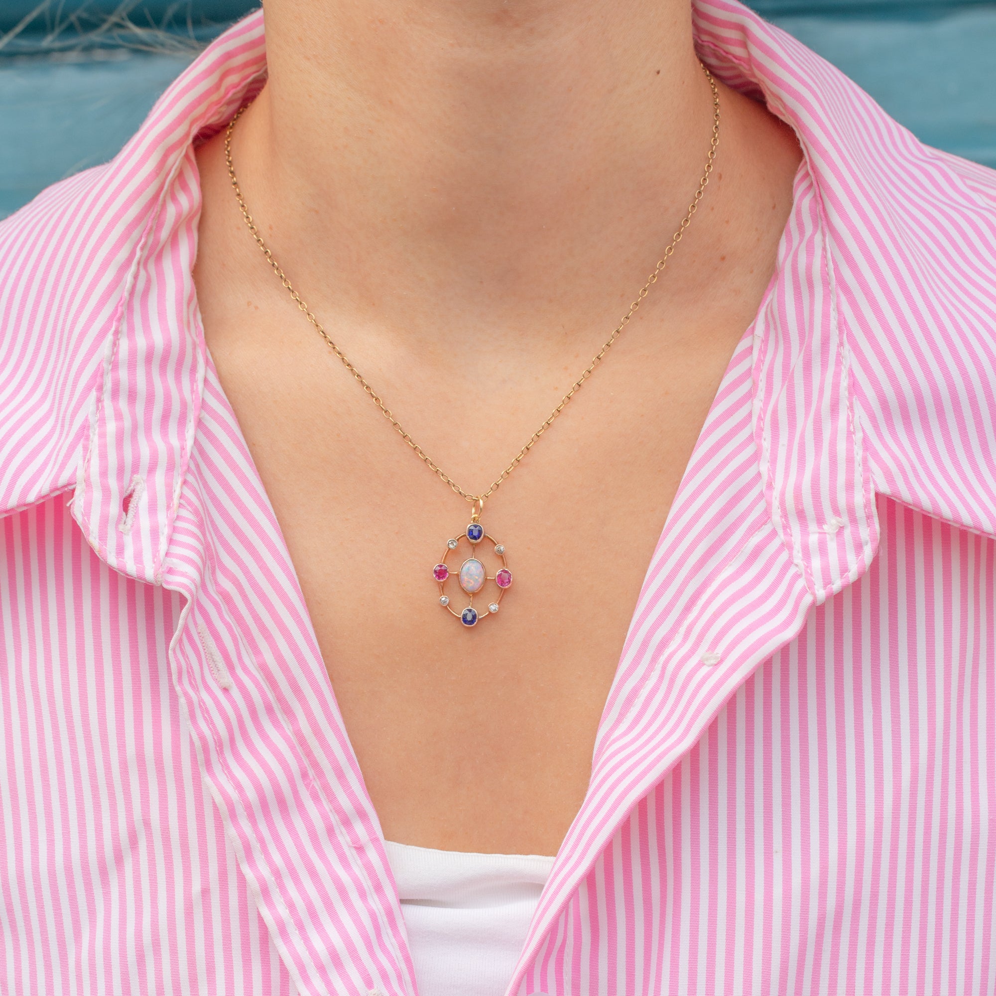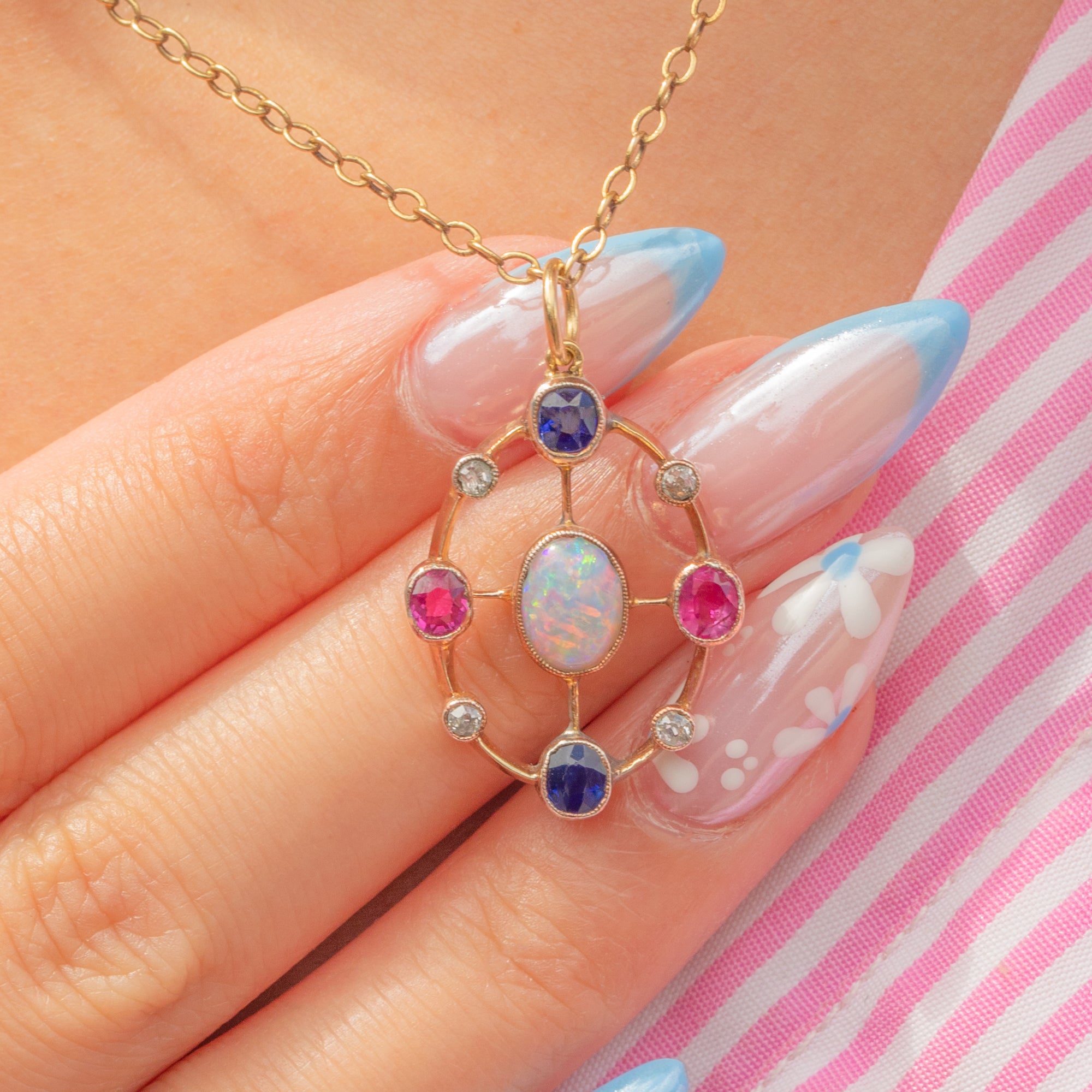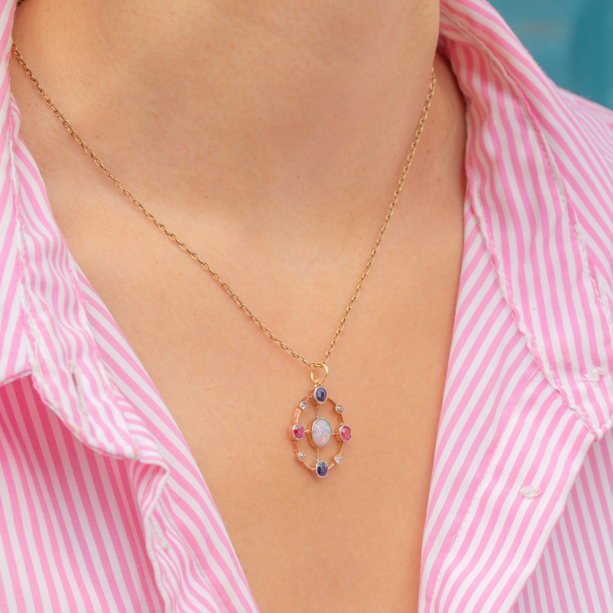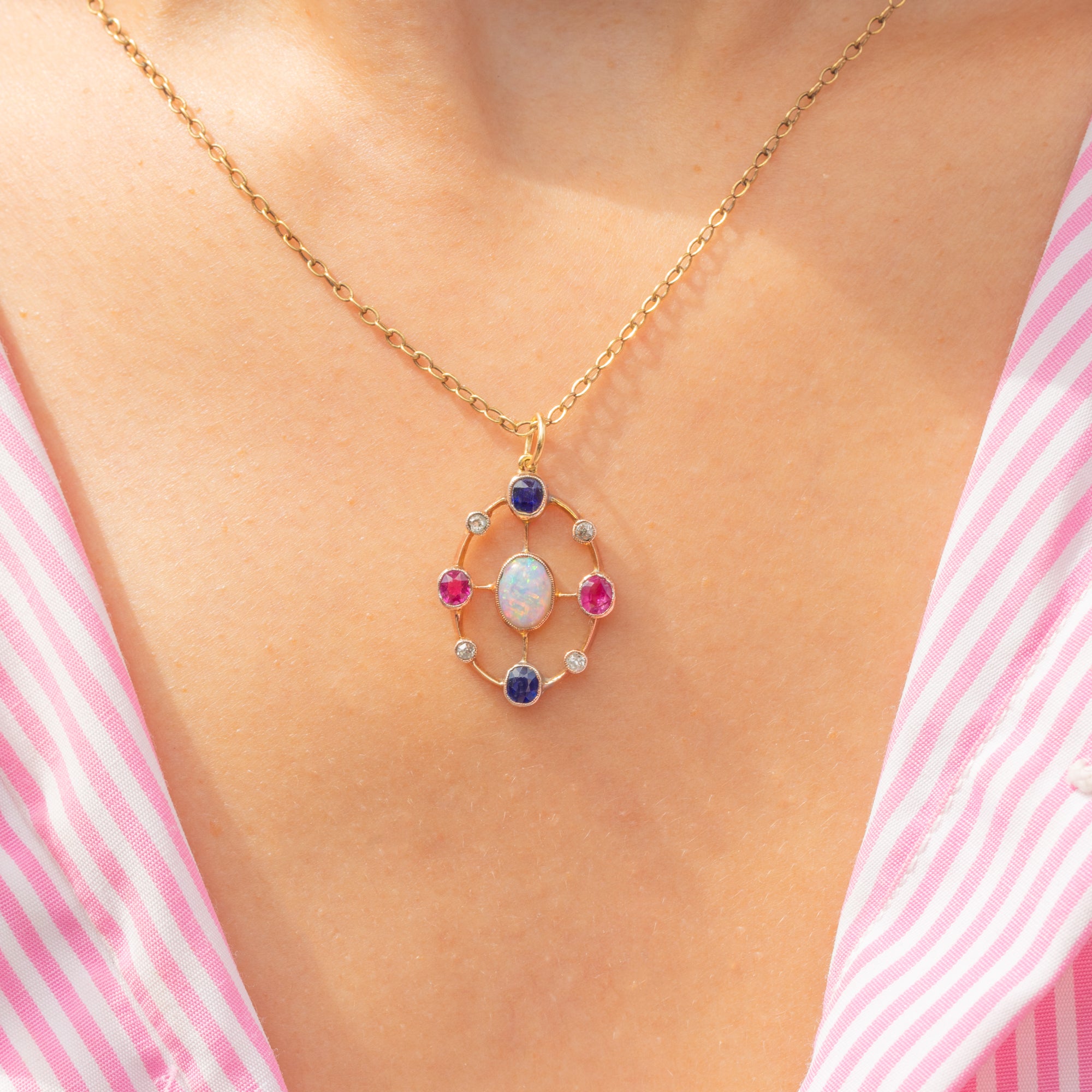 Circling the Opal is a magnificent halo of gems, with midnight blue Sapphires contrasted by bright fuchsia Rubies and dainty scintillating Diamonds, combining to create a vivacious adornment for a skinny Gold chain!