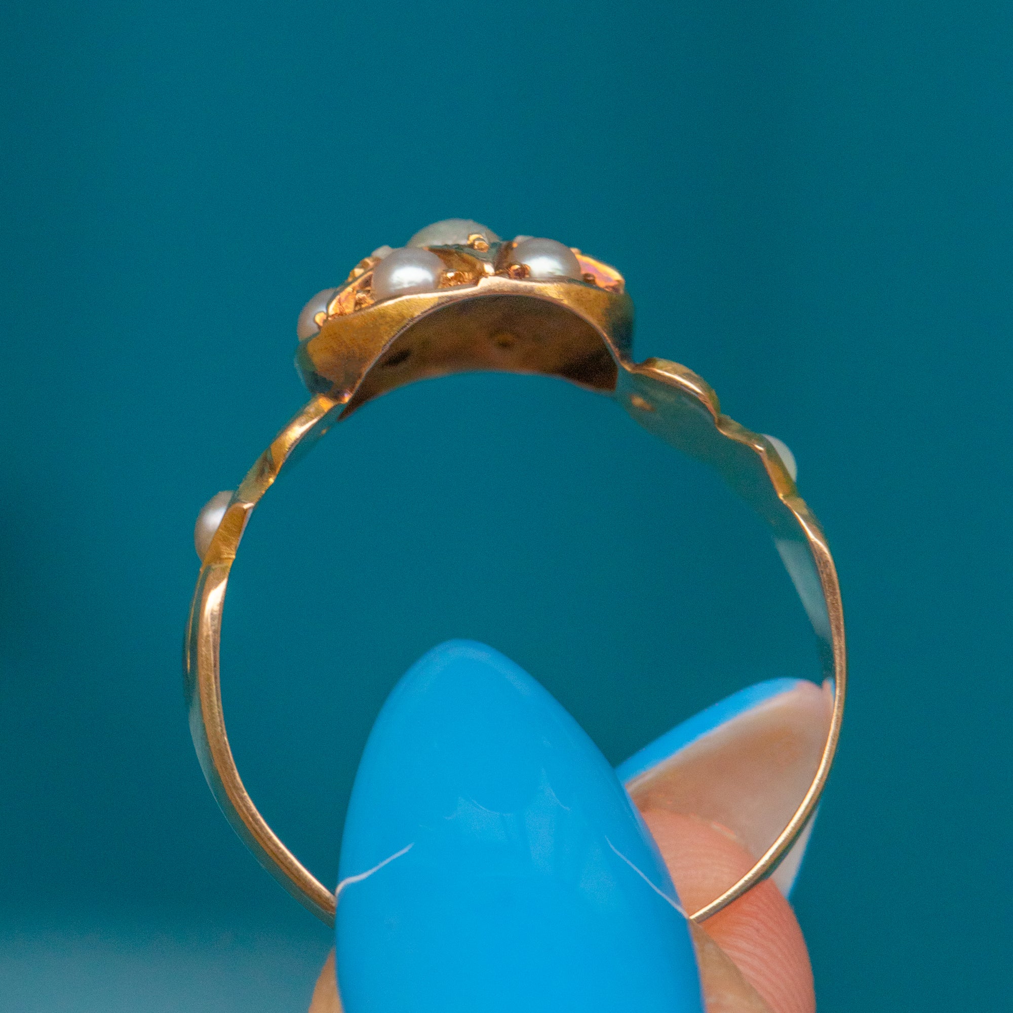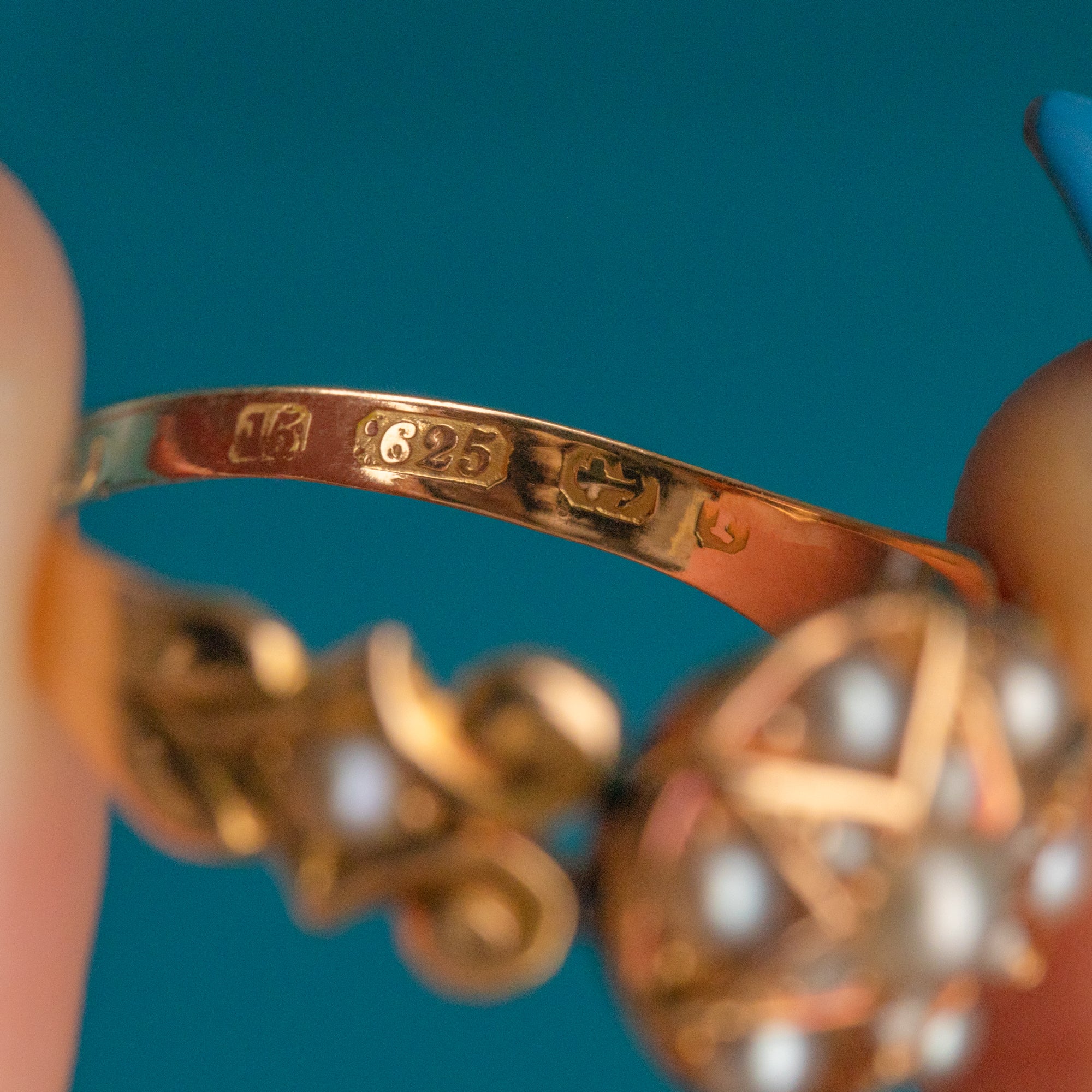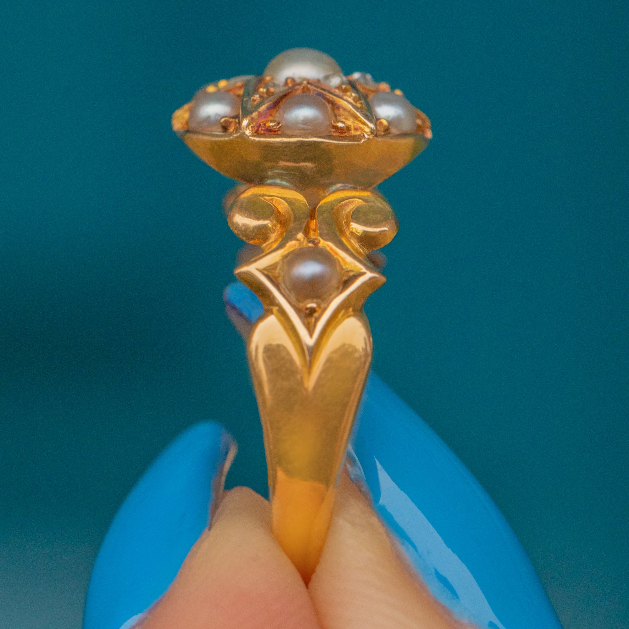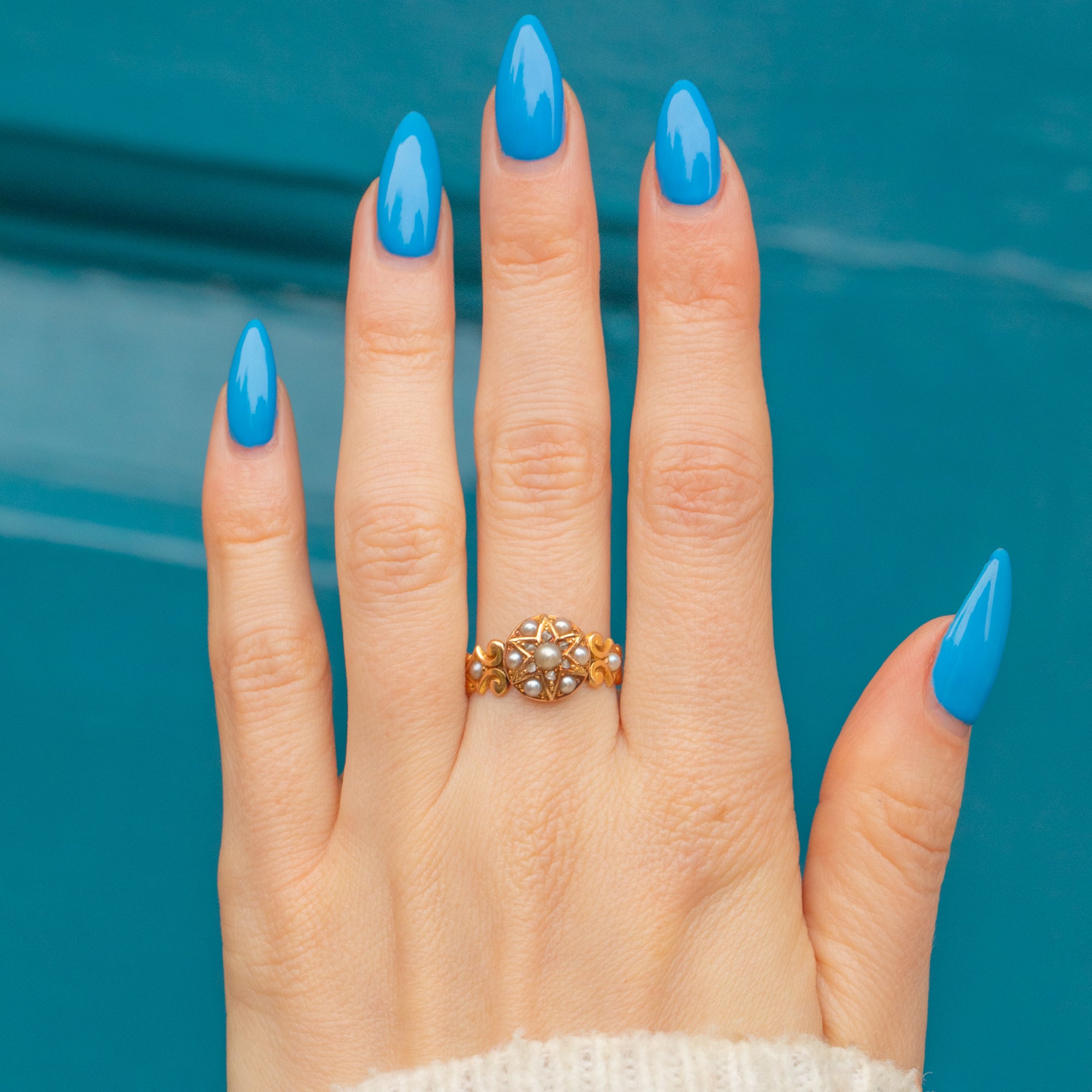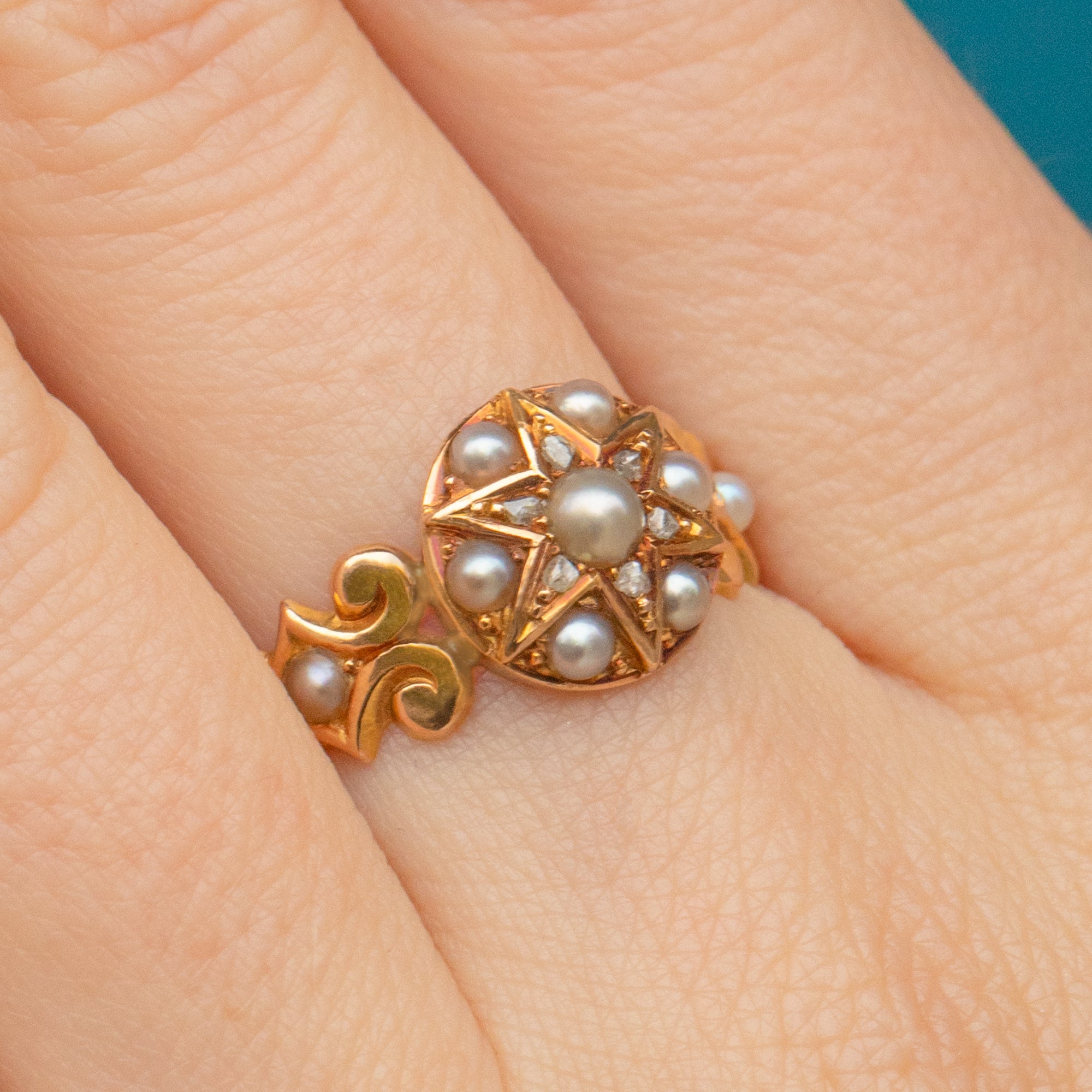 If you have a penchant for unique pieces of Victorian jewellery, this antique 15ct Gold Pearl Diamond star cluster ring is a must-have addition to your collection! Exquisitely crafted from rare 15ct Gold and studded with shimmering Pearls and subtly twinkling Diamonds, this Victorian ring is a feast for the eyes and will enchant you with its undeniable celestial charm!