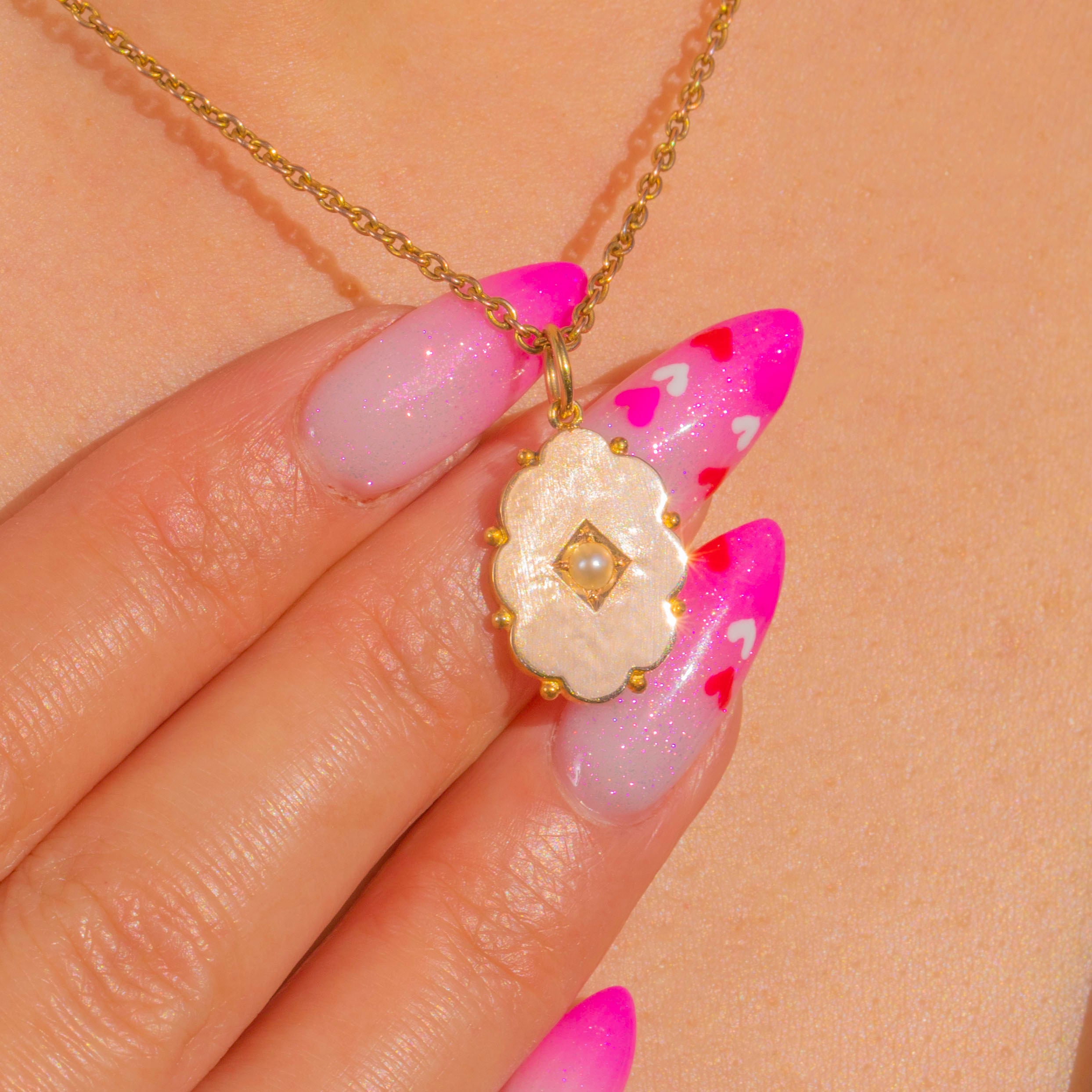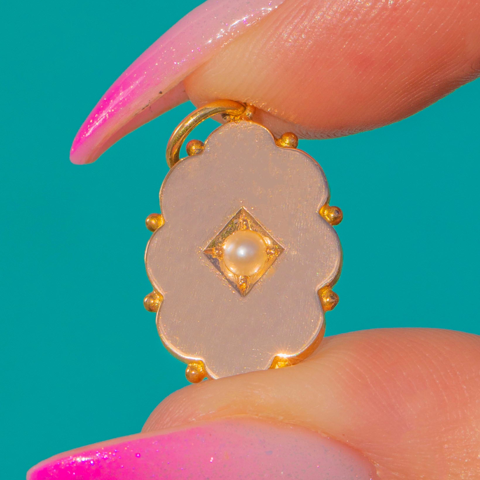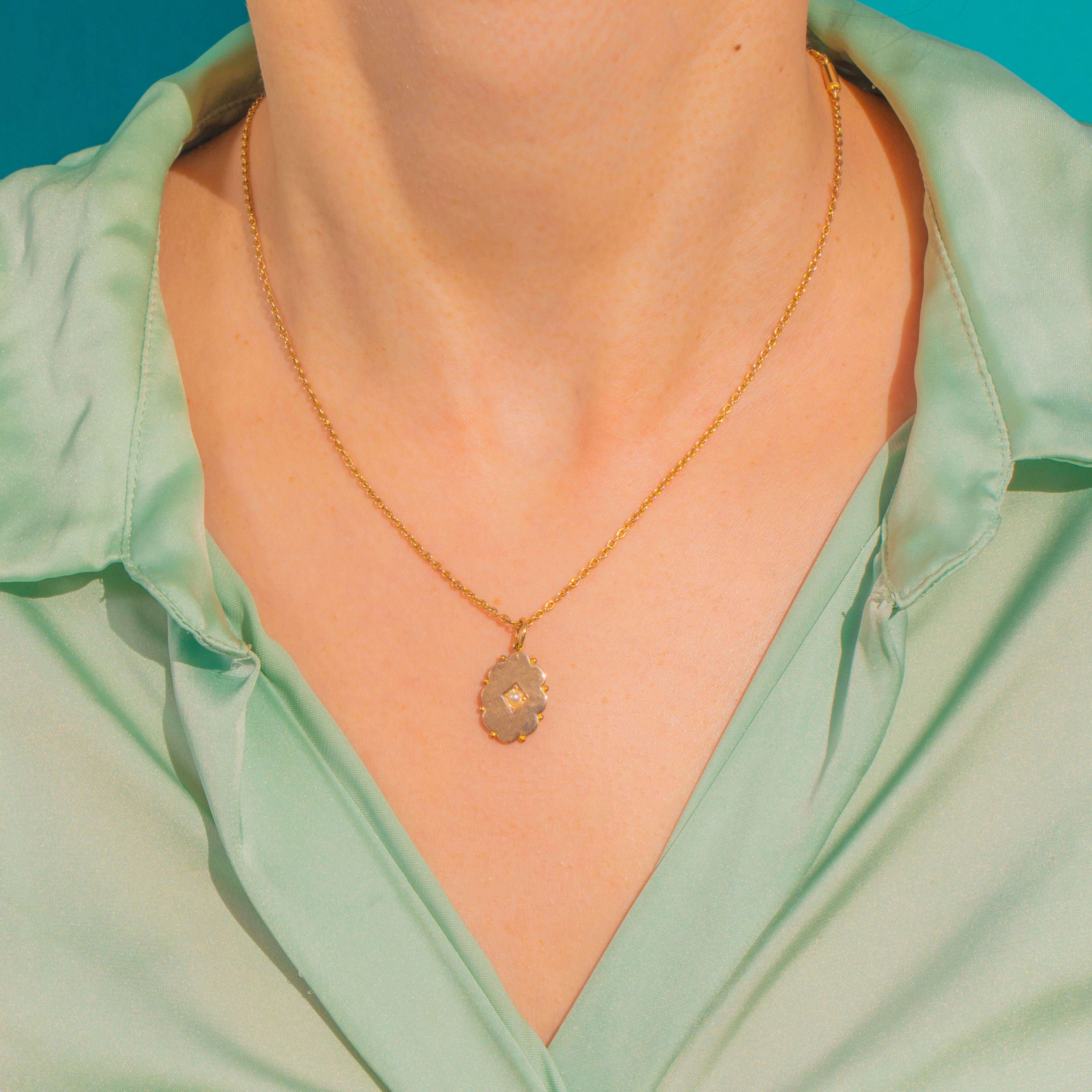 Petite and poetic in rich 15ct Gold, this Victorian pendant charms with its scalloped cartouche and delicate granulated accents. At the centre sits a creamy Pearl set within a square, a timeless touch that glows softly against the warm Gold.
