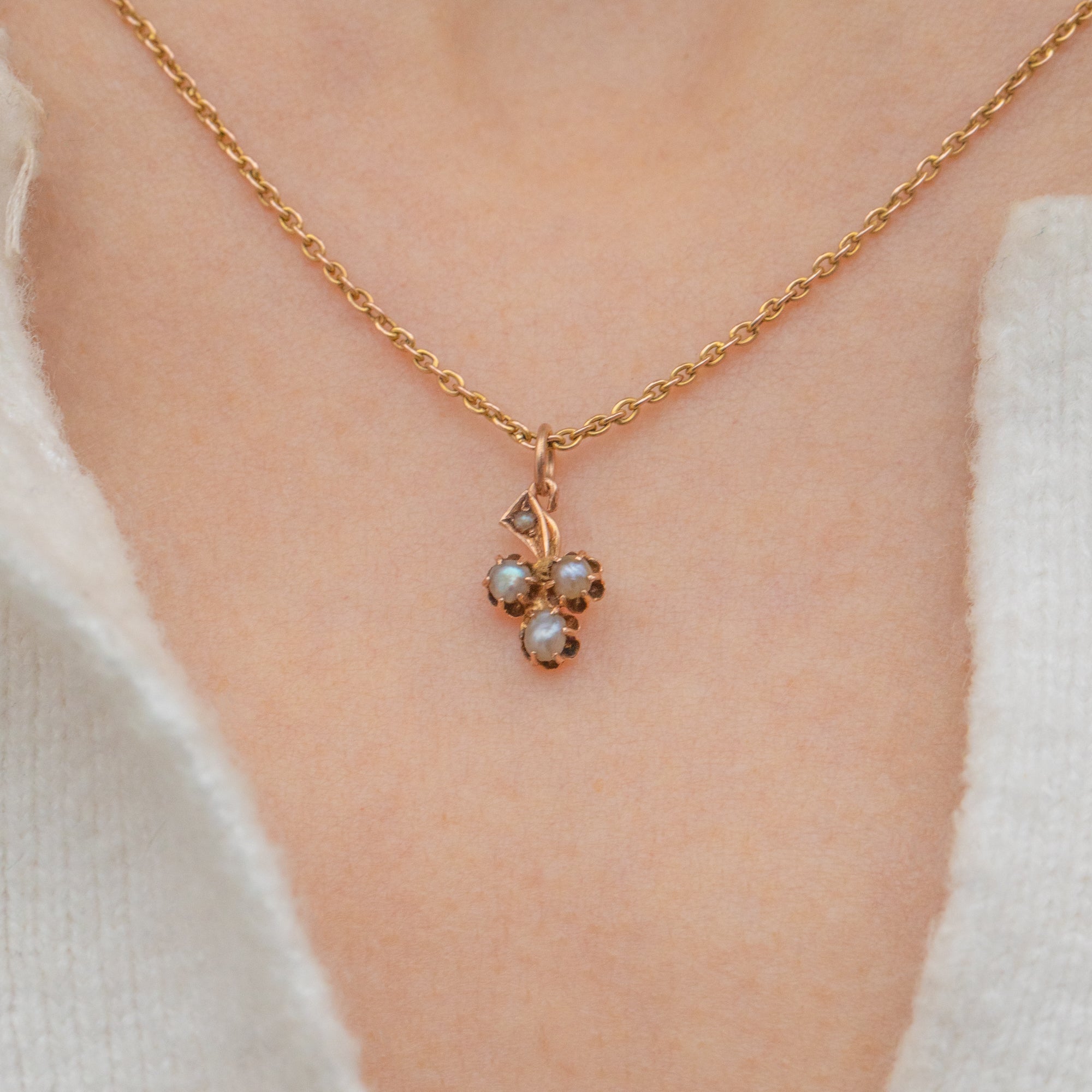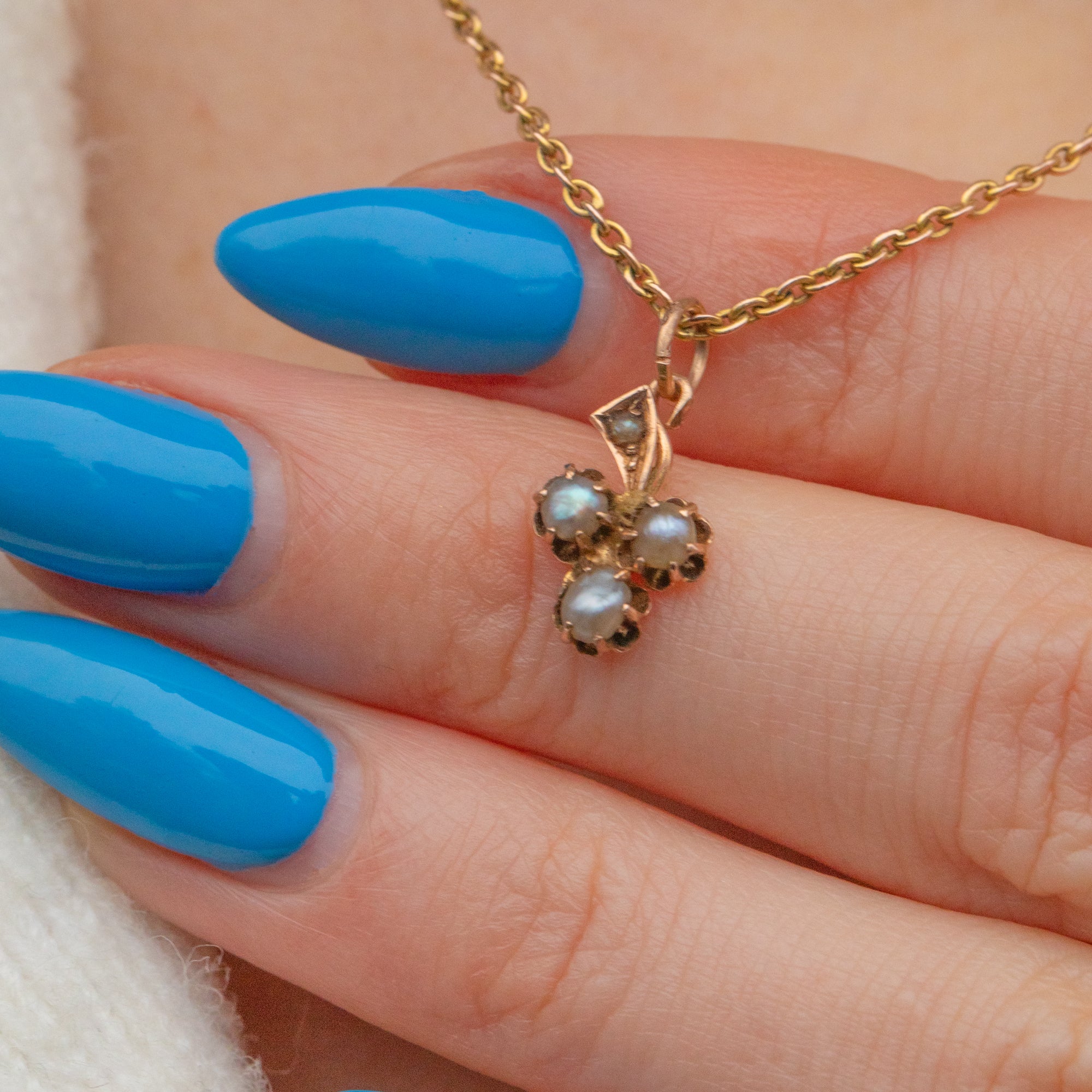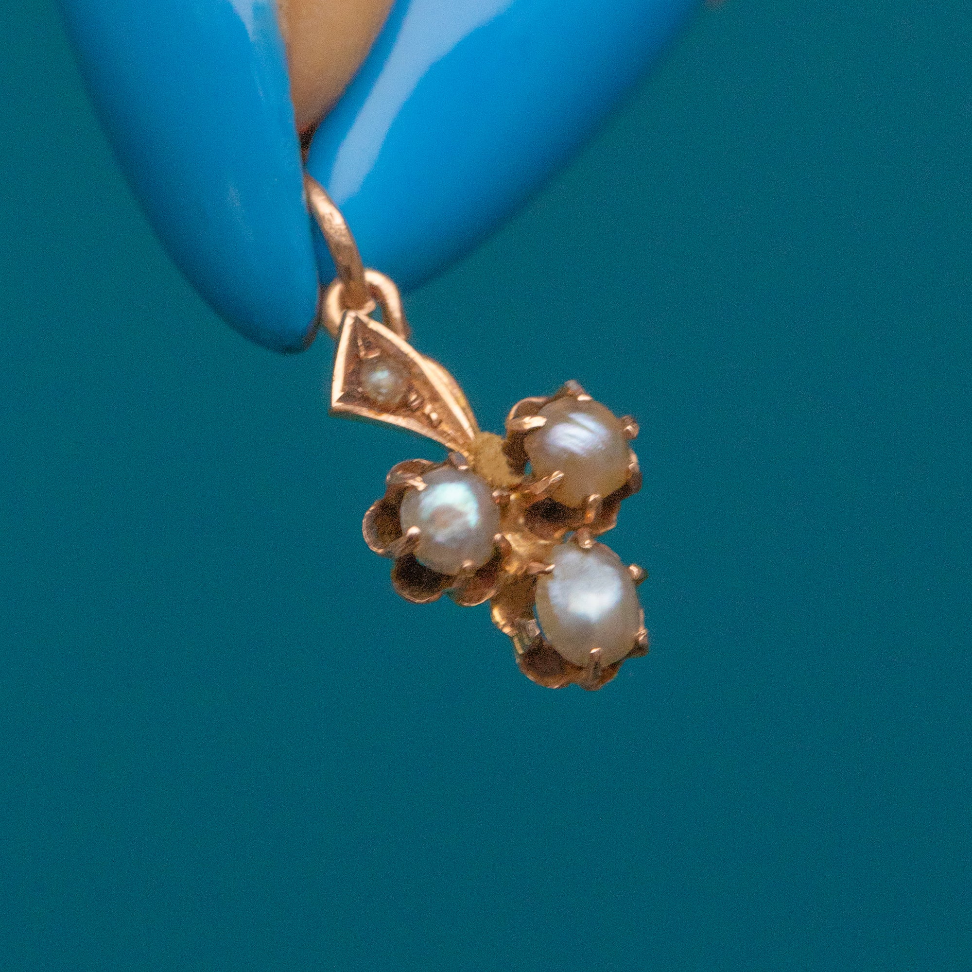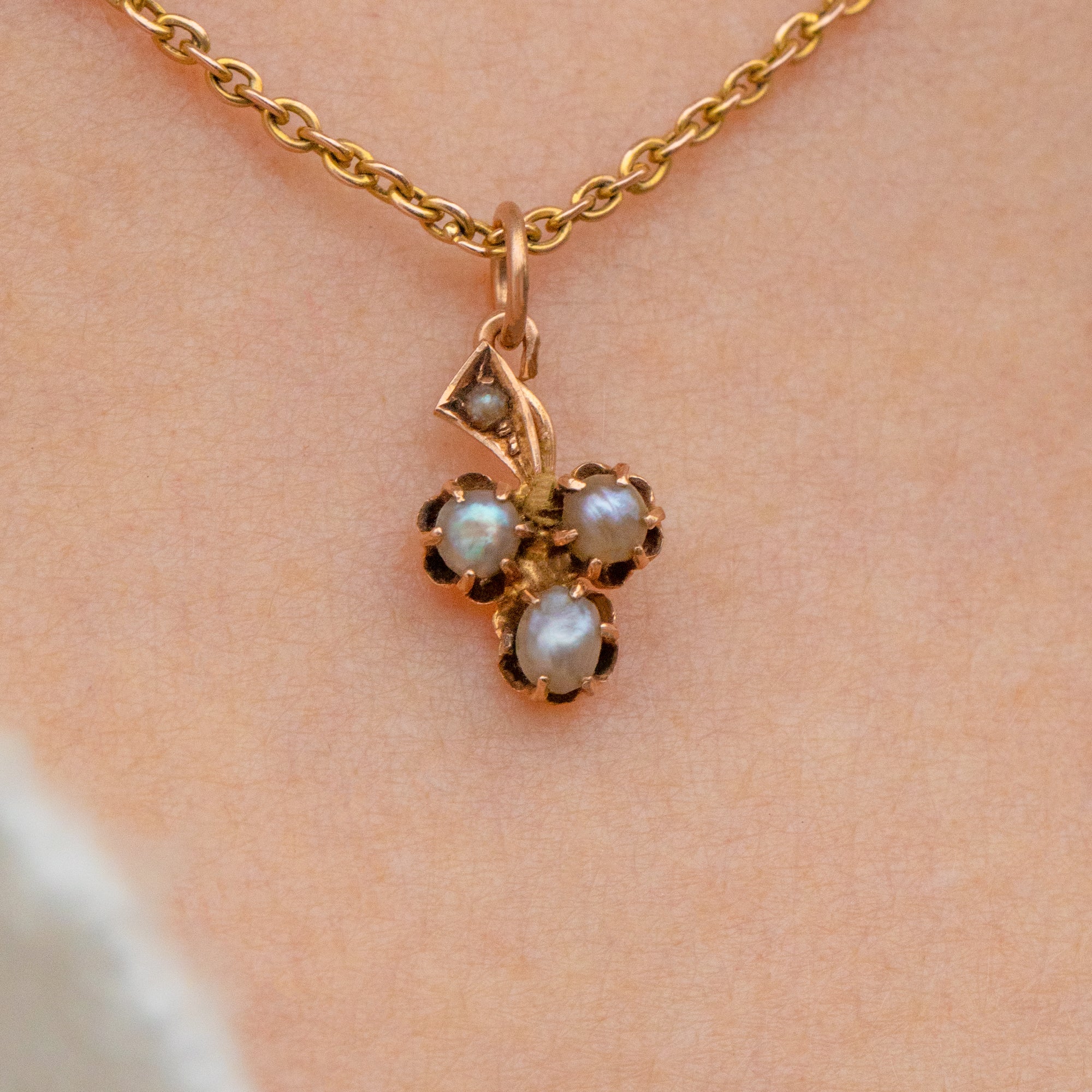 EXCELLENT. This antique 15ct Gold Pearl shamrock charm is in excellent condition. The Pearls are lustrous with. no visible surface wear, which is wonderful when considering her age. They are all set in a lovely delicate and sturdy 15ct Gold frame, allowing you to wear this Victorian Pearl pendant with confidence!