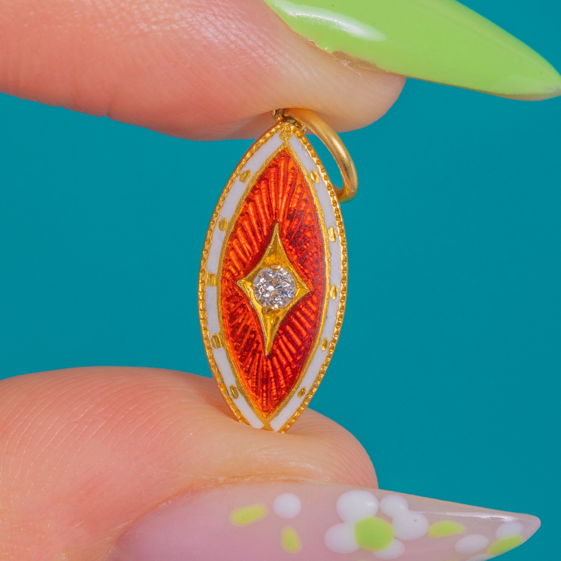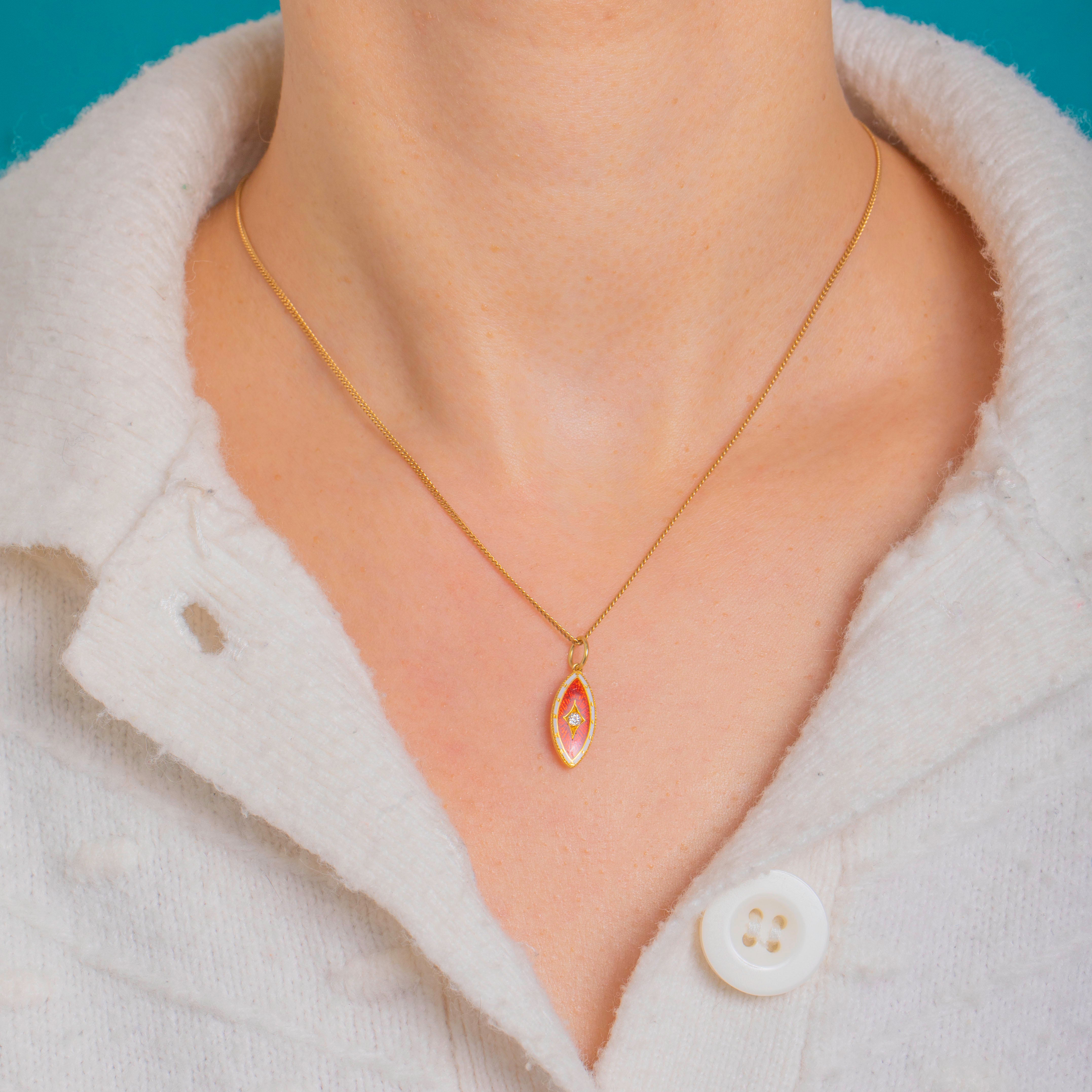A petite flourish of Edwardian elegance, this navette charm pairs luscious translucent red guilloché Enamel with a crisp white Enamel border, all framed by fine milgrain for a beautifully refined finish. At the centre sits a sparkling Diamond in a raised lozenge setting, adding a bright point of light to the radiant Enamel.