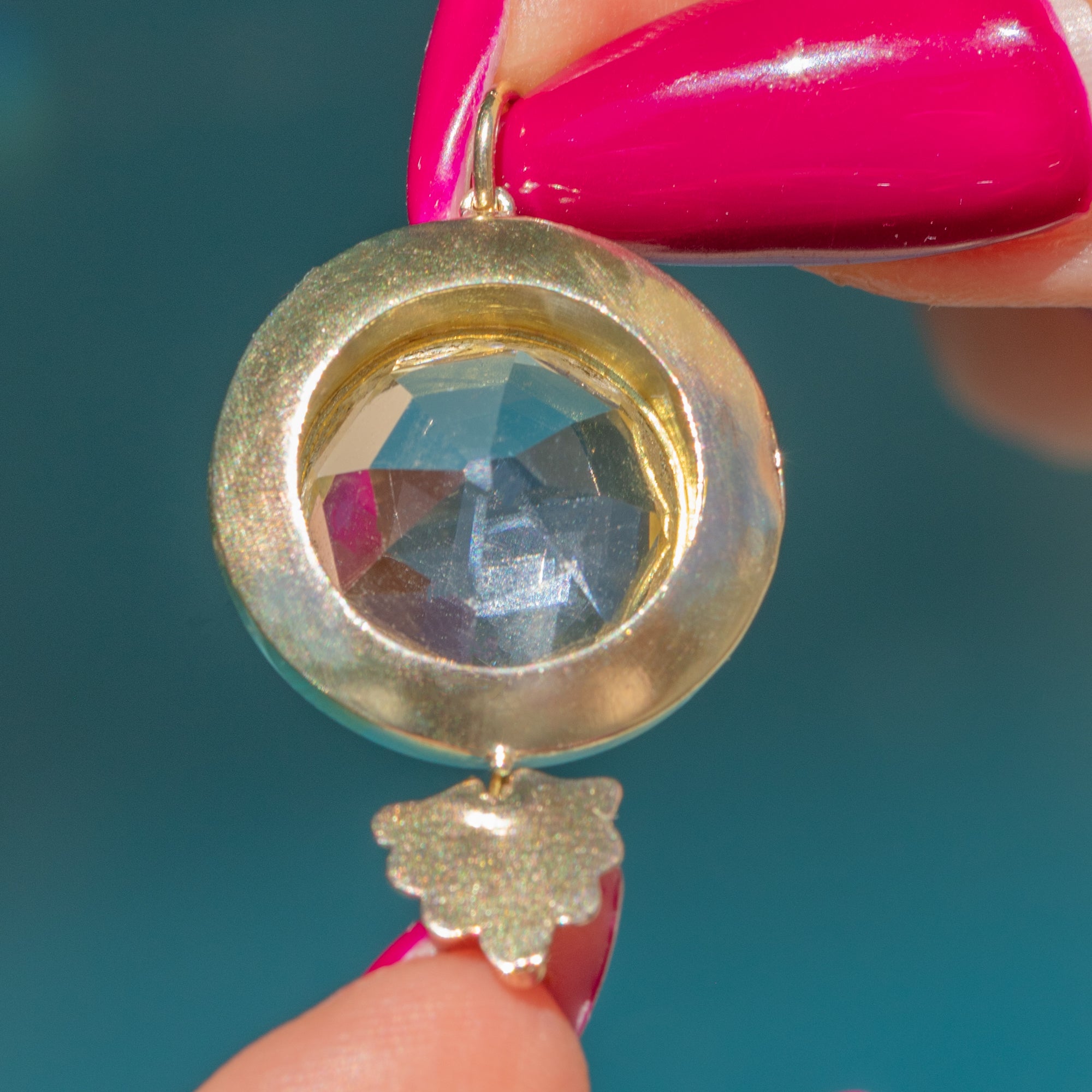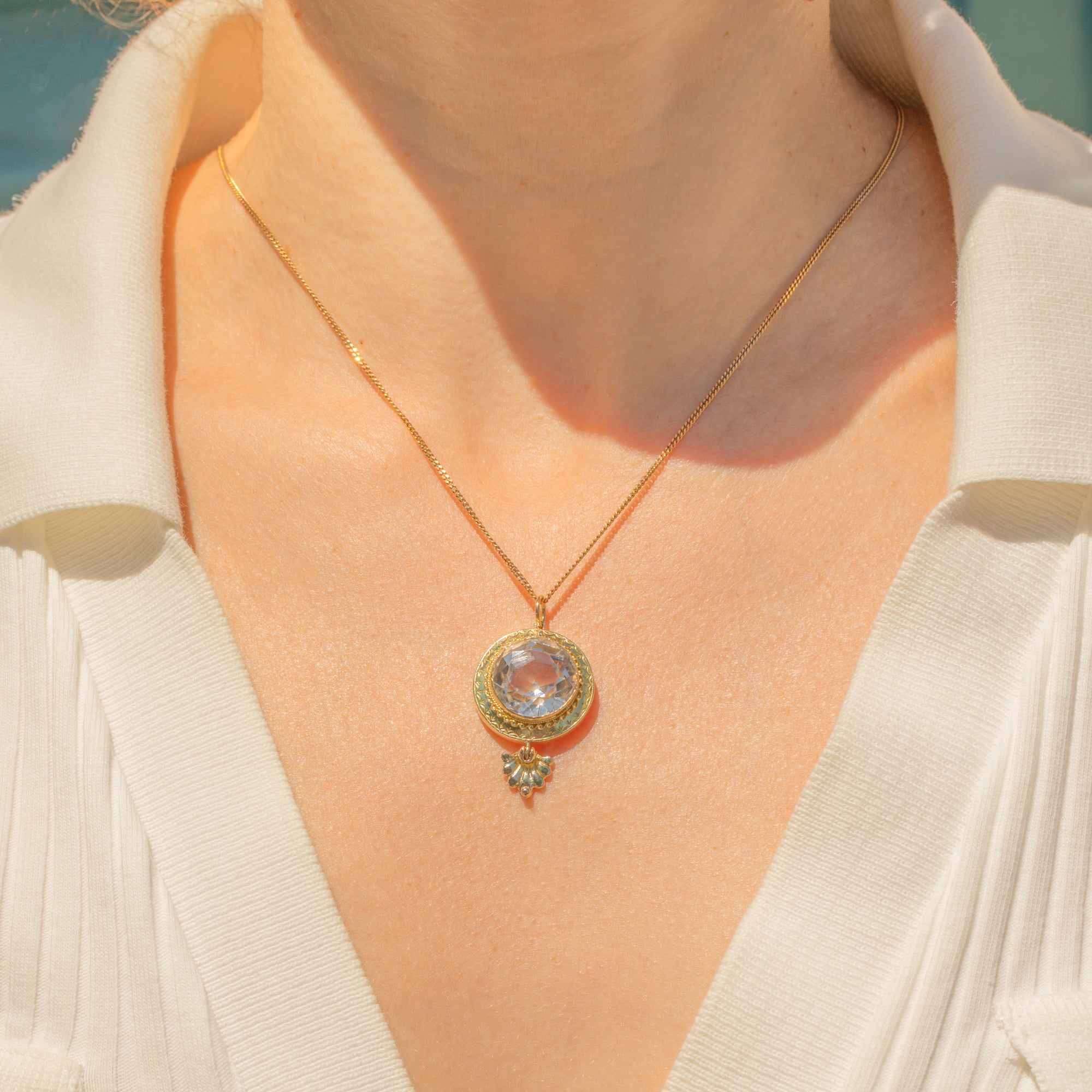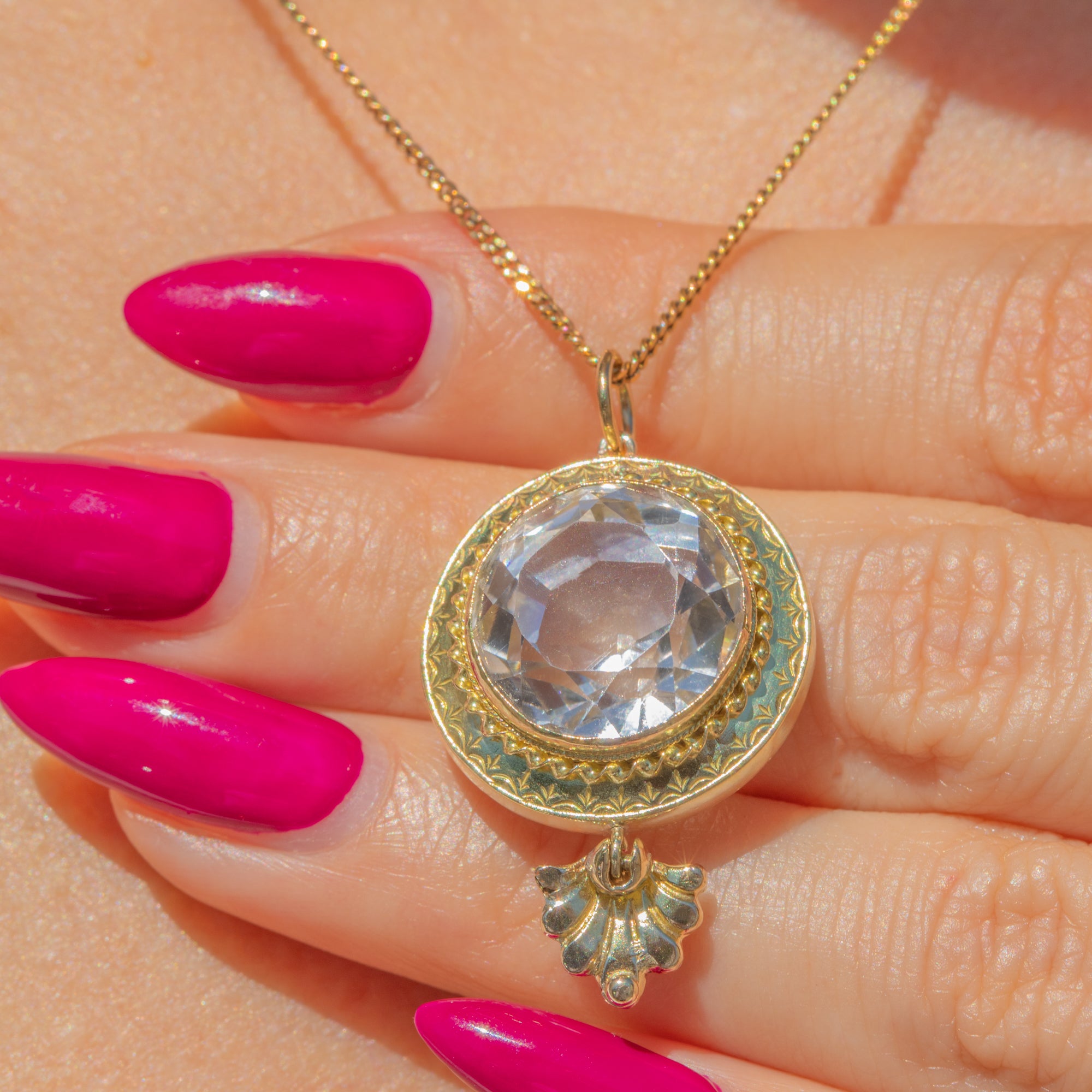 EXCELLENT: The Rock Crystal is securely set, with crisp facets and no chips or scuffs in sight! The glowing Gold has an even buttery hue throughout and all the details have remained defined. The back of the pendant is perfectly smooth, resting comfortably against the chest.