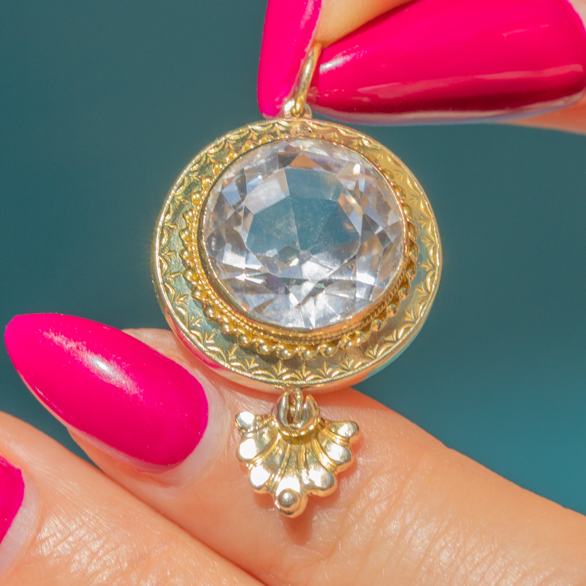 A striking example of the unique and regal designs to come from the Victorian era, this antique Rock Crystal pendant will be like no other in your collection! The Rock Crystal has been exquisitely faceted to catch the light from every angle and is displayed within rare and buttery 15ct Gold.