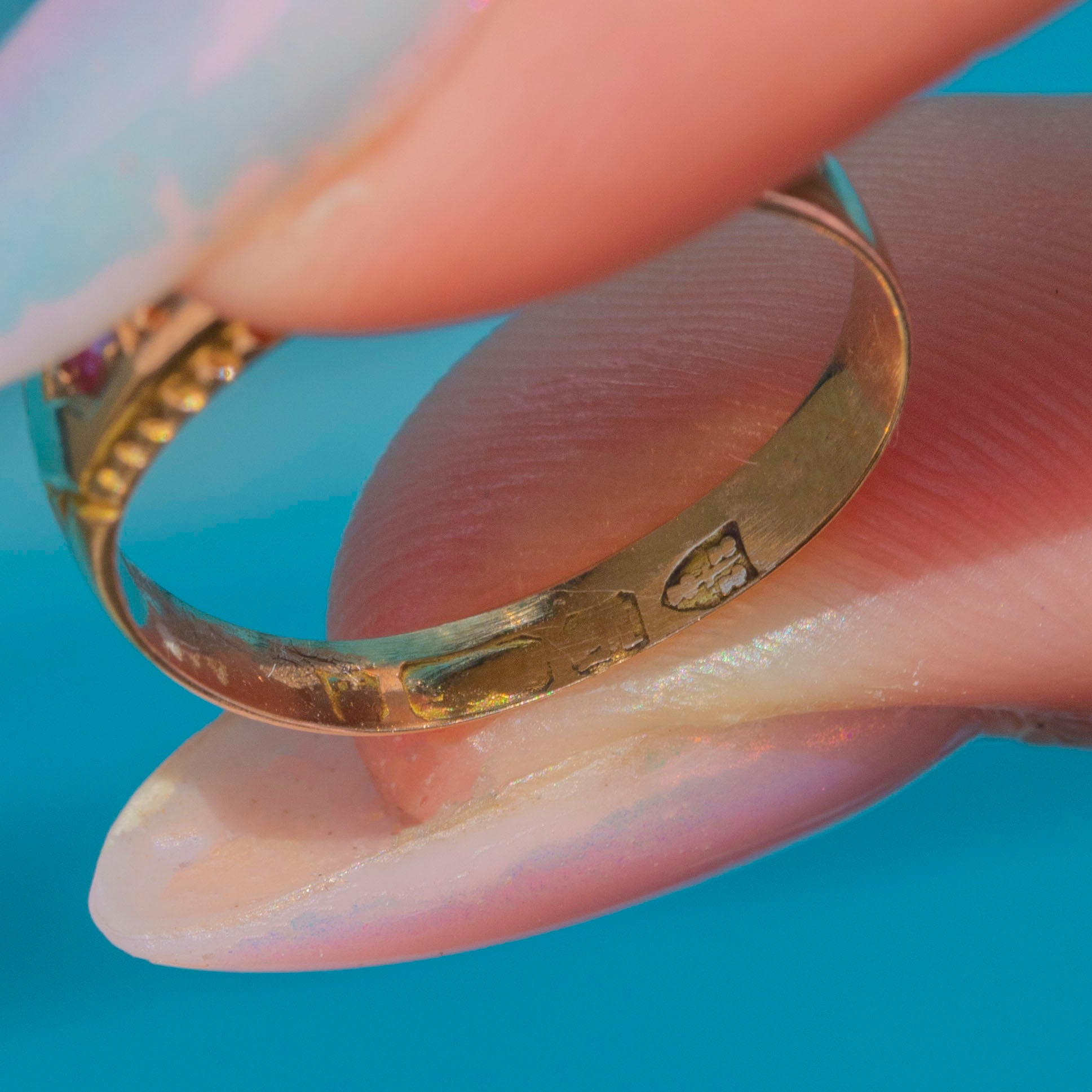 VERY GOOD: Each gemstone is secure within its setting with no damage to note. The Rubies have a wonderful, deep crimson hue and no chips or abrasions, while the rose-cut Diamonds are charmingly bright and lively. The ring band has maintained a great shape. On the back of the band, there is some variation to the Gold tone due to a previous resizing, which has resulted in the loss of some hallmarks; however, this cannot be seen when worn. This Ruby Diamond ring will make a gorgeous addition to your collection!