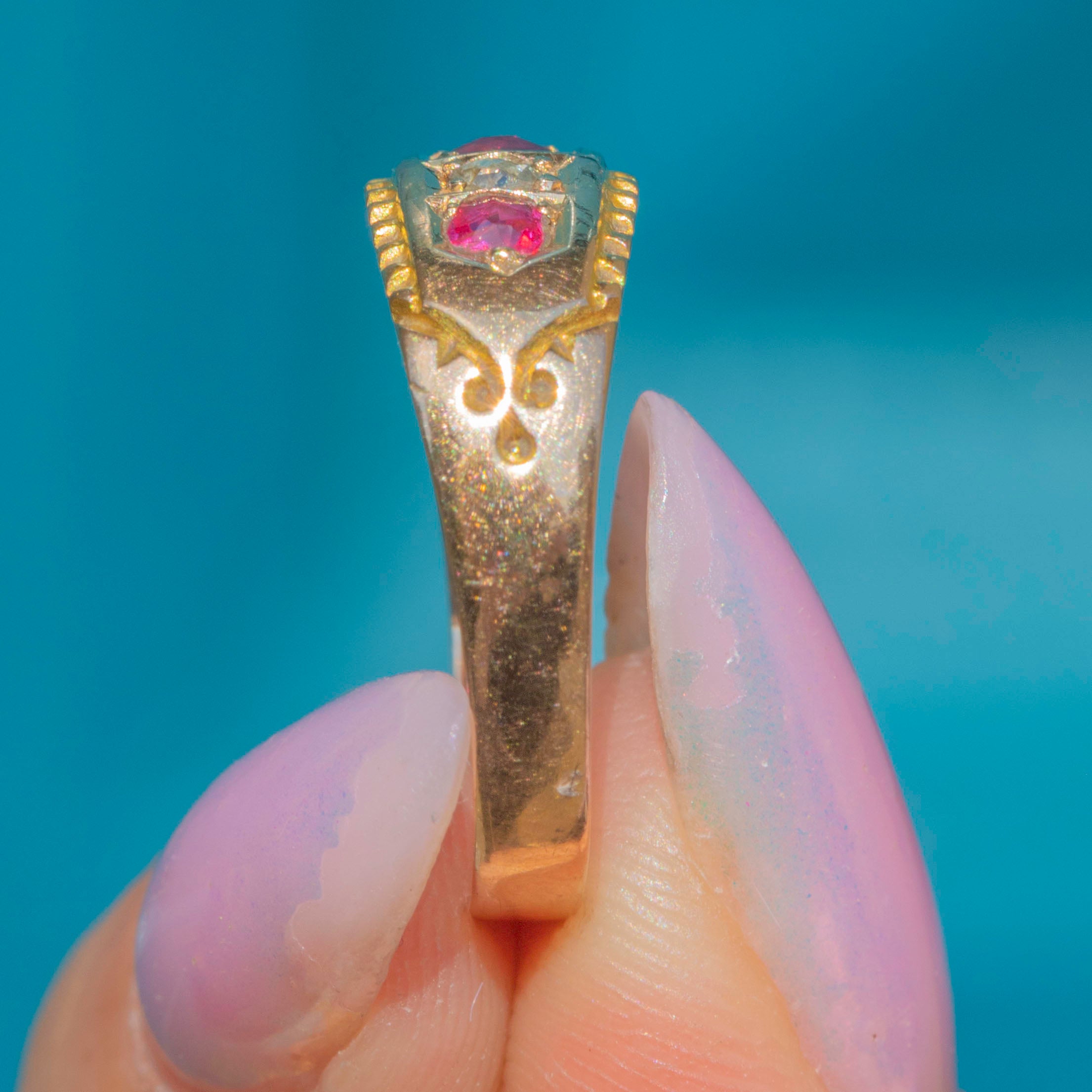 Prepare to feel opulent with this antique Ruby Diamond gypsy ring adorning your hand! The ring face is bursting with a myriad of sparkles, with vivid fuchsia flashes from her three Rubies, complemented by the icy sparkle from her rose-cut Diamonds, bringing bundles of character.