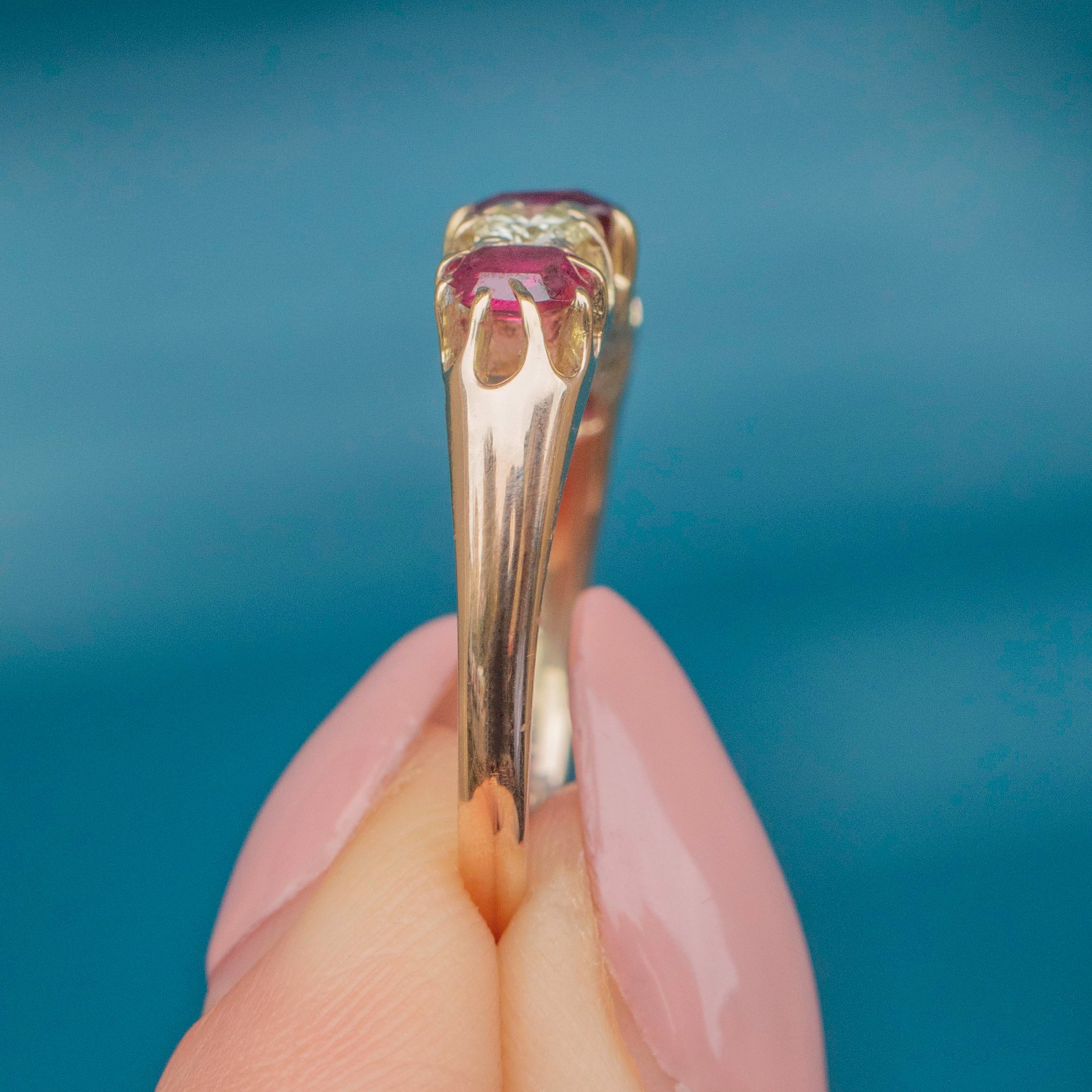 EXCELLENT. This antique 15ct Gold Ruby Diamond five stone ring is in fabulous condition throughout. The 15ct Gold band feels substantial and sturdy, and all of the gemstones are secure in their settings. The Diamonds and Rubies are exceptionally bright and twinkling - a visionary piece!