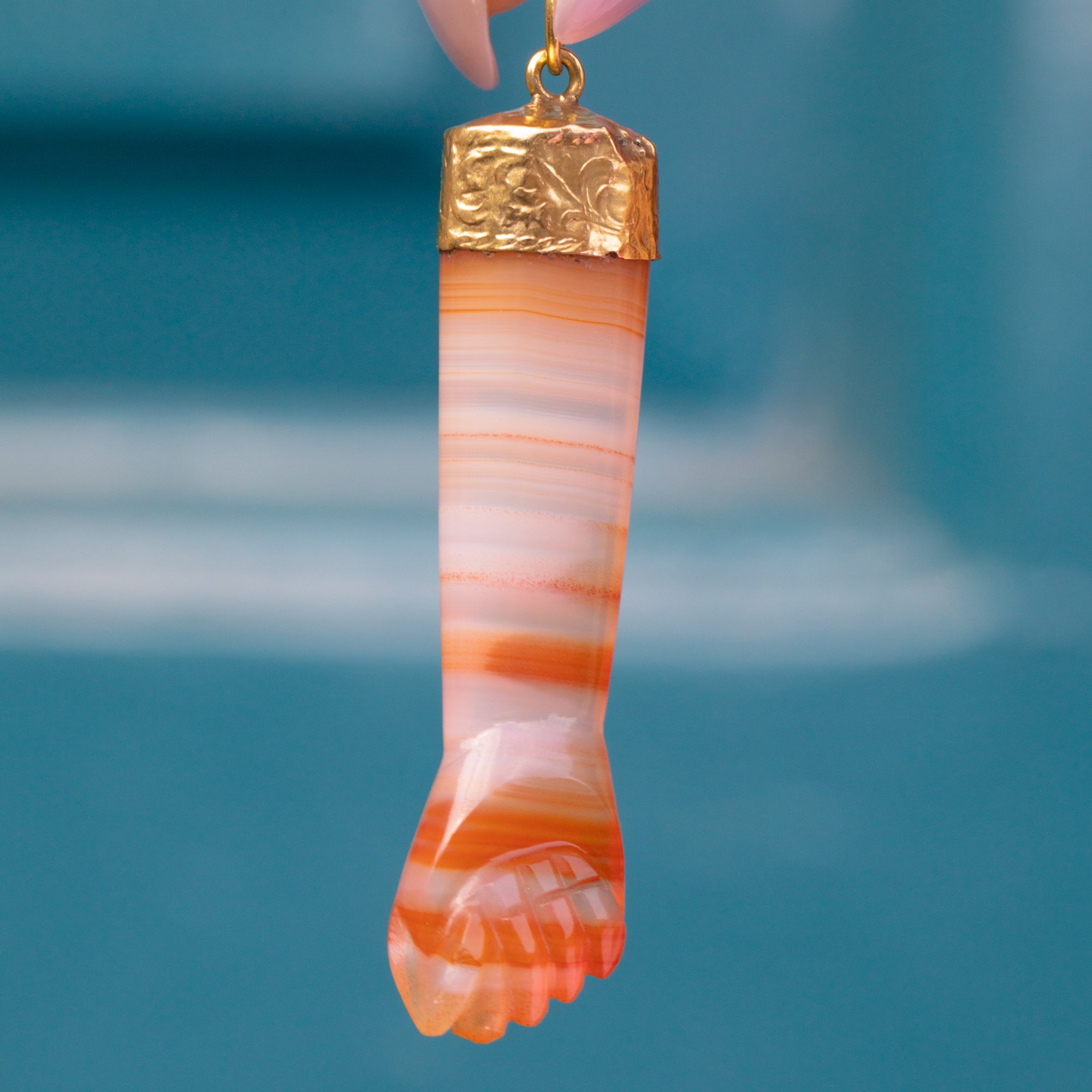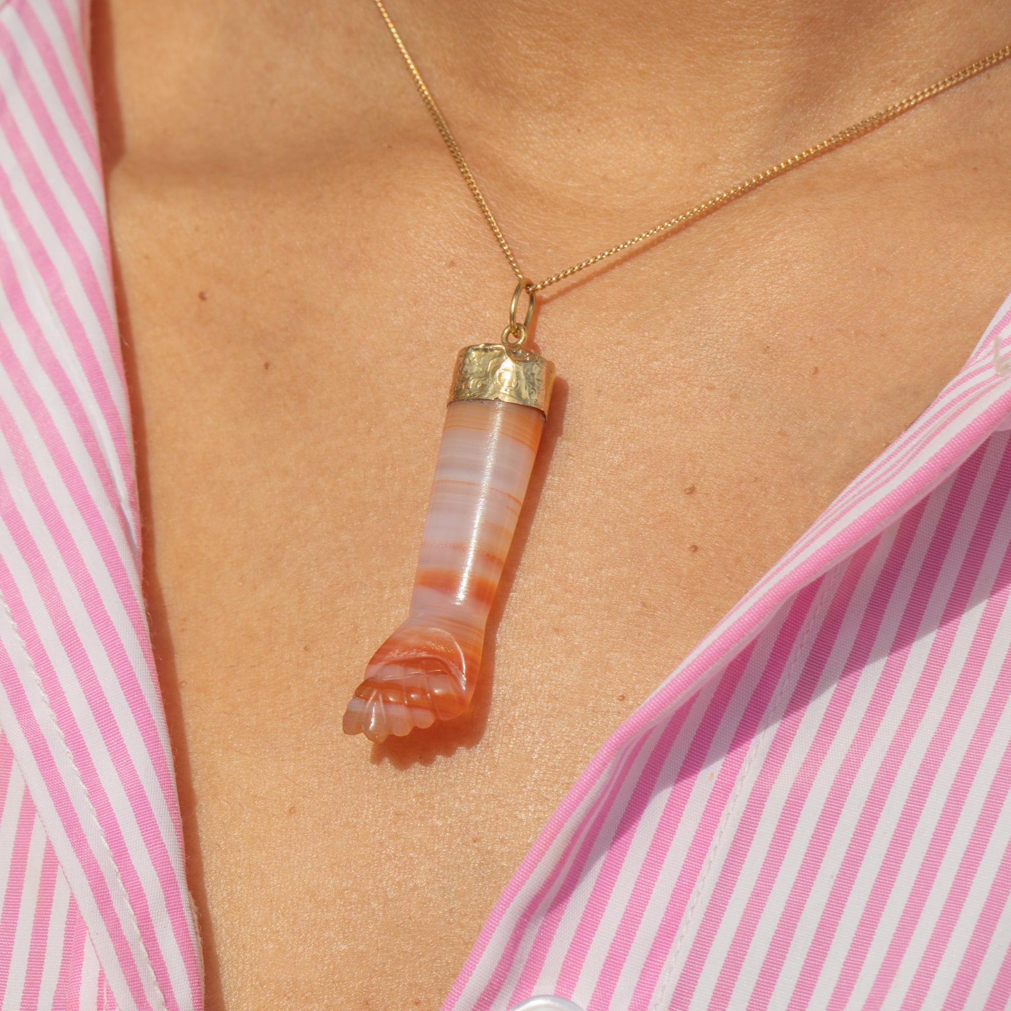 Isn't this antique 18ct Gold Agate Figa lucky pendant a powerful pick?! Her Agate flaunts streaks of peach across the milky pink core and has been carved to perfection to form the Figa motif, known for representing good luck.