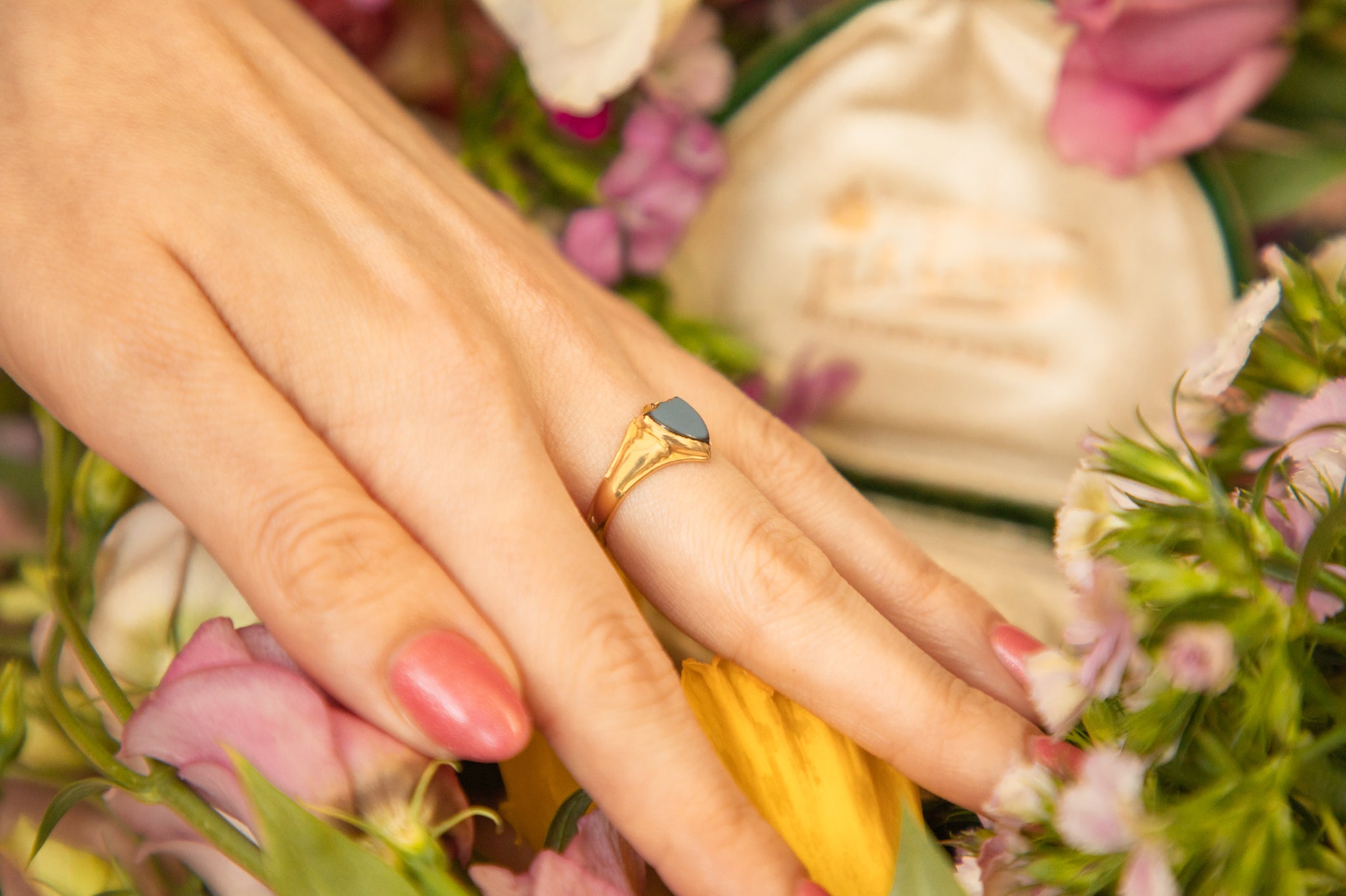 Set your jewellery collection apart from the rest with this gorgeous antique 18ct Gold Agate shield signet ring. Boasting a smooth, solid band, this Victorian ring is composed of richly saturated 18ct Gold with a flint grey Agate shield proudly poised in its centre.