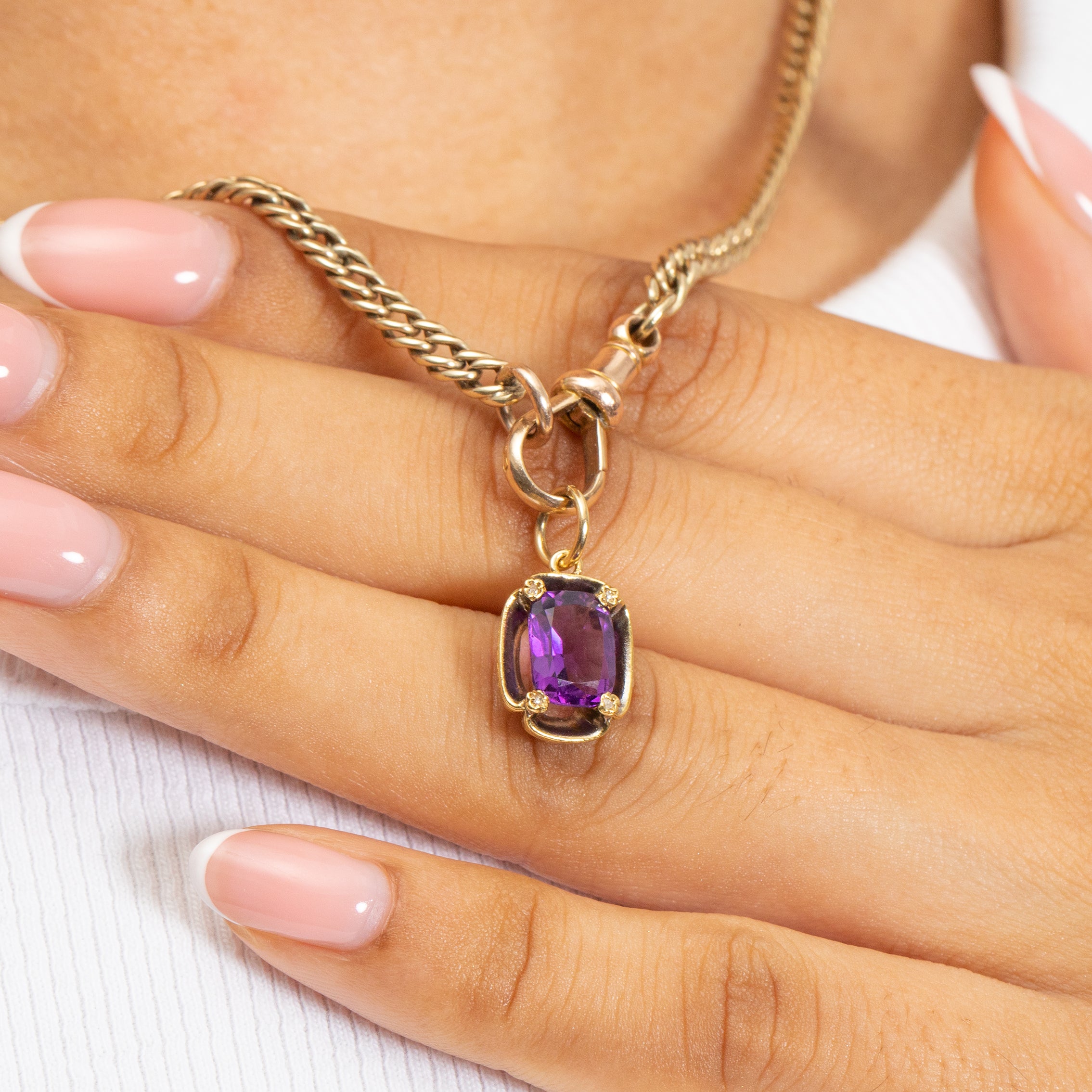 A magnificent antique 18ct Gold Amethyst Diamond charm that will make you feel like a queen! Her 1.70ct Amethyst boasts a bright indigo hue with a gorgeous gleam as each crisp cut facet dances in the light.