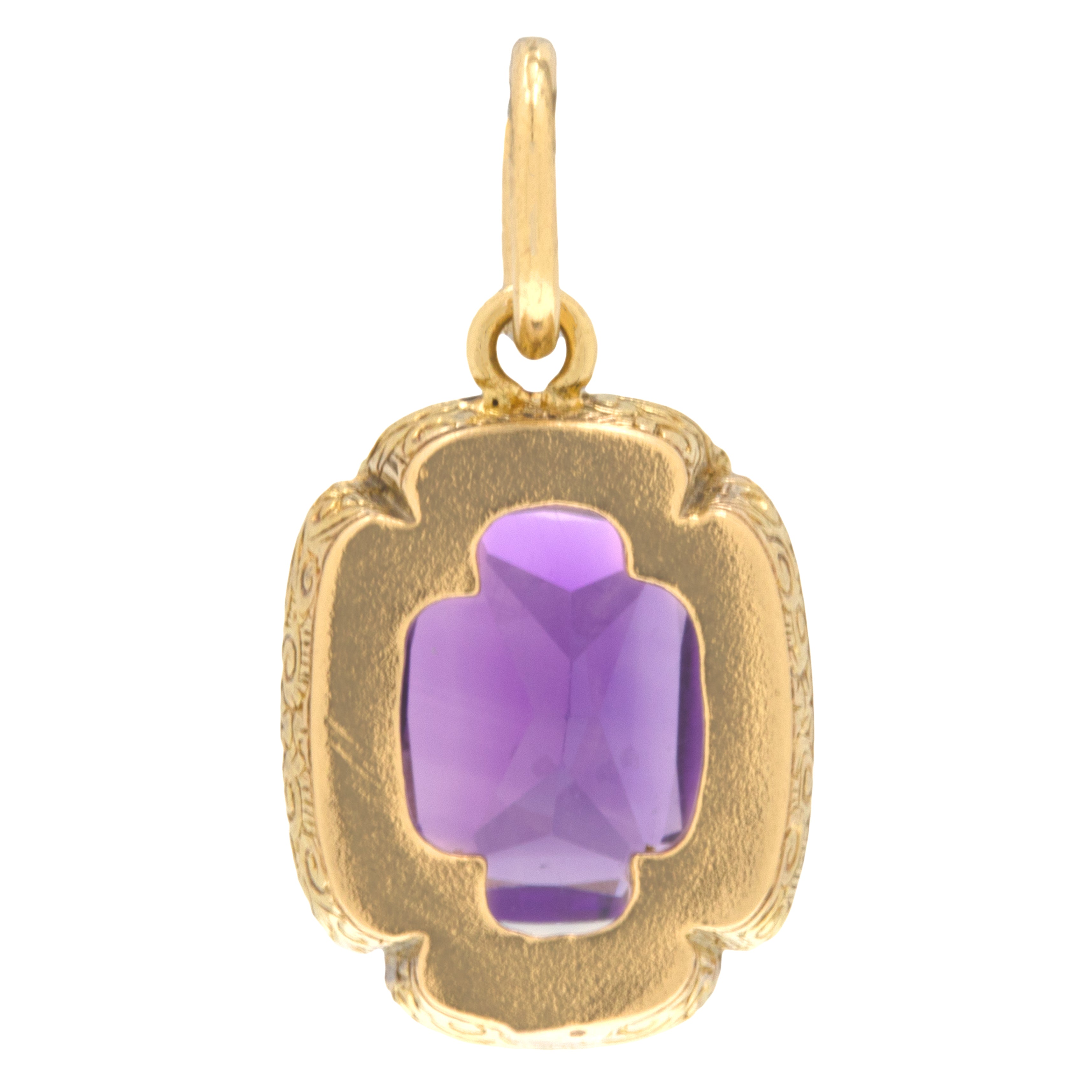 EXCELLENT. This antique 18ct Gold Amethyst Diamond charm is offered in excellent condition. Her Amethyst is vibrant and has retained its faceted form well over the years, and each Diamond offers a subtle sparkle. The 18ct Gold is buttery and the engraved details have all remained crisp. Each gemstone is securely set and the large jump ring allows you to wear this spectacular Victorian pendant with absolute confidence!