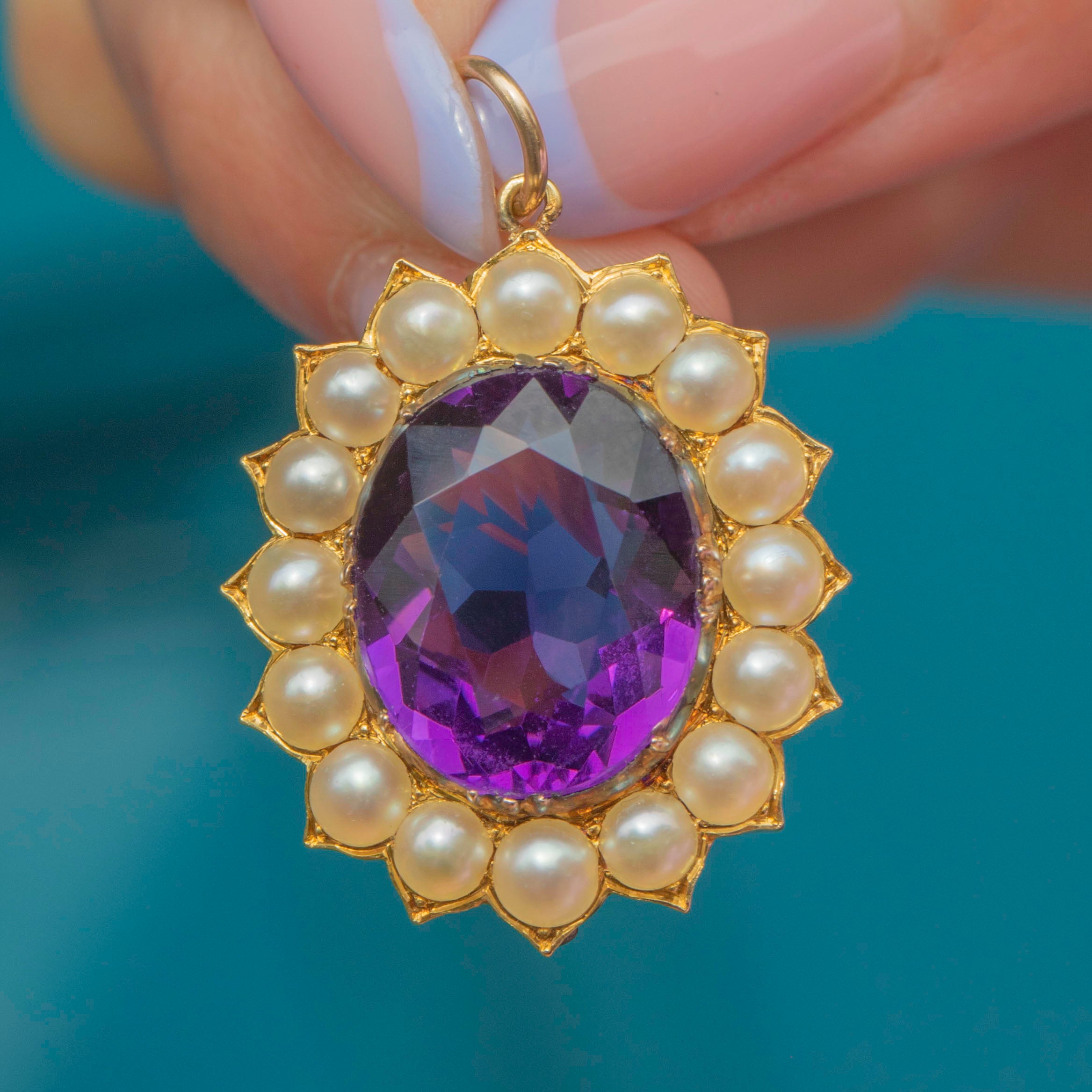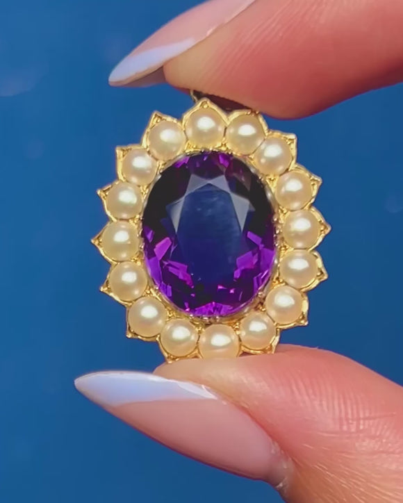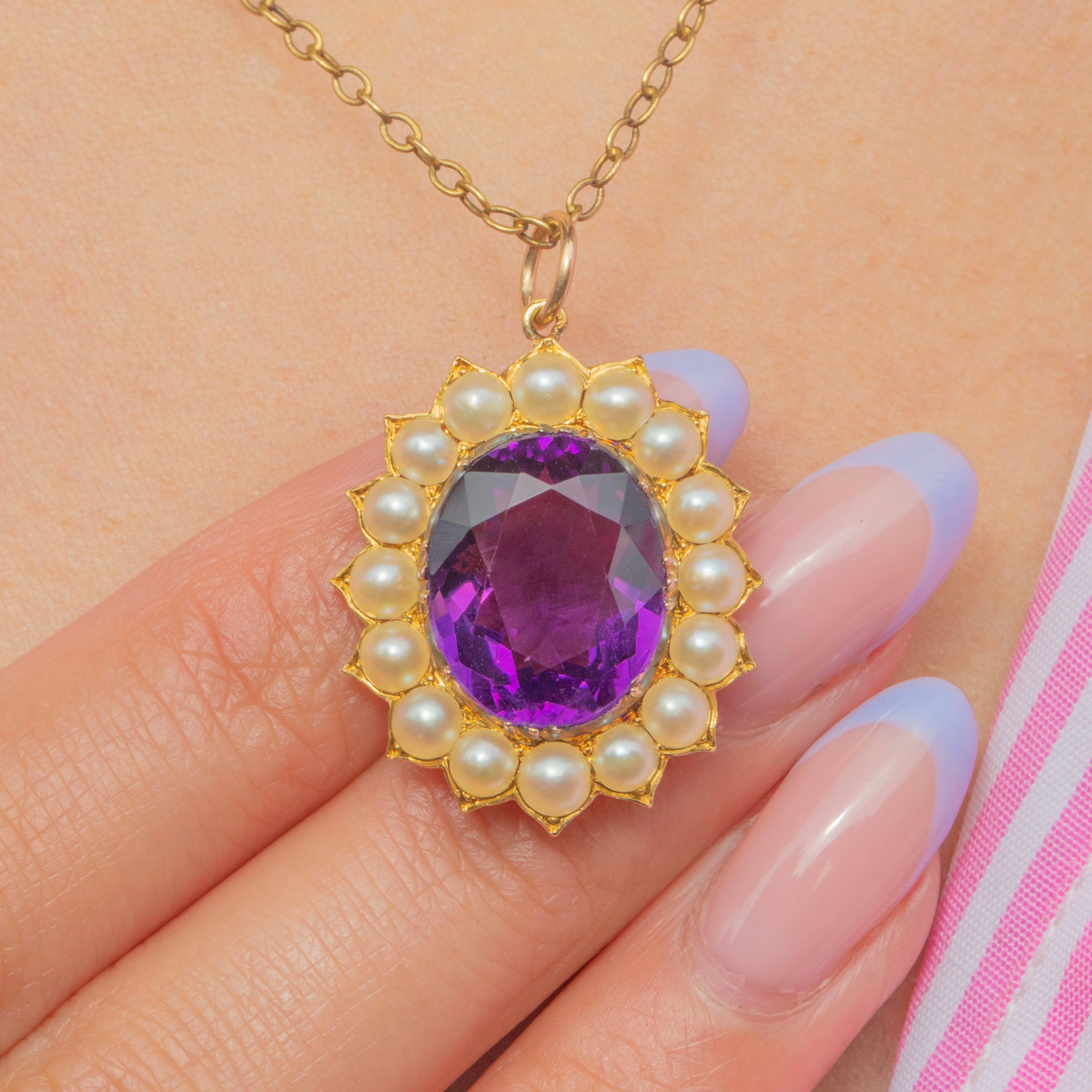 This antique 18ct Gold Amethyst Pearl cluster pendant needs no introduction! A myriad of hues radiate through the 4.95ct Amethyst's hand-cut facets, shimmering with lavender and deep violet hues as they catch the light.