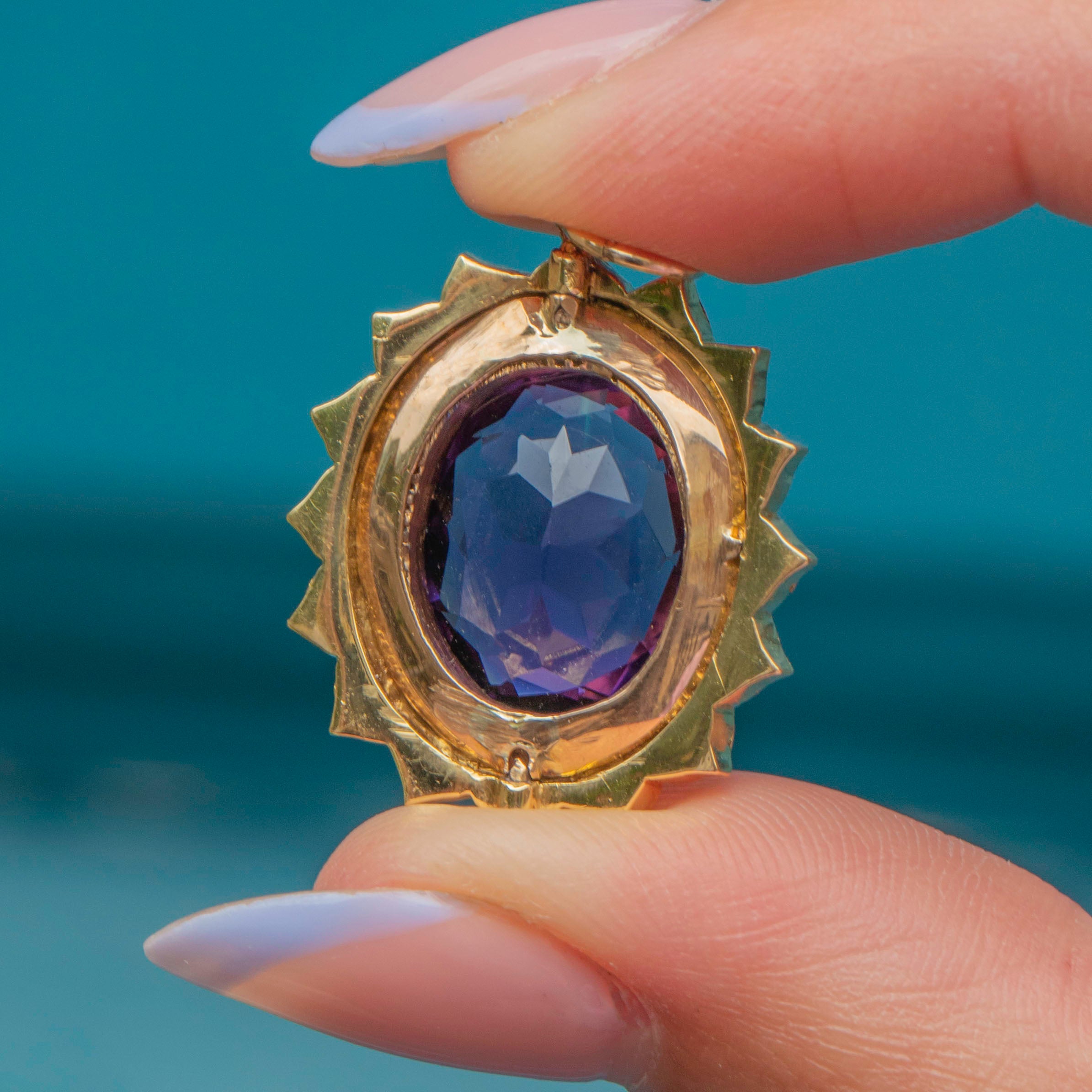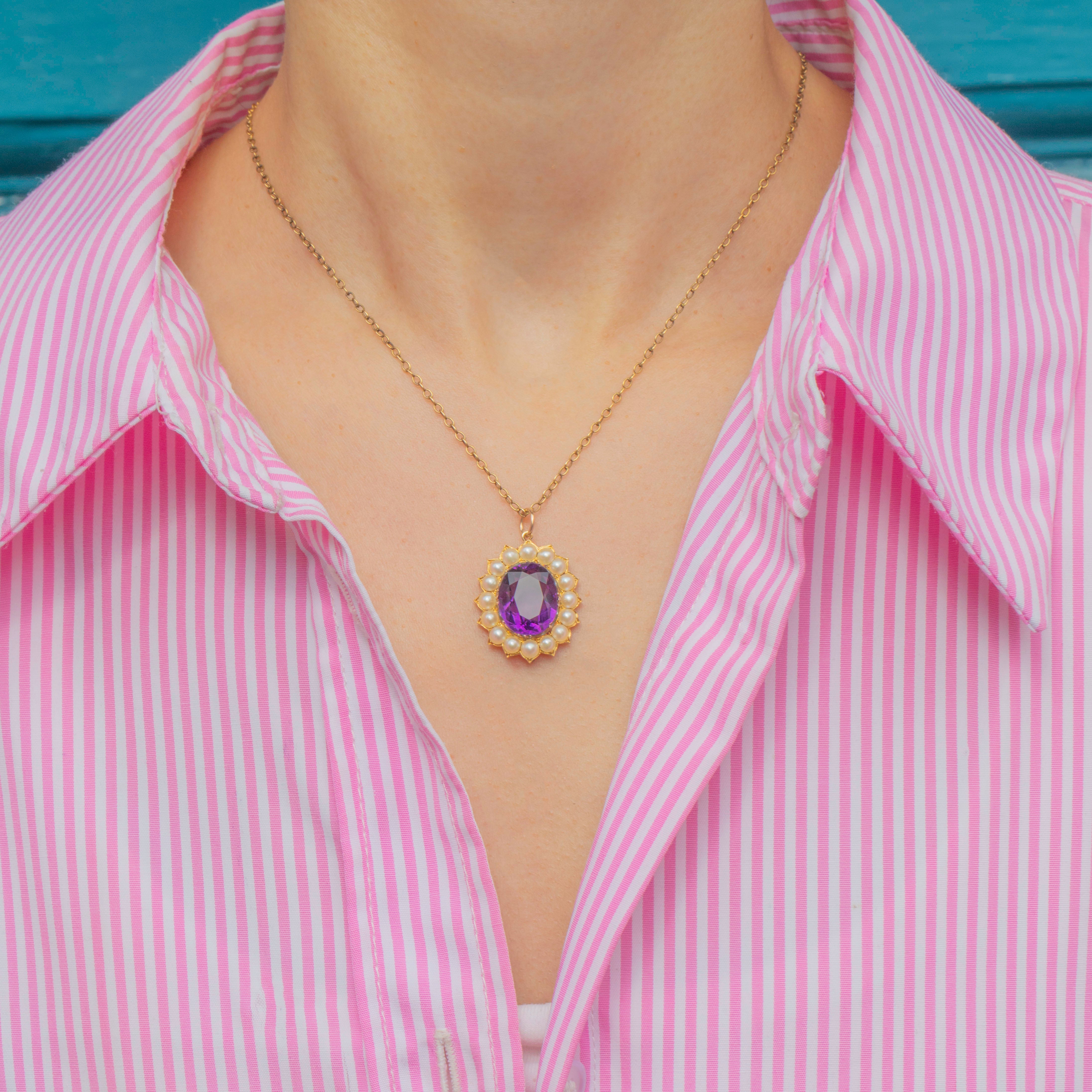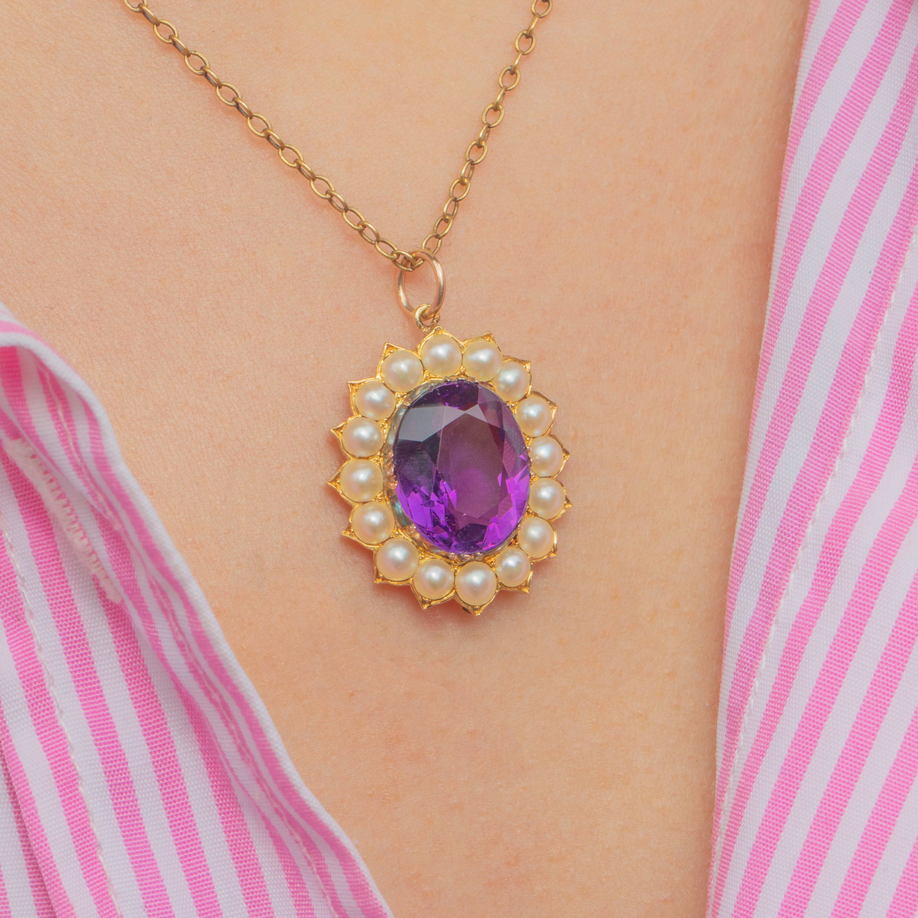 This antique 18ct Gold Amethyst Pearl cluster pendant needs no introduction! A myriad of hues radiate through the 4.95ct Amethyst's hand-cut facets, shimmering with lavender and deep violet hues as they catch the light.