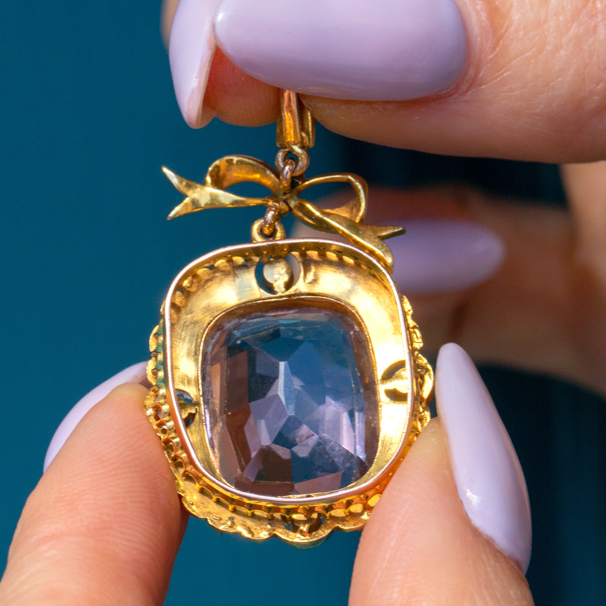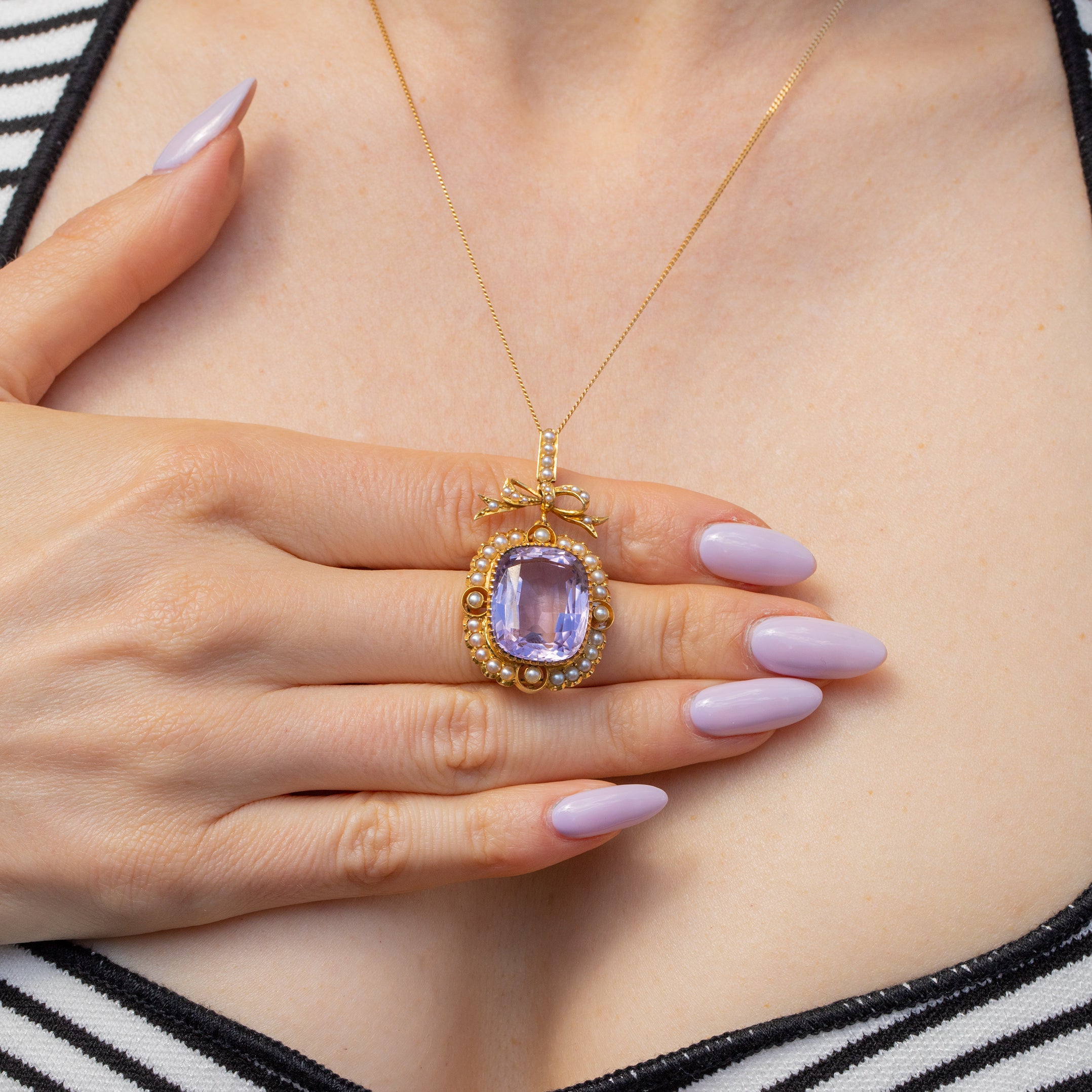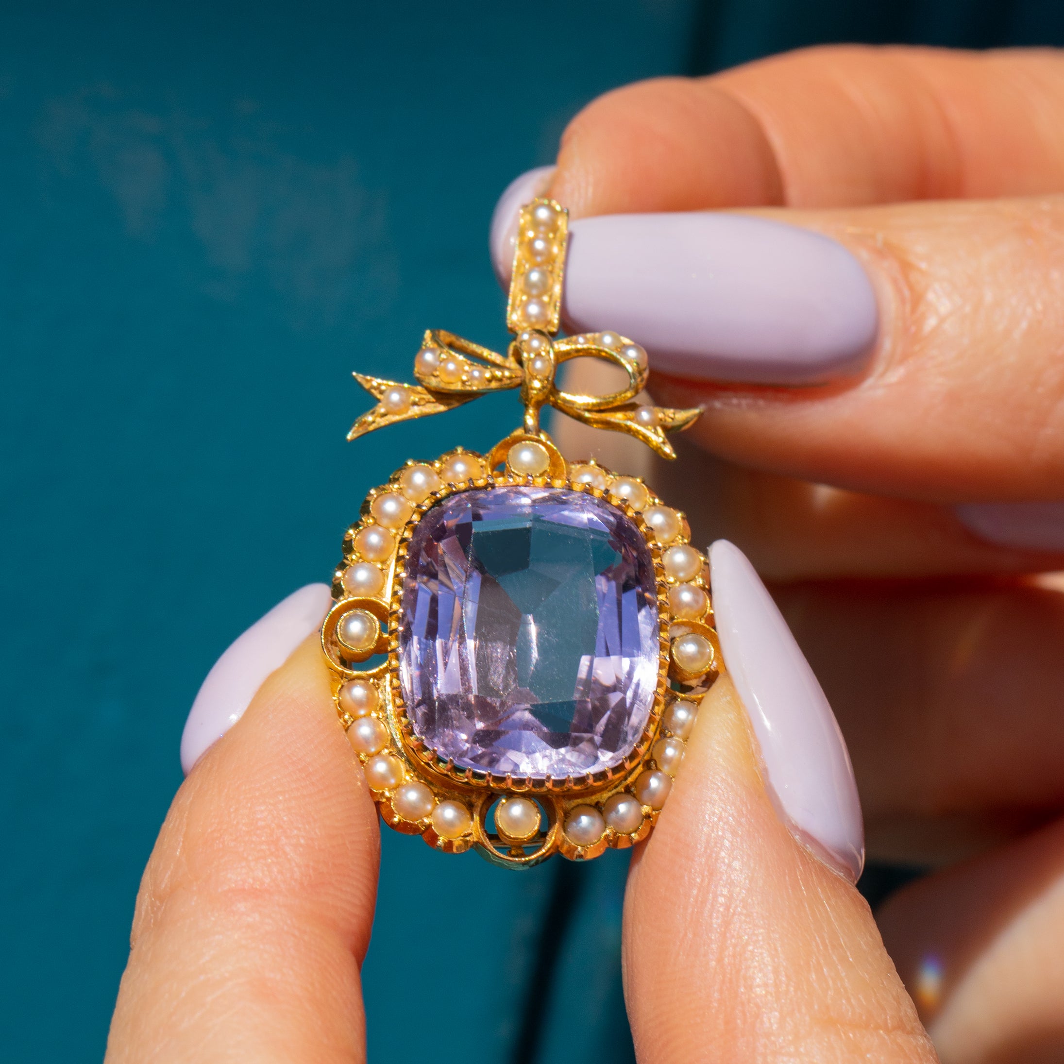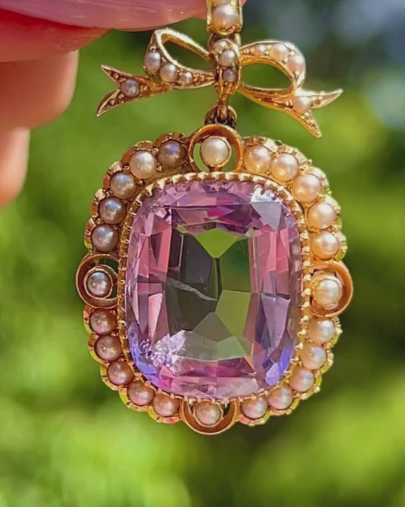Antique 18ct Gold Amethyst Pearl Pendant 14.69ct, Ribbon Top