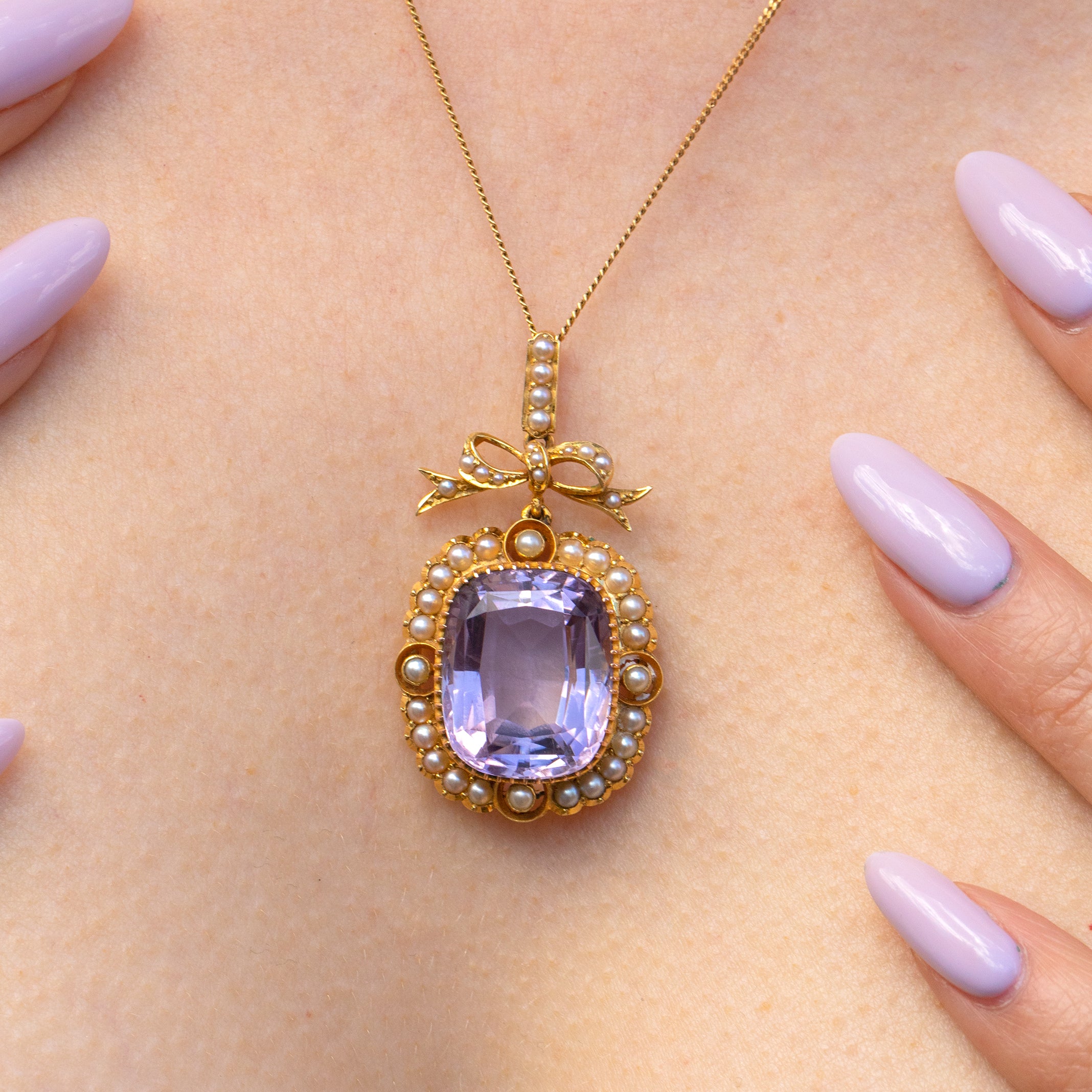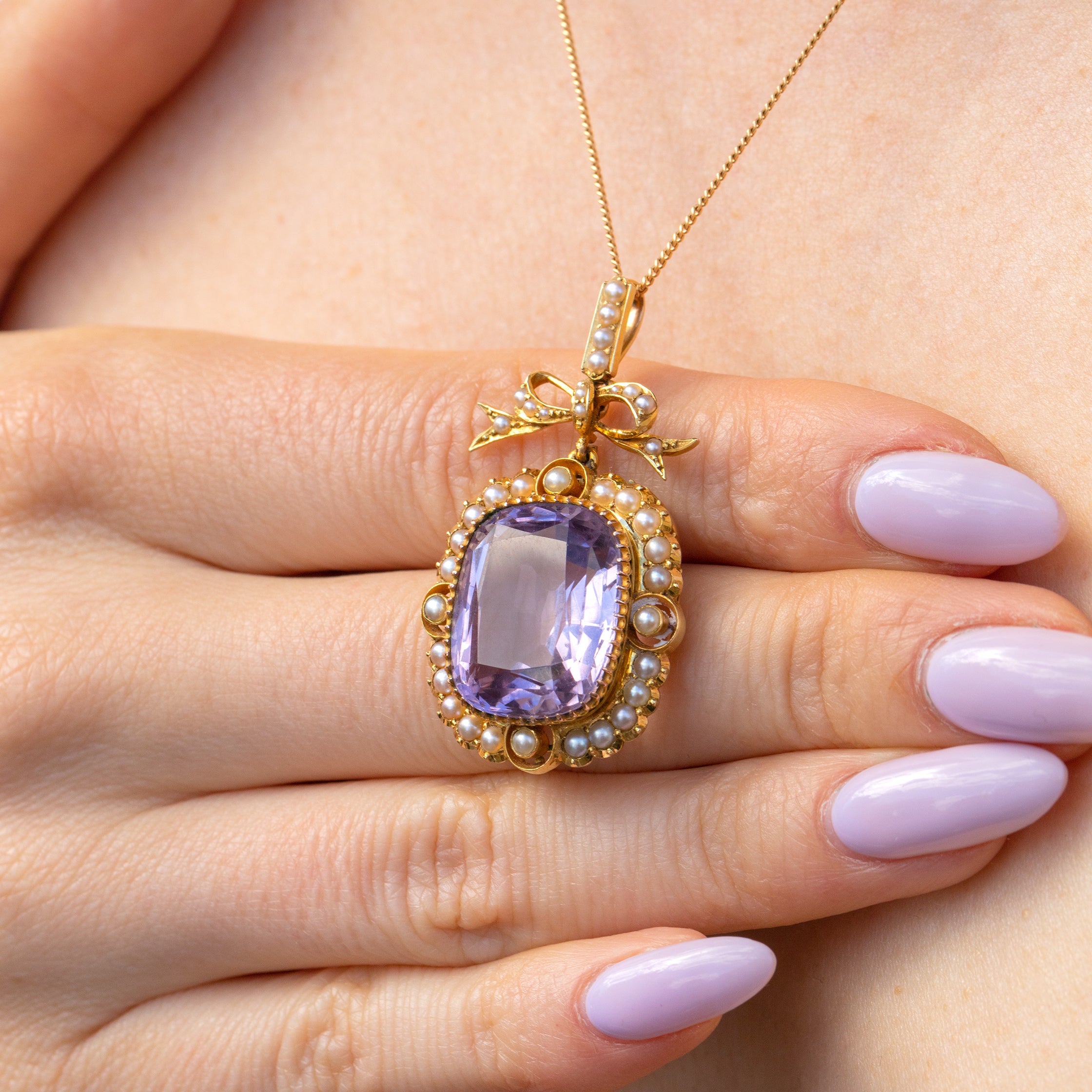 VERY GOOD. This Victorian 18ct Gold Amethyst Pearl pendant is in very good condition. Shinning a bright lavender hue, the 14.69ct Amethyst is secure in her setting and is free from chips. Under close inspection, the Amethyst has a light scratch, but this is only noticeable up close. The Pearls are all present and secure, each one having retained its natural nacre. The Gold is brightly saturated, the back is slightly uneven from where it has been crafted to fit the Amethyst, but this cannot be seen while the pendant is worn. The bale is firmly affixed allowing you to wear this regal piece of Victorian jewellery with absolute confidence!