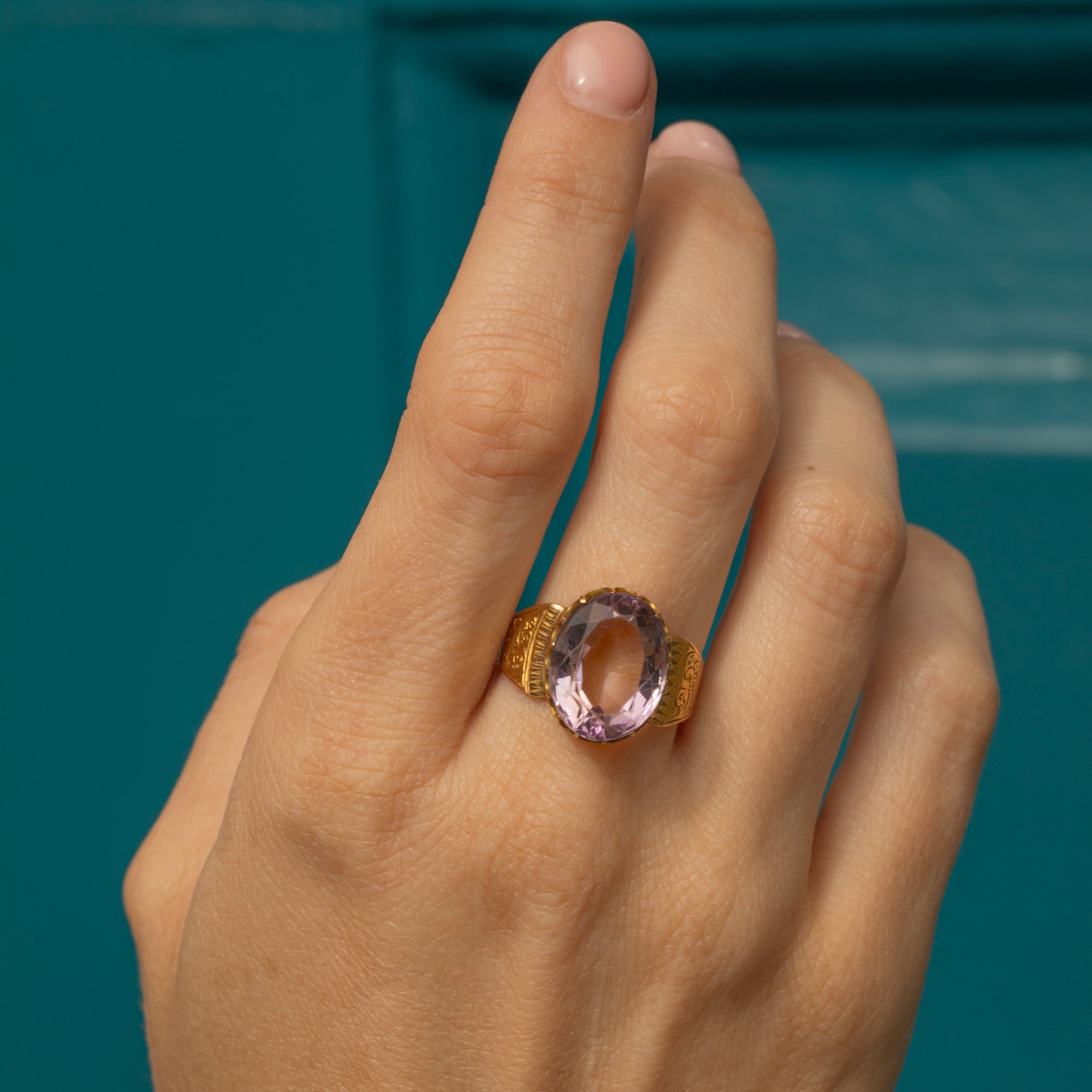 Antique 18ct Gold Amethyst Ring 5.22ct, Engraved Shoulders