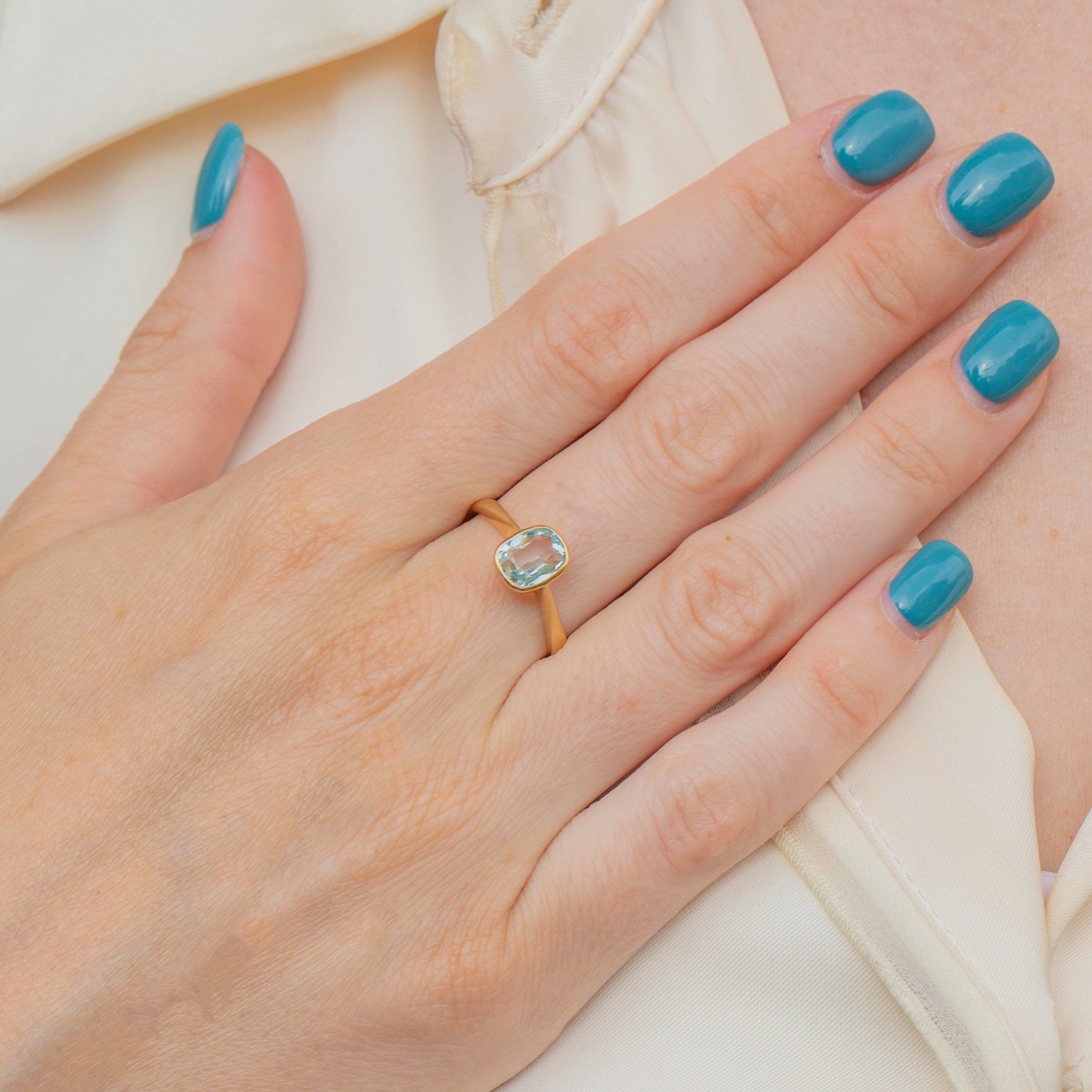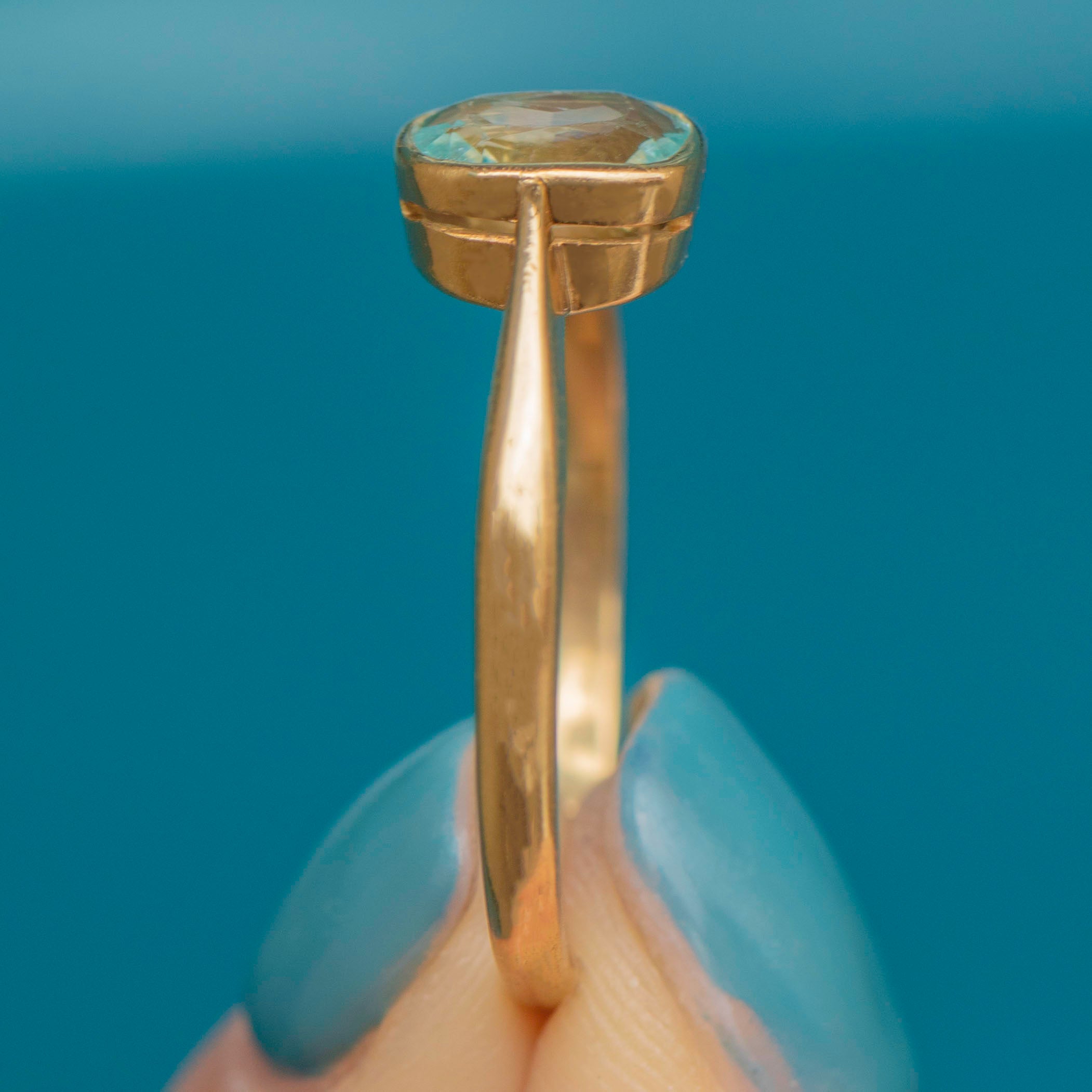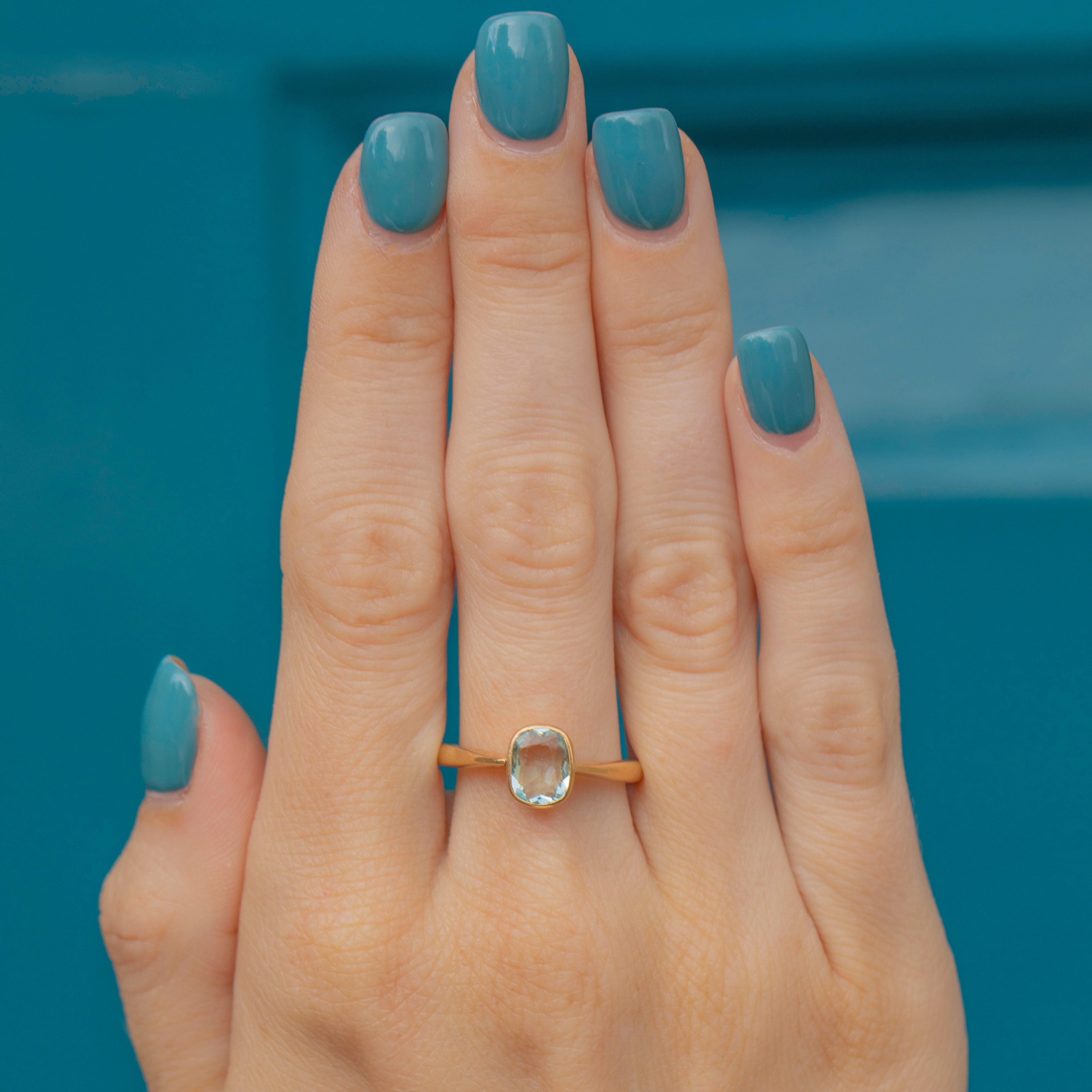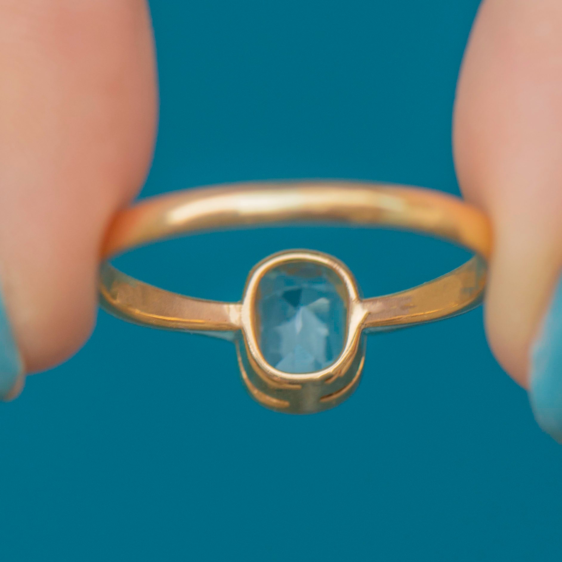 The colour combination of buttery Gold and icy blue makes for a pretty pairing, and the bezel setting frames the stone elegantly. It would make a gorgeous gift for any occasion or a unique Edwardian solitaire ring to add to your collection!