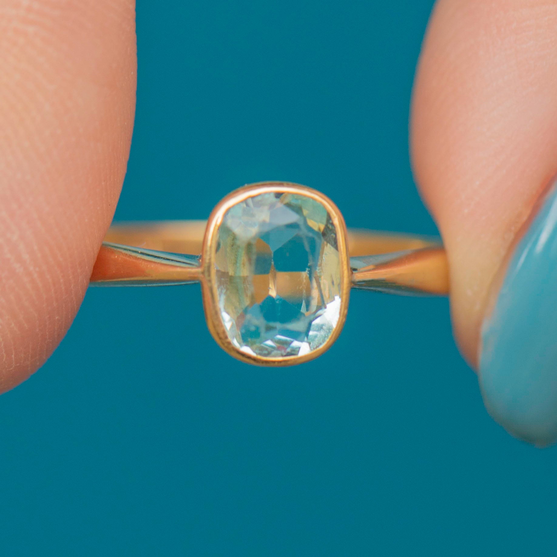 EXCELLENT. This antique 18ct Gold Aquamarine solitaire ring is in fabulous condition. The Aquamarine is securely held within her bezel and free from chips or abrasions. The 18ct Gold is sumptuous and the band has remained robust; this ring would make a gorgeous addition to anyone's jewellery box!