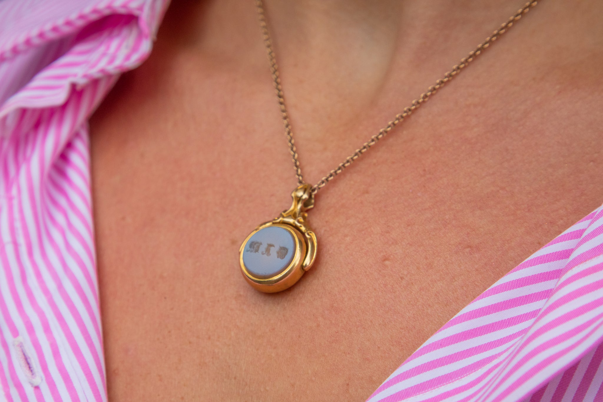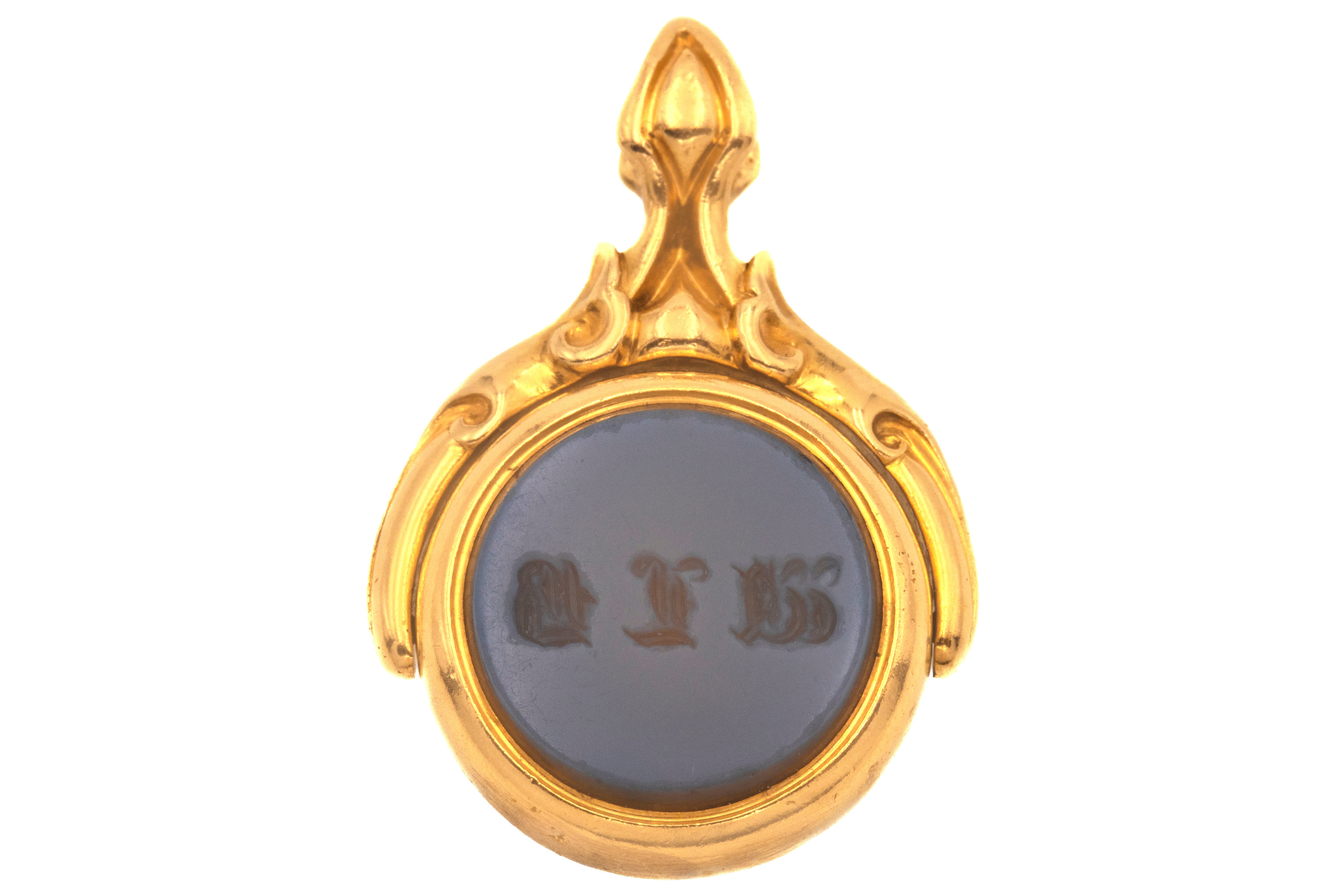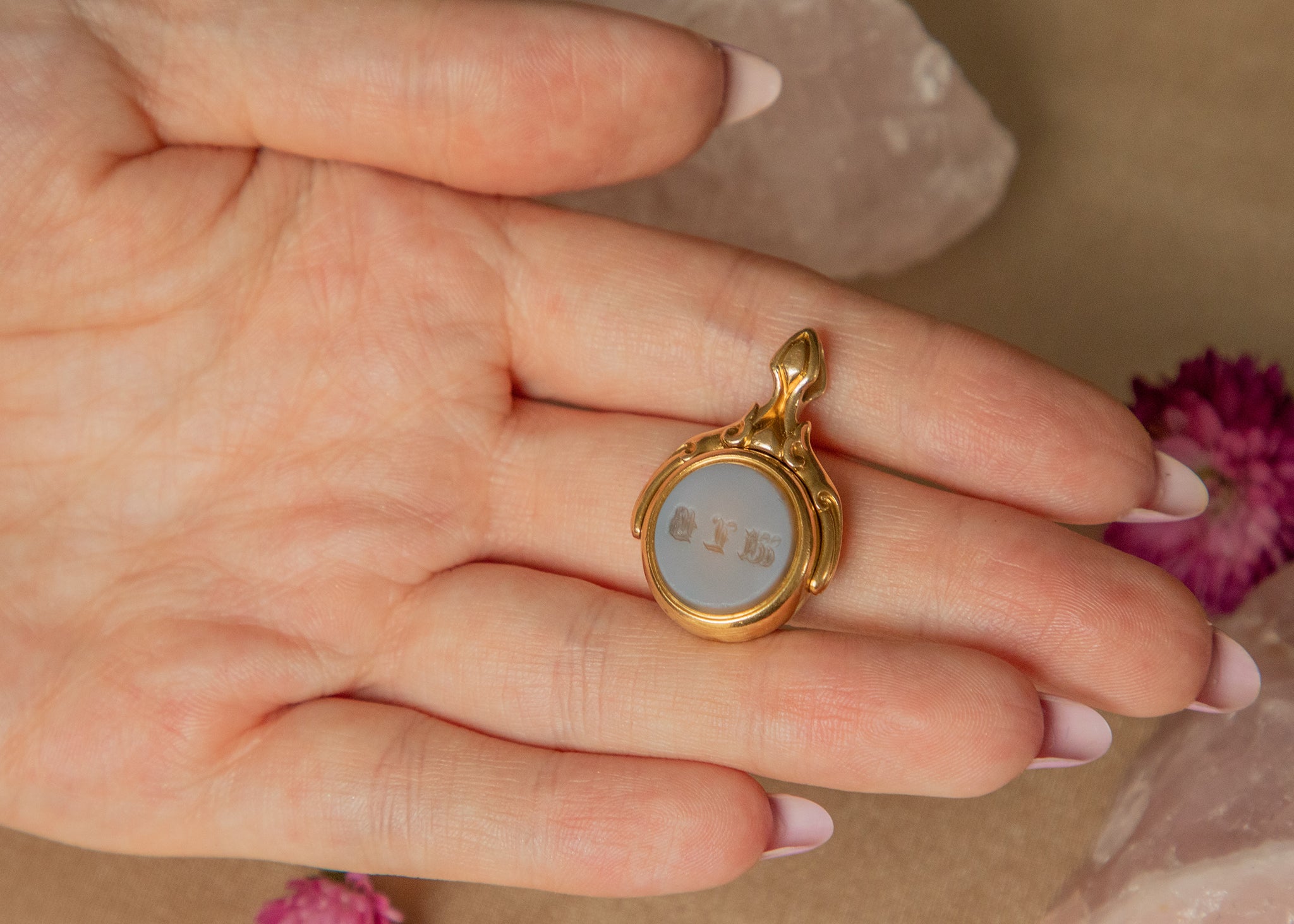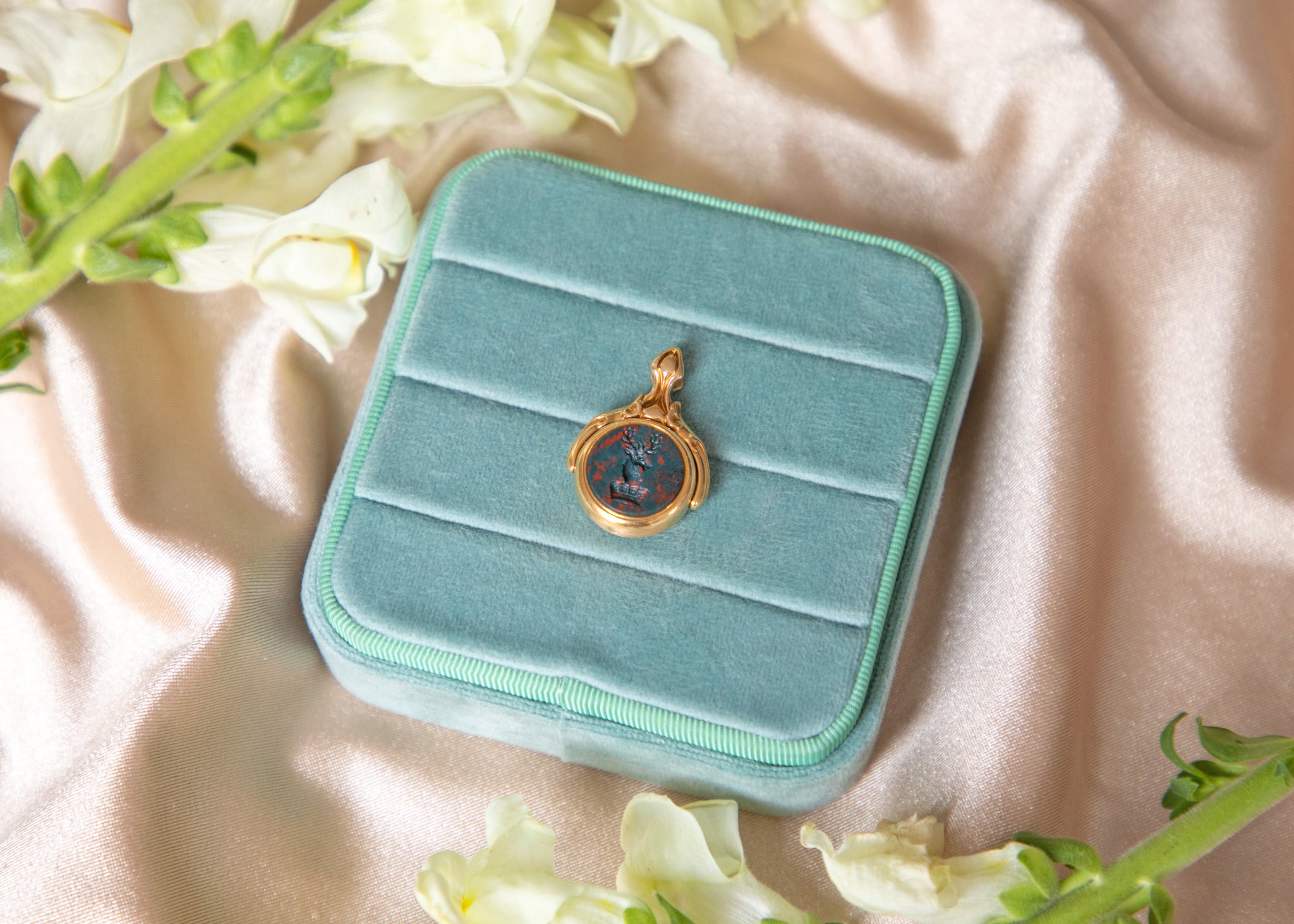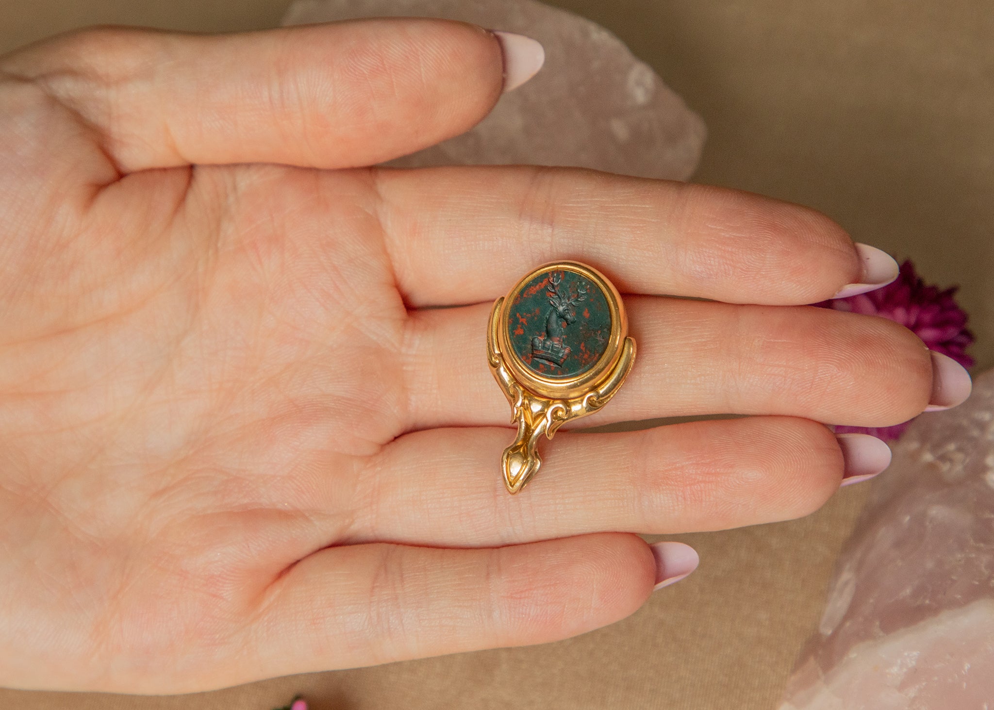 The piece boasts both a lightly speckled Bloodstone, and a smooth pale lilac Chalcedony. On one side you will find a stag intaglio and the other side with letters! This spinner fob is sure to look fabulous as a pendant, but you could certainly use it as a wax seal, for which it was originally intended.