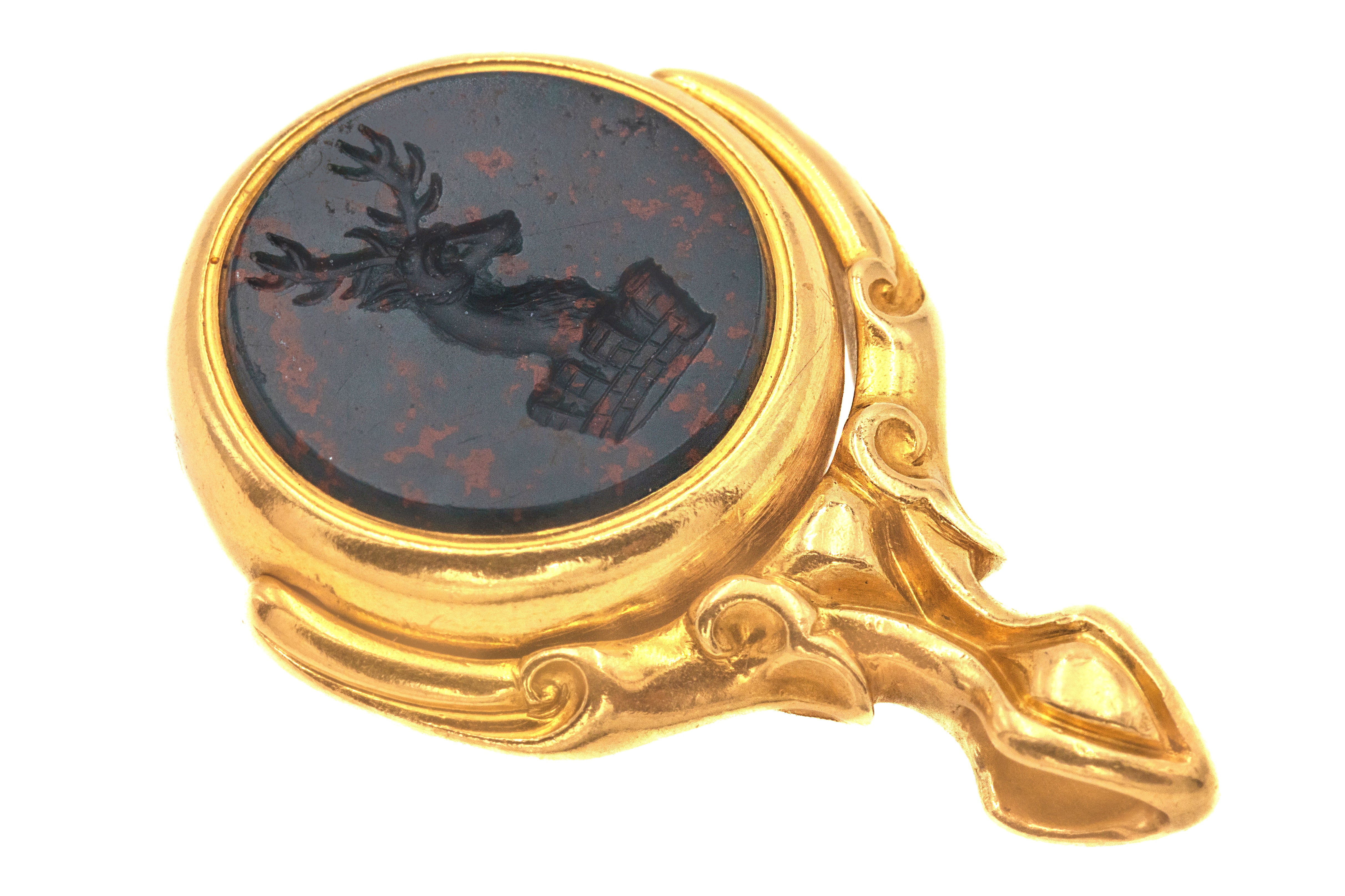 Antique 18ct Gold Bloodstone & Chalcedony Spinner Fob, Stag Intaglio