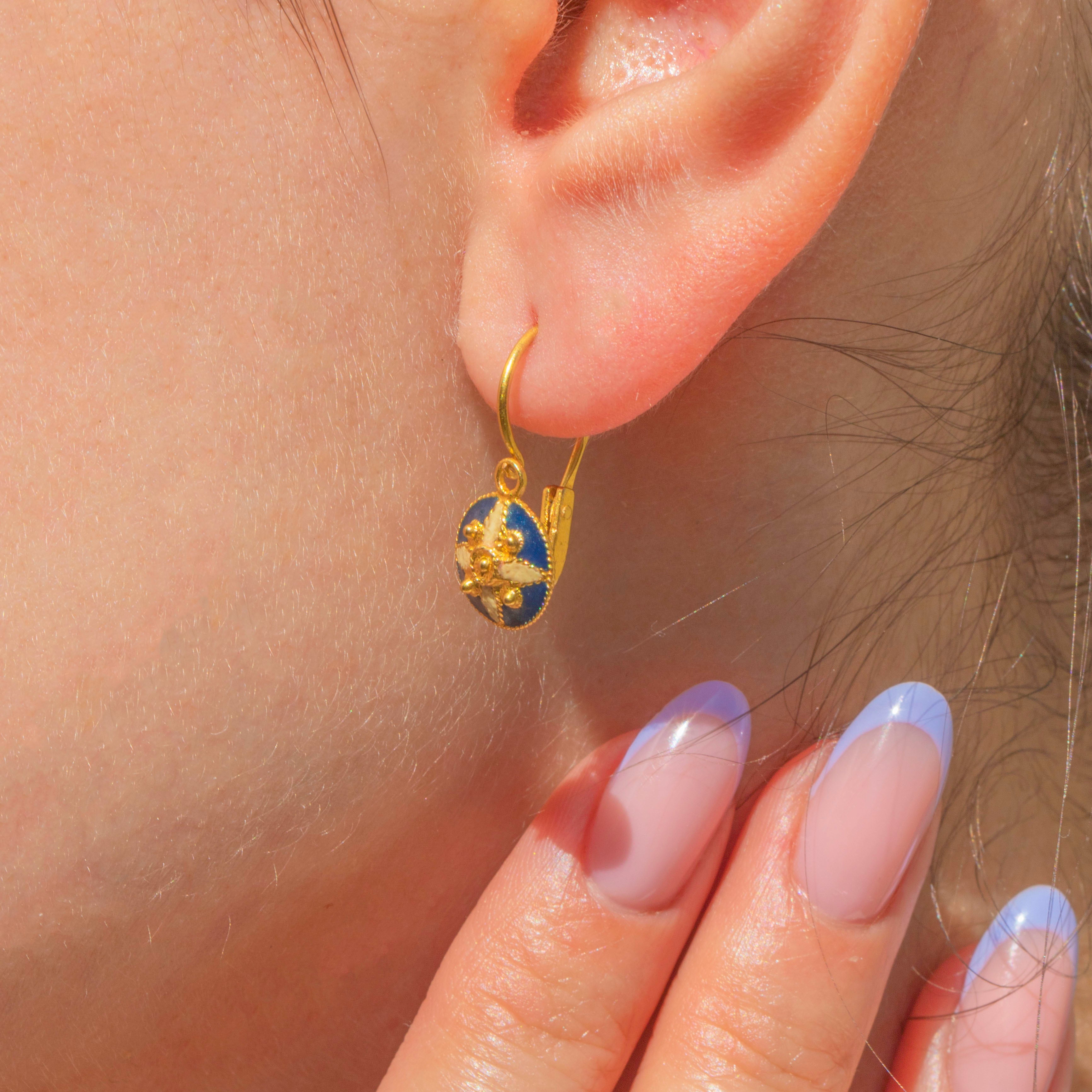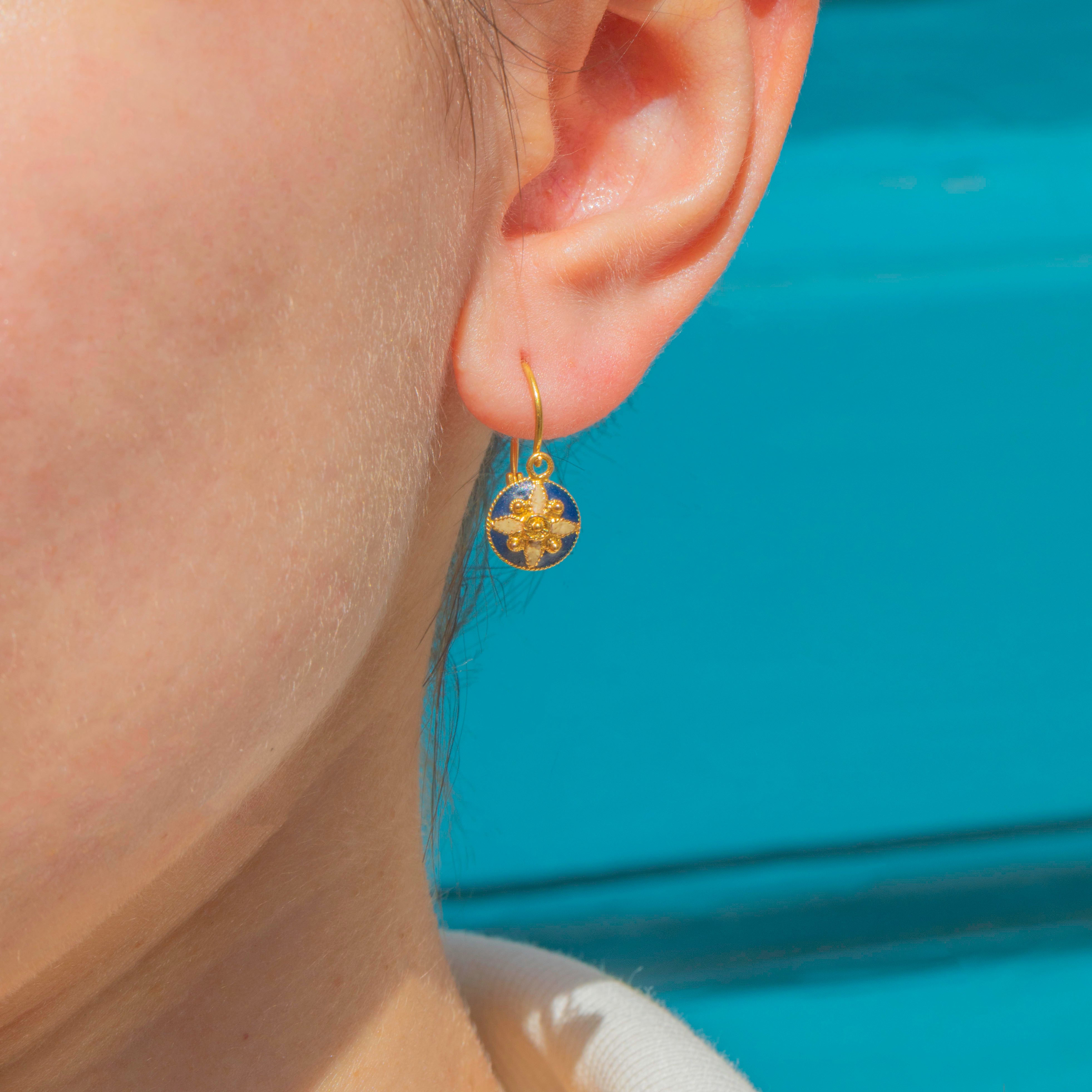Each earring boasts a gorgeous navy Enamel face, adorned with whimsical starry detailing, providing this pair of Victorian earrings with bundles of character. Crafted from buttery 18ct Gold, these lever-backs suspend elegantly from your lobes and will provide a subtle touch of magic to your everyday attire.