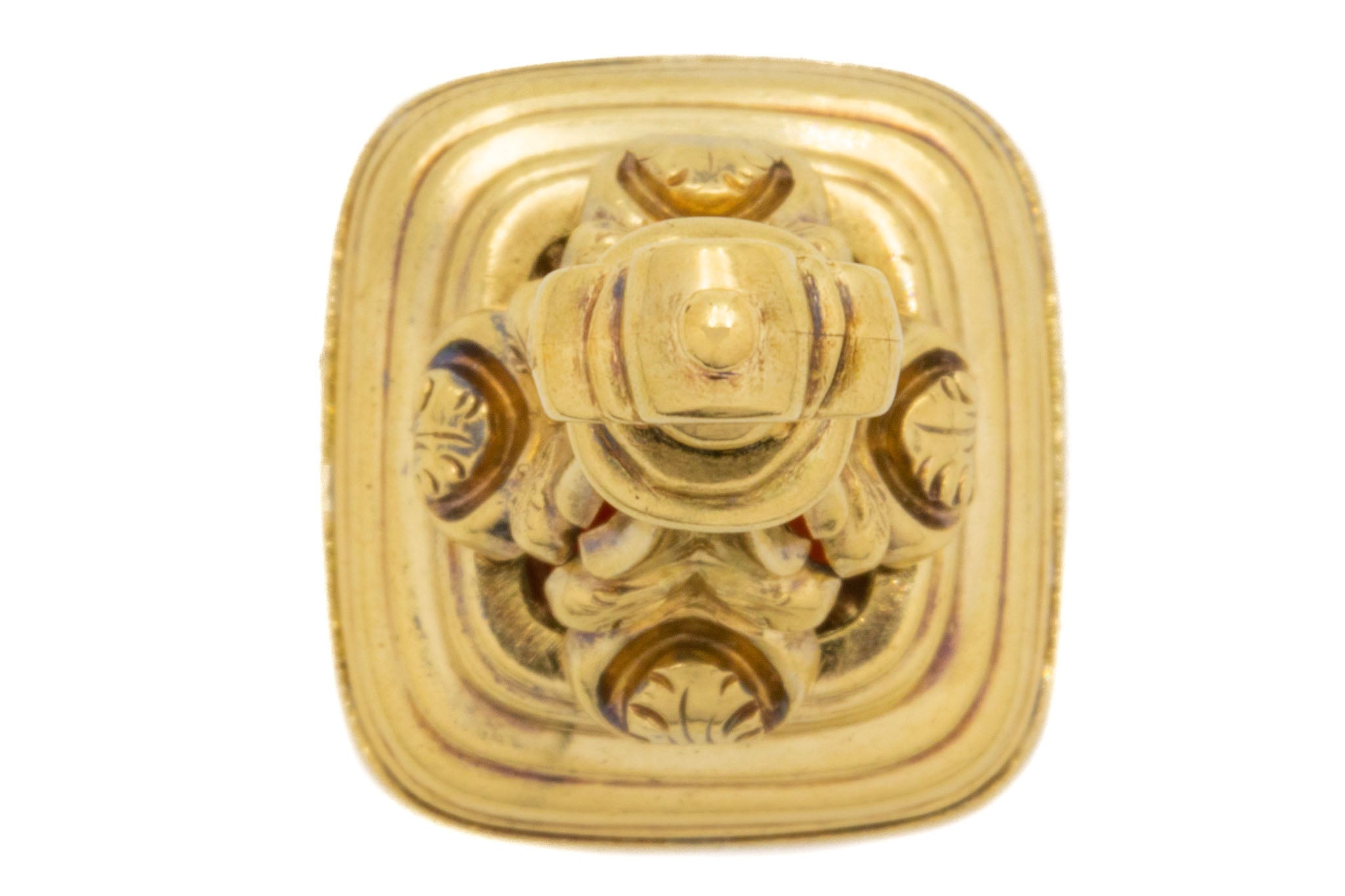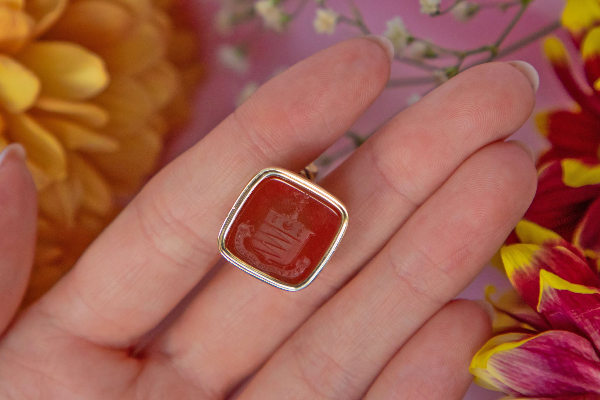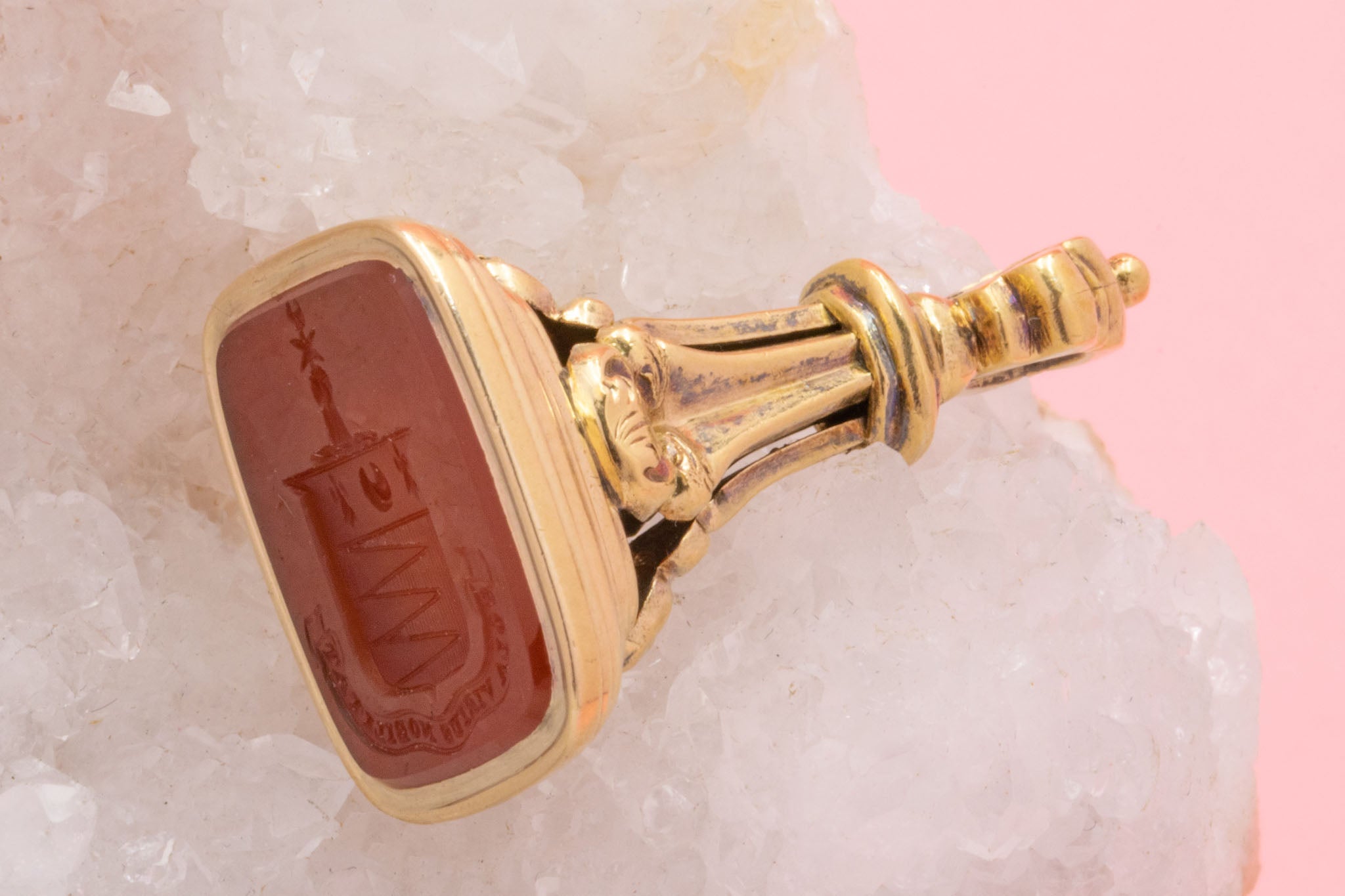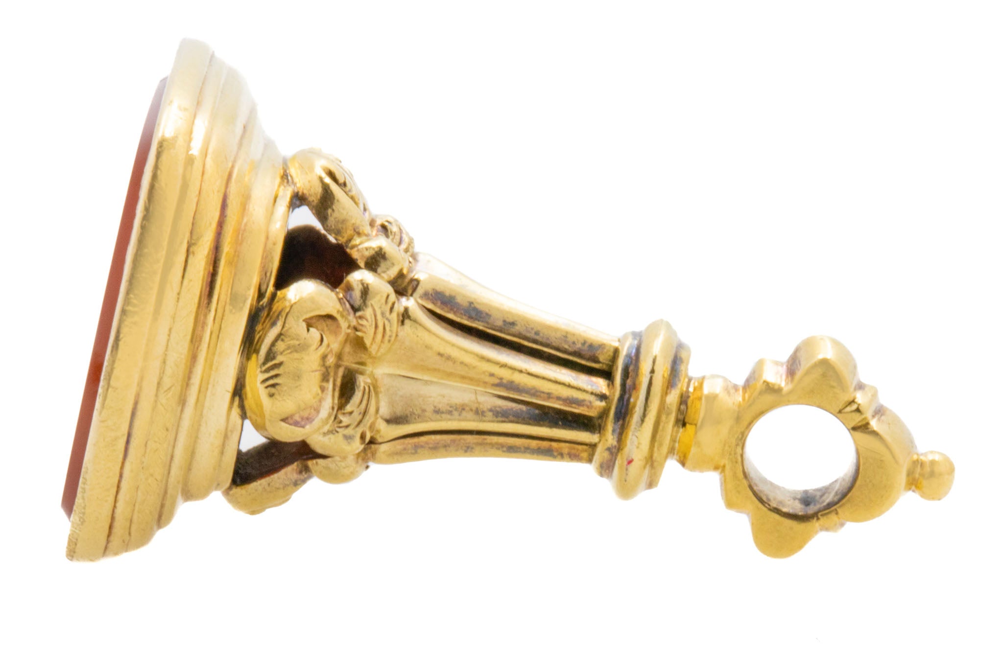EXCELLENT. This antique 18ct Gold Carnelian intaglio seal pendant is in excellent condition throughout. The Carnelian gemstone is securely set and the intaglio is free from any chips or signs of wear. The Gold is bright and the fob's pillar has maintained its structural integrity. There is minimal wear to the piece overall, she's ready to be worn and enjoyed!