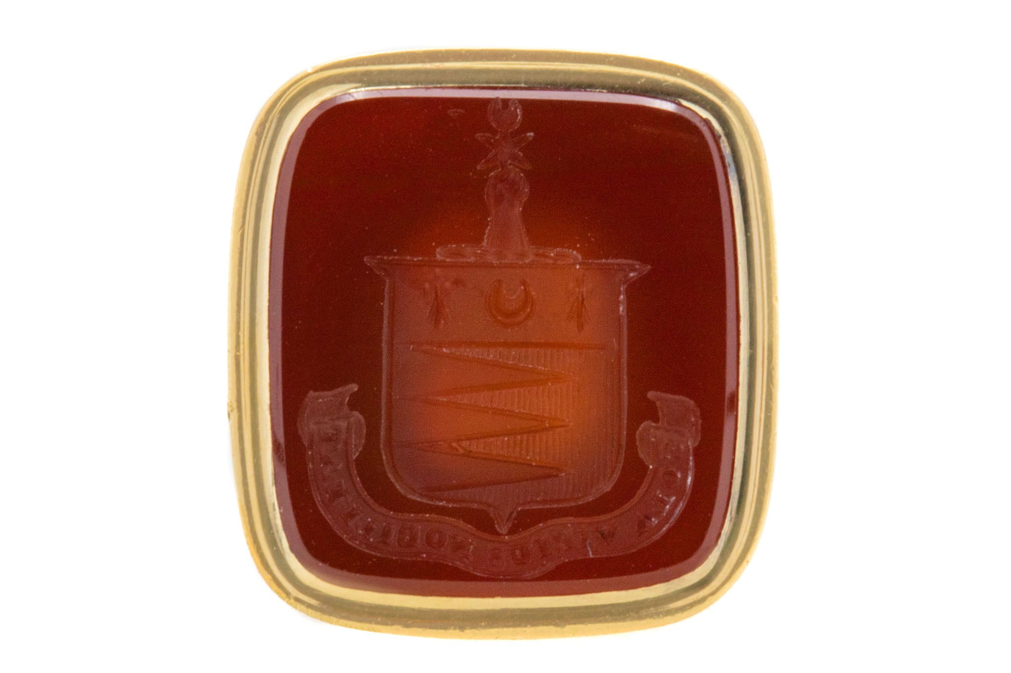 This is a striking antique 18ct Gold Carnelian intaglio seal pendant! At the base of the piece lies a smooth orange-hued Carnelian stone, complete with the Latin motto "Virtue Alone Ennobles" meaning that virtue alone makes a student.