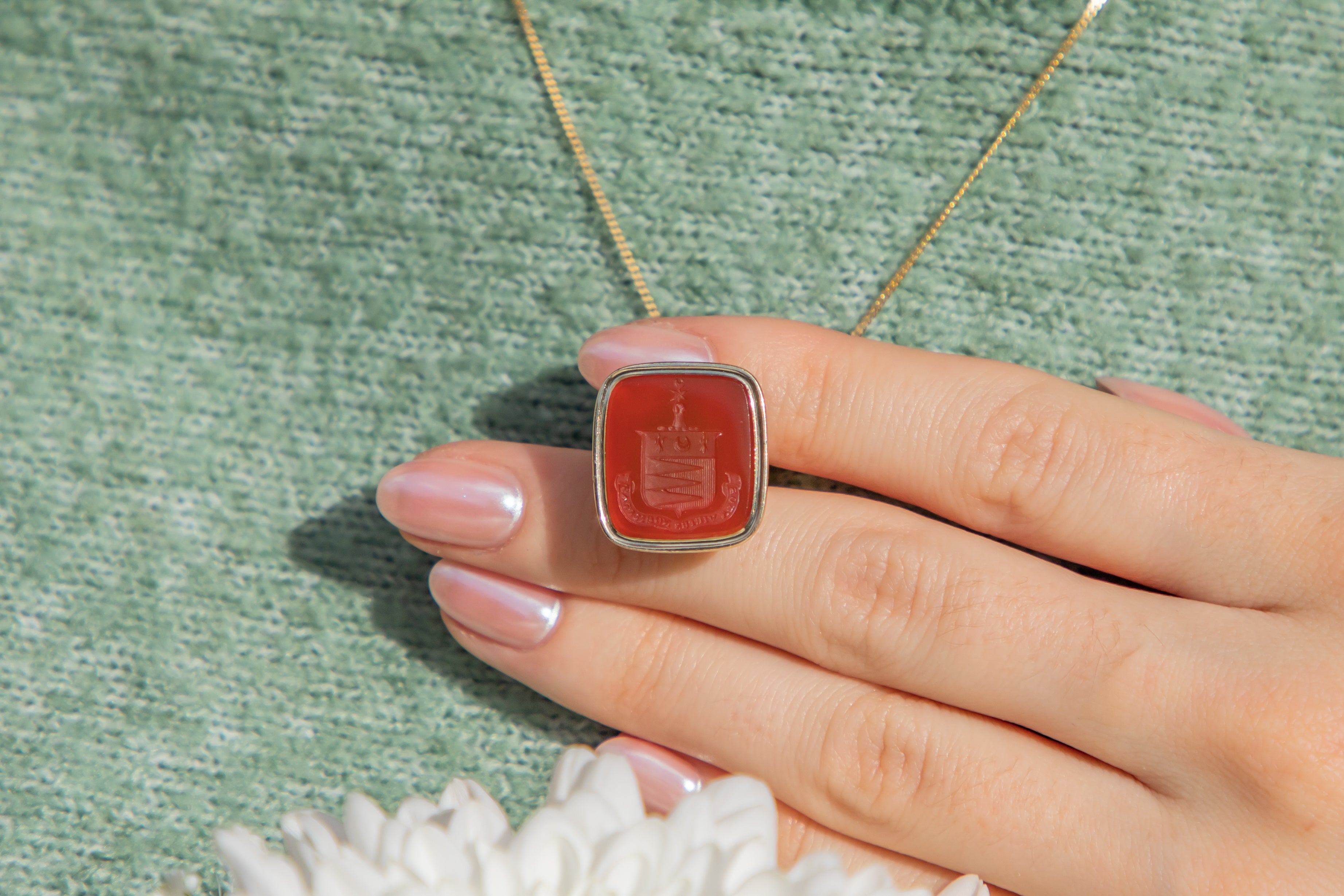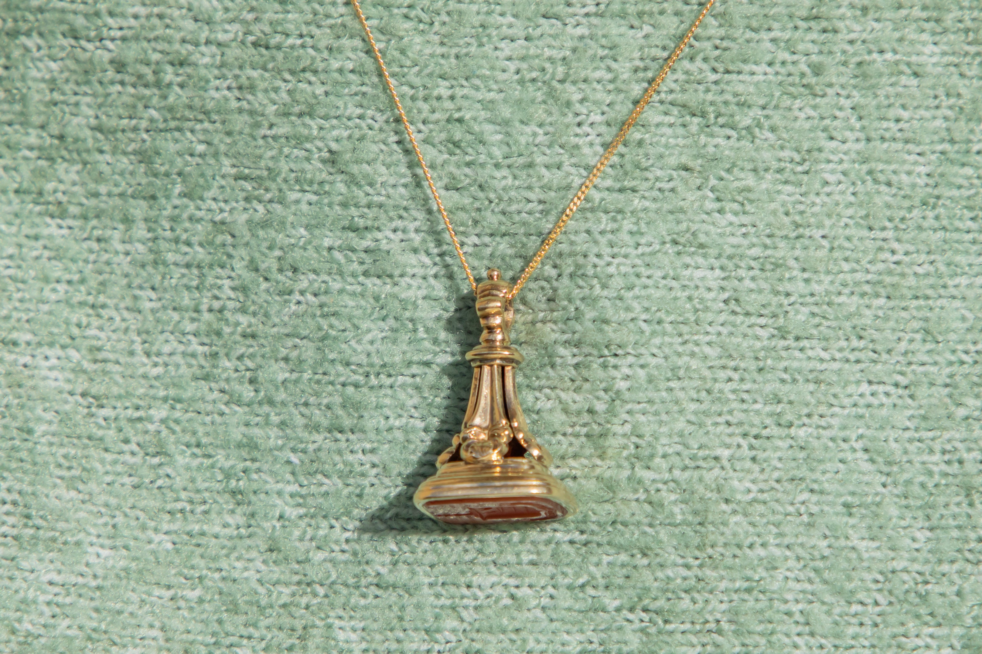 The pillar has been crafted from solid 18ct Gold, and is beautifully structured. This intaglio seal pendant is a great way to make a neck stack more playful, and sure to cause some intrigue amongst your friends!