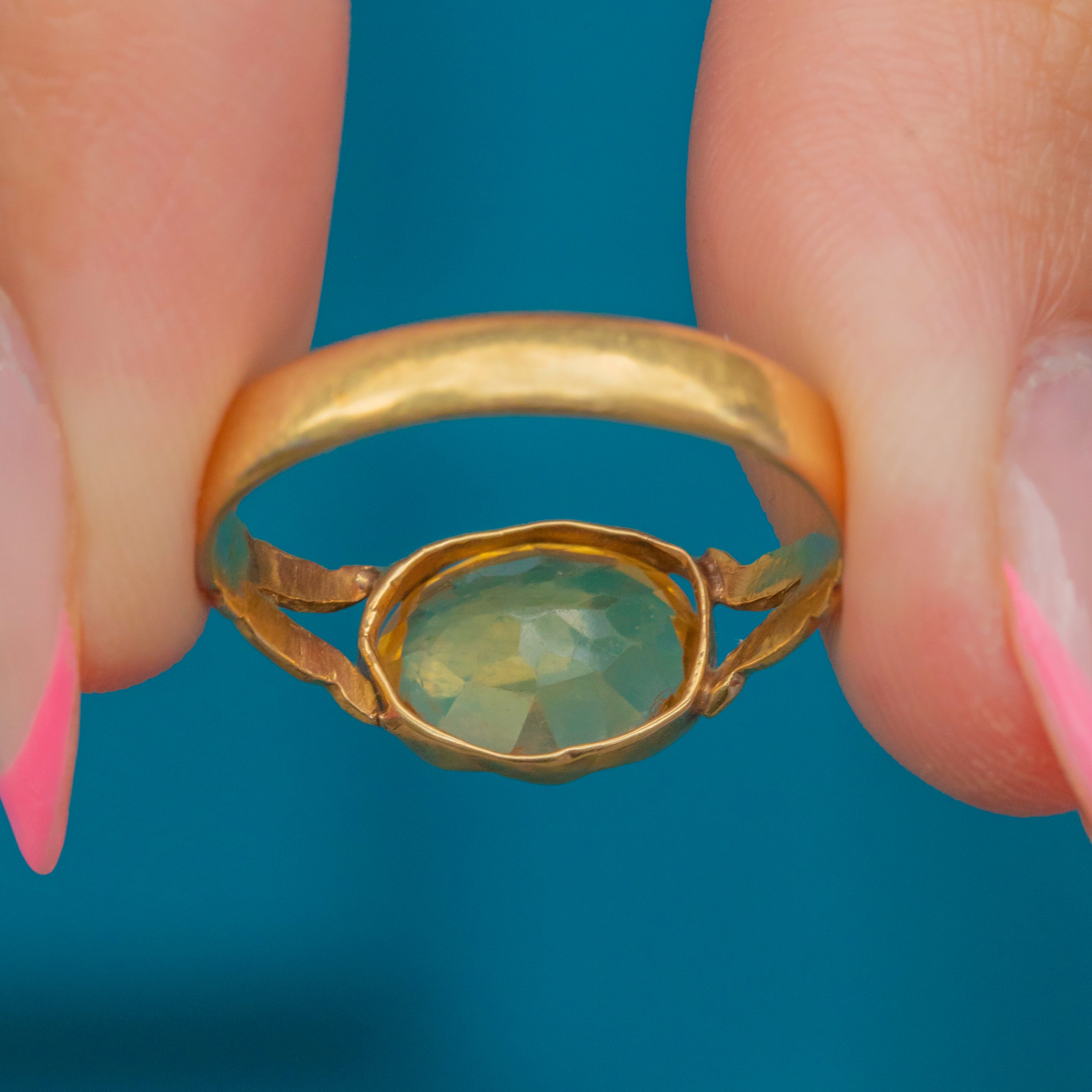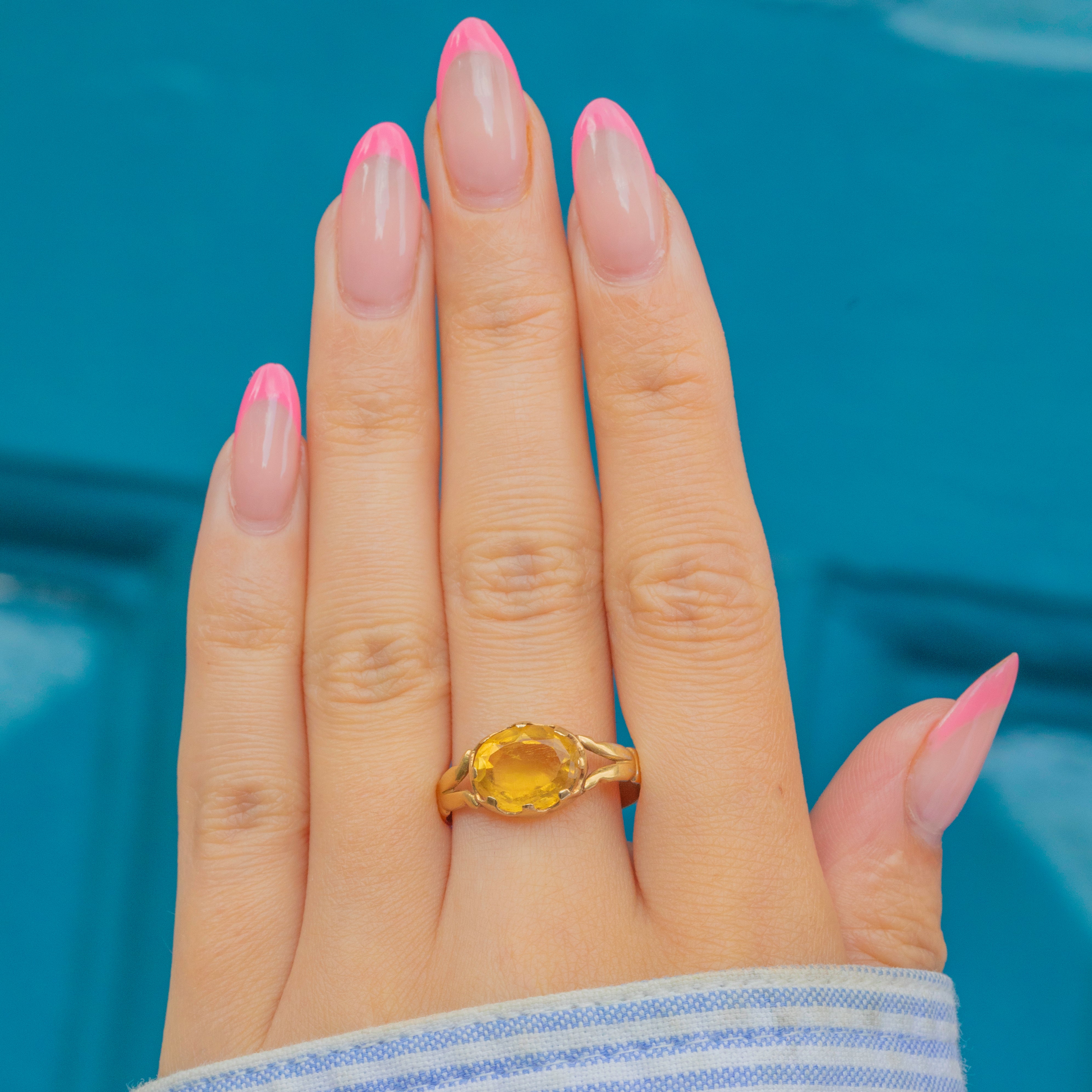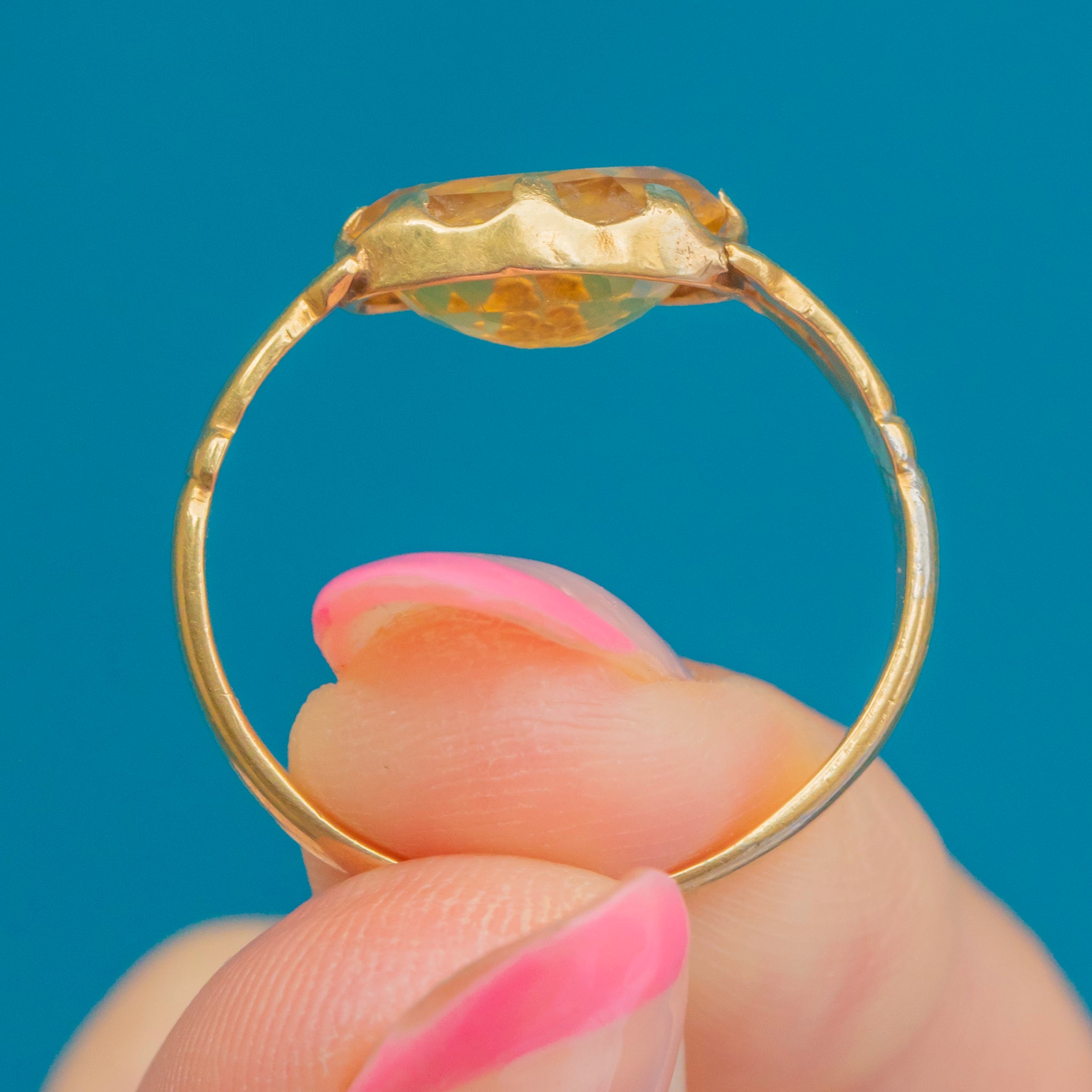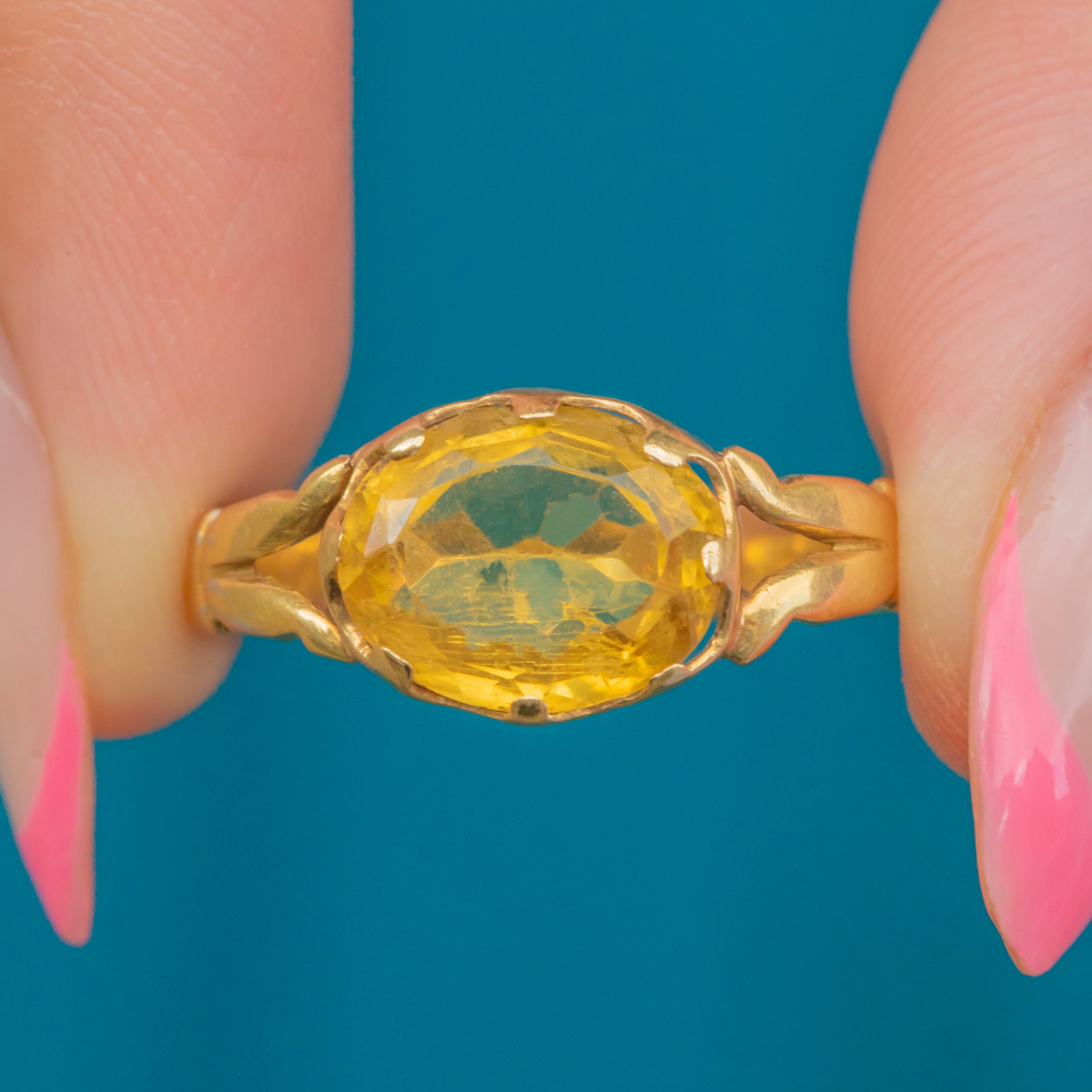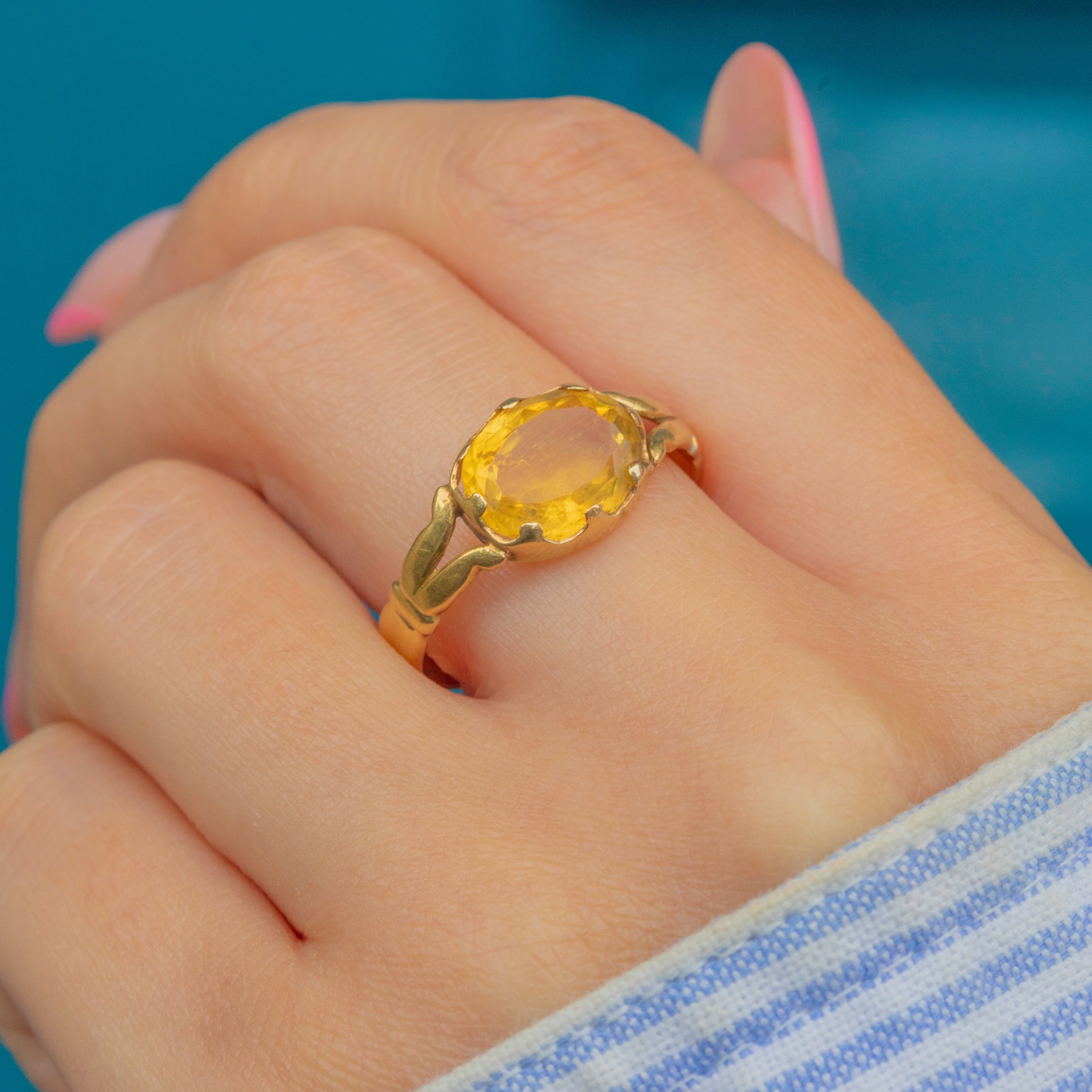 Centred by a 1.75ct Citrine, this antique gemstone boasts the most stunning honey nectar hues as she catches the light. She is flanked by bright and buttery 18ct Gold split shoulders, with the warmth of her band highlighting the Golden lustre of this gorgeous ring.