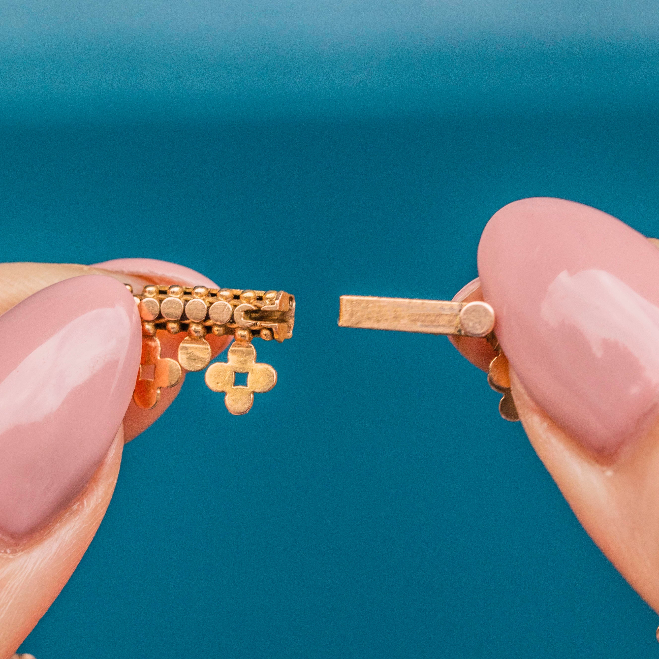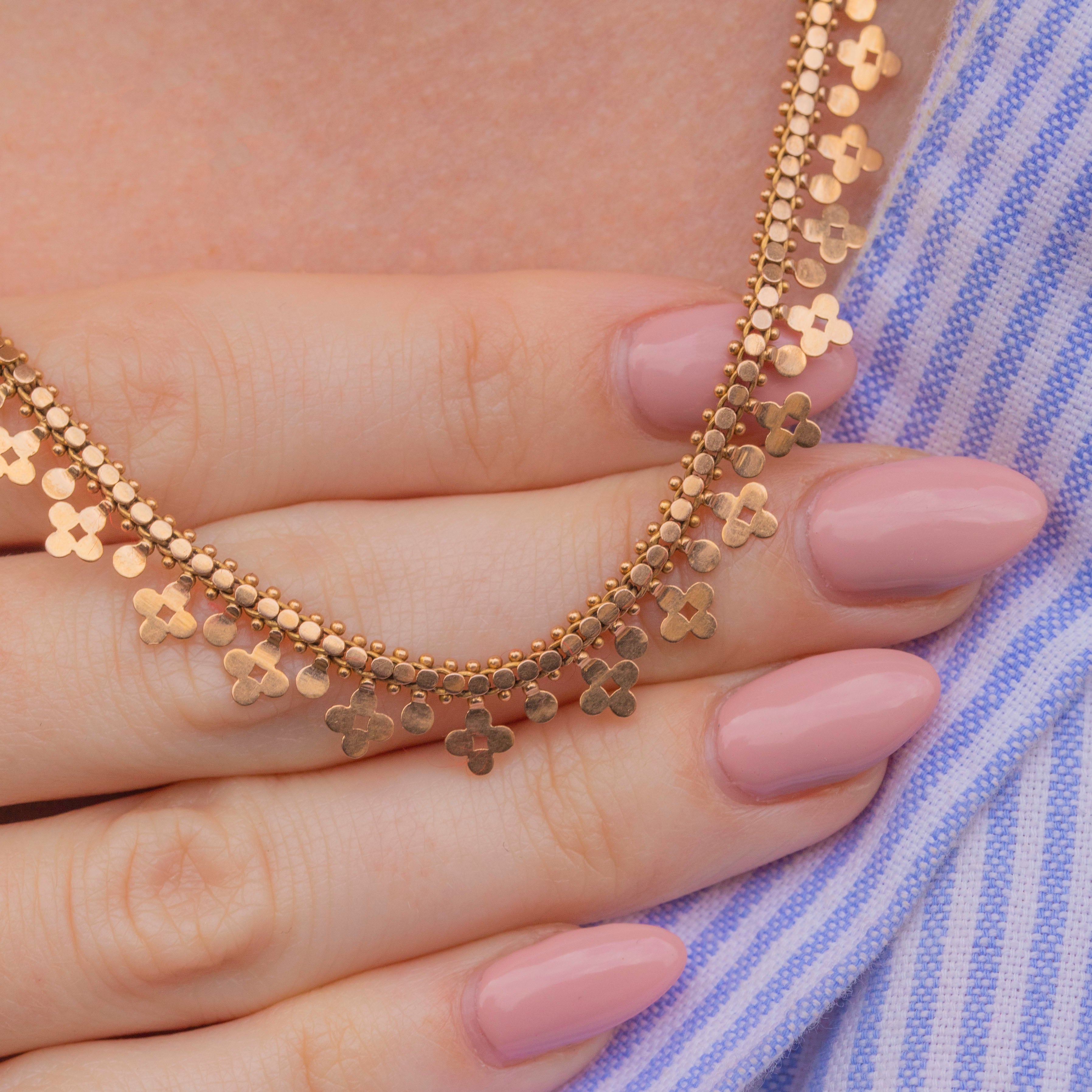 This outstanding antique 18ct Gold clover fringe necklace will bring a unique edge to your necklace stack! Crafted from sumptuous 18ct Gold, the entire length of this Victorian necklace is made up of exquisitely crafted links that will send golden shimmers cascading across your décolletage as they catch the light.