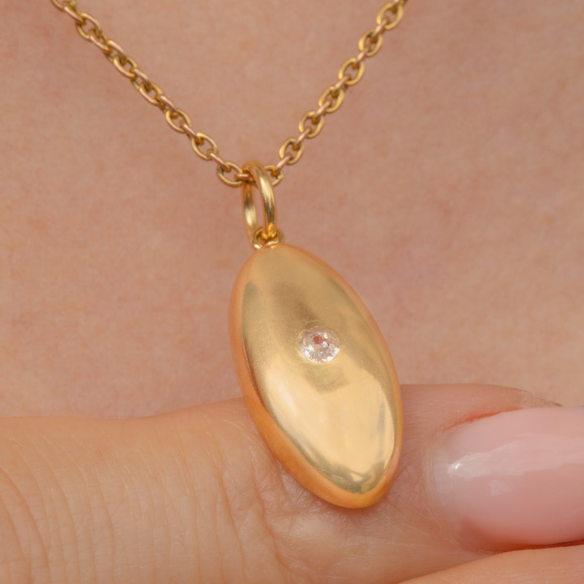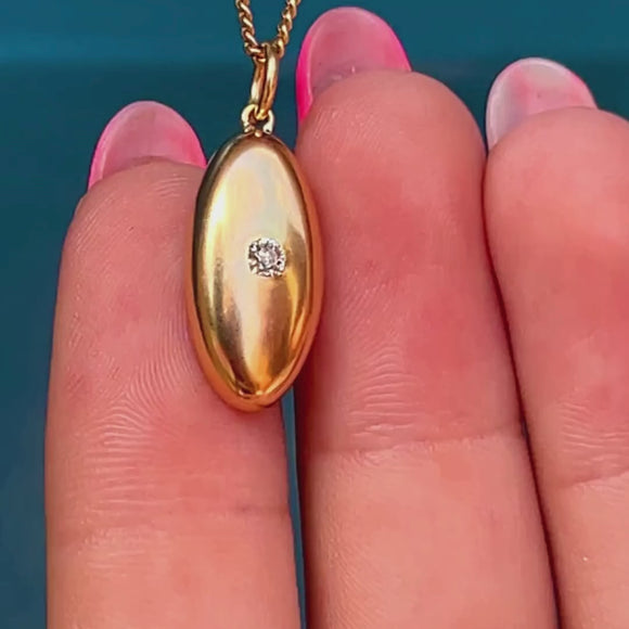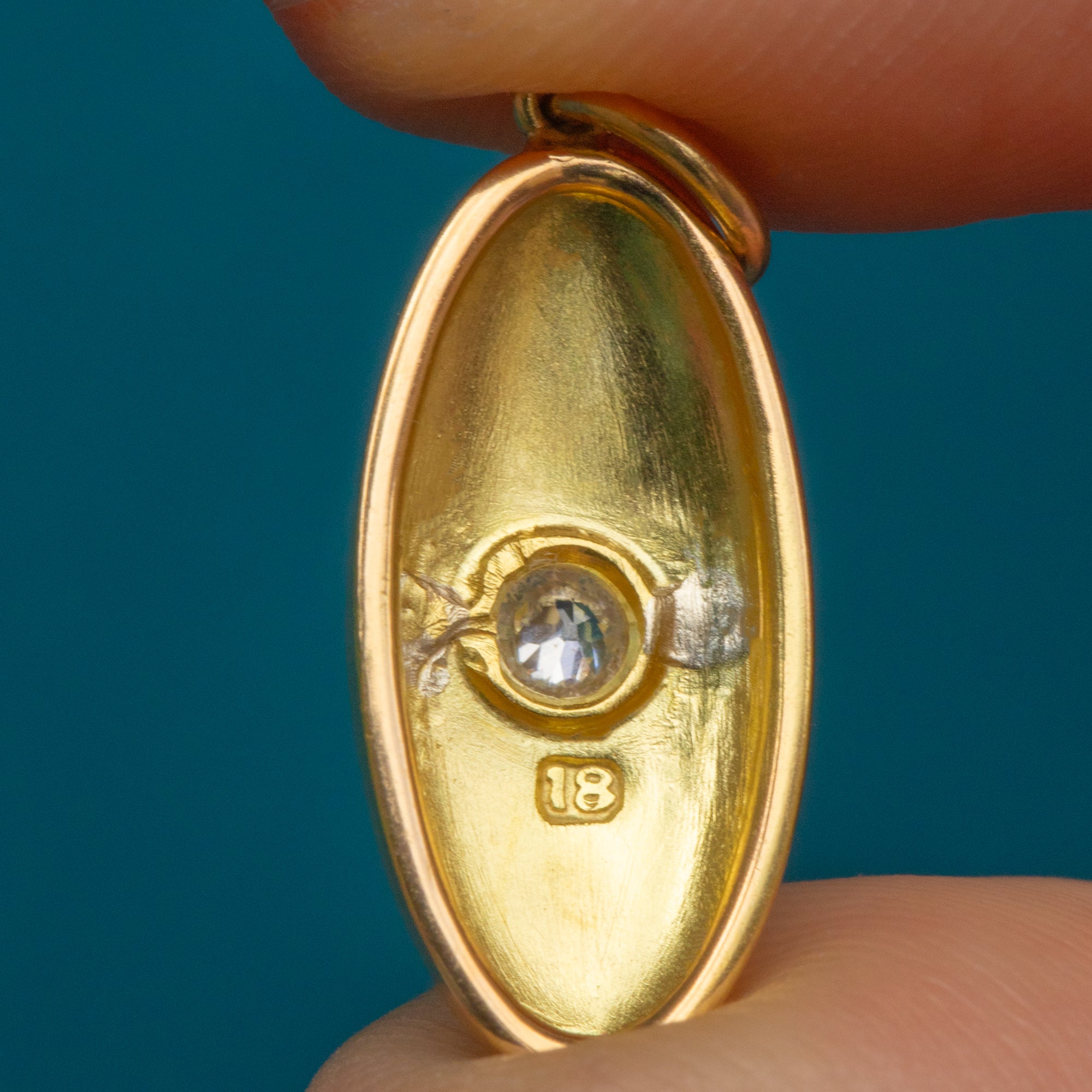 EXCELLENT. This antique 18ct Gold Diamond lozenge charm is in excellent condition! The back of the piece is stamped 18 and the Gold exudes a gorgeous buttery hue. The Diamond is securely set and free from chips or abrasions. The surface is smooth and the piece sits comfortably against the chest.