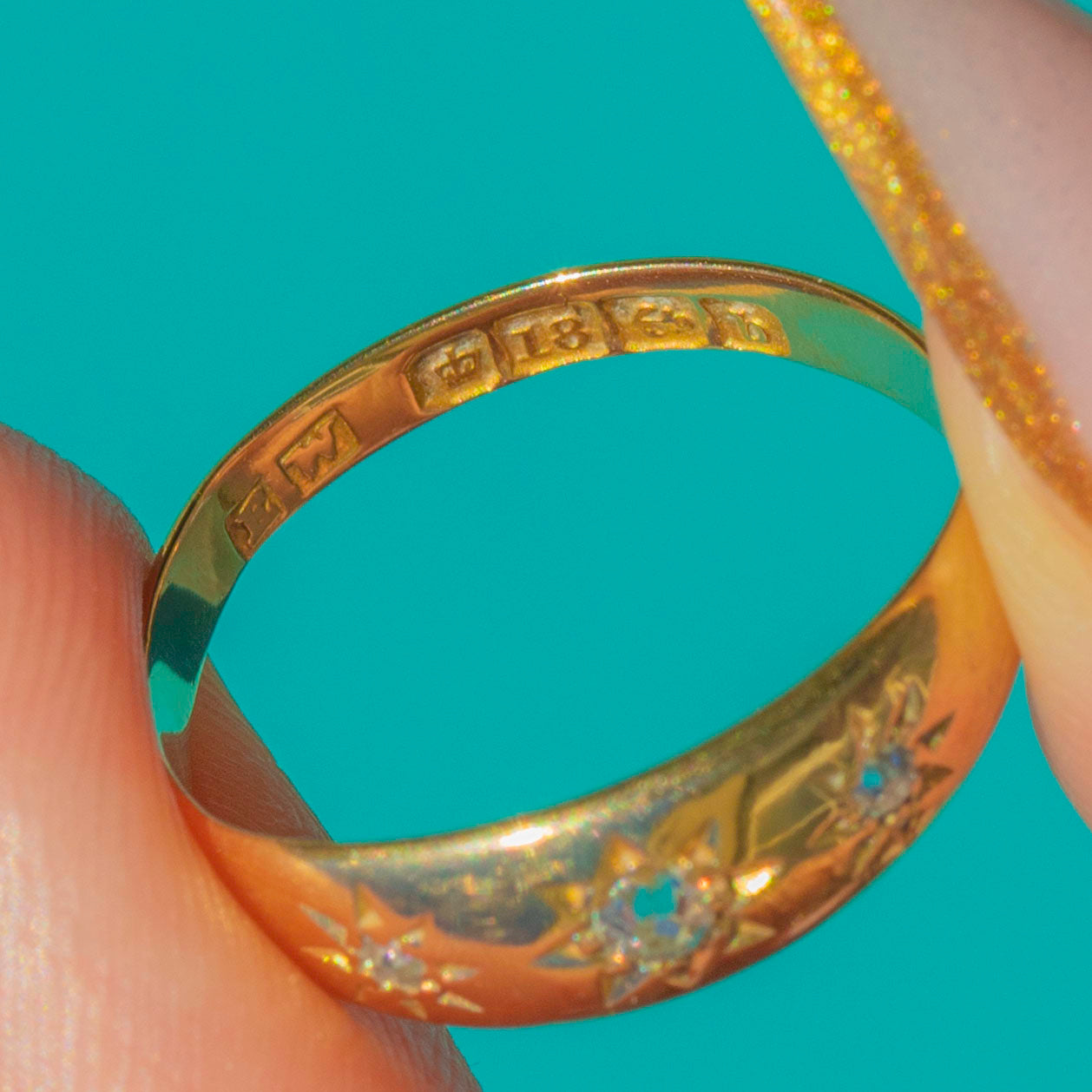 This antique 18ct Gold gypsy ring is a little band of Edwardian starlight. Three twinkling antique Diamonds are neatly set in star-shaped settings across the front, the central stone an old mine cut flanked by charming rose-cut accents. The Gold has that lovely bright, buttery hue only high-carat antique Gold can give, with a soft patina that speaks to over a century of love.