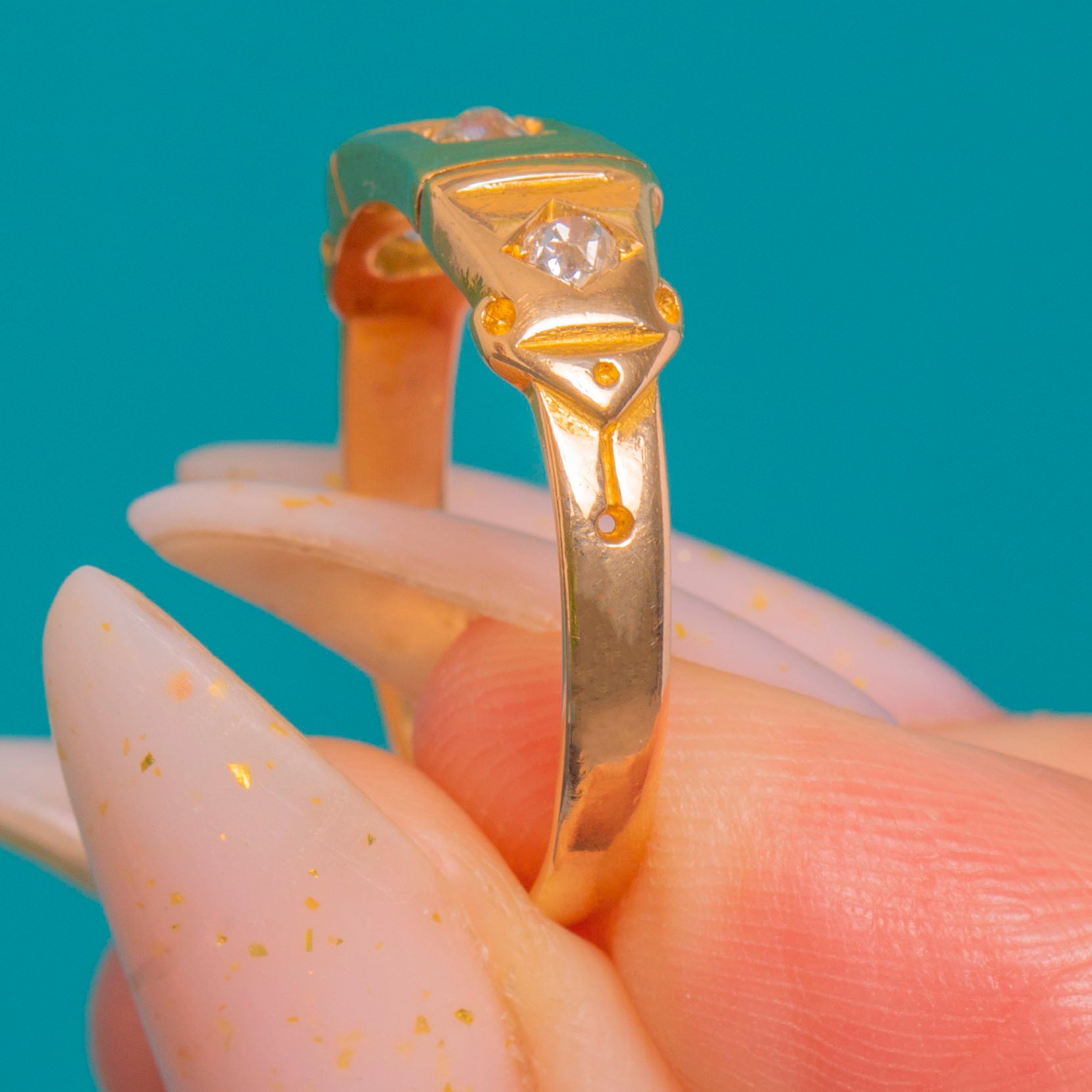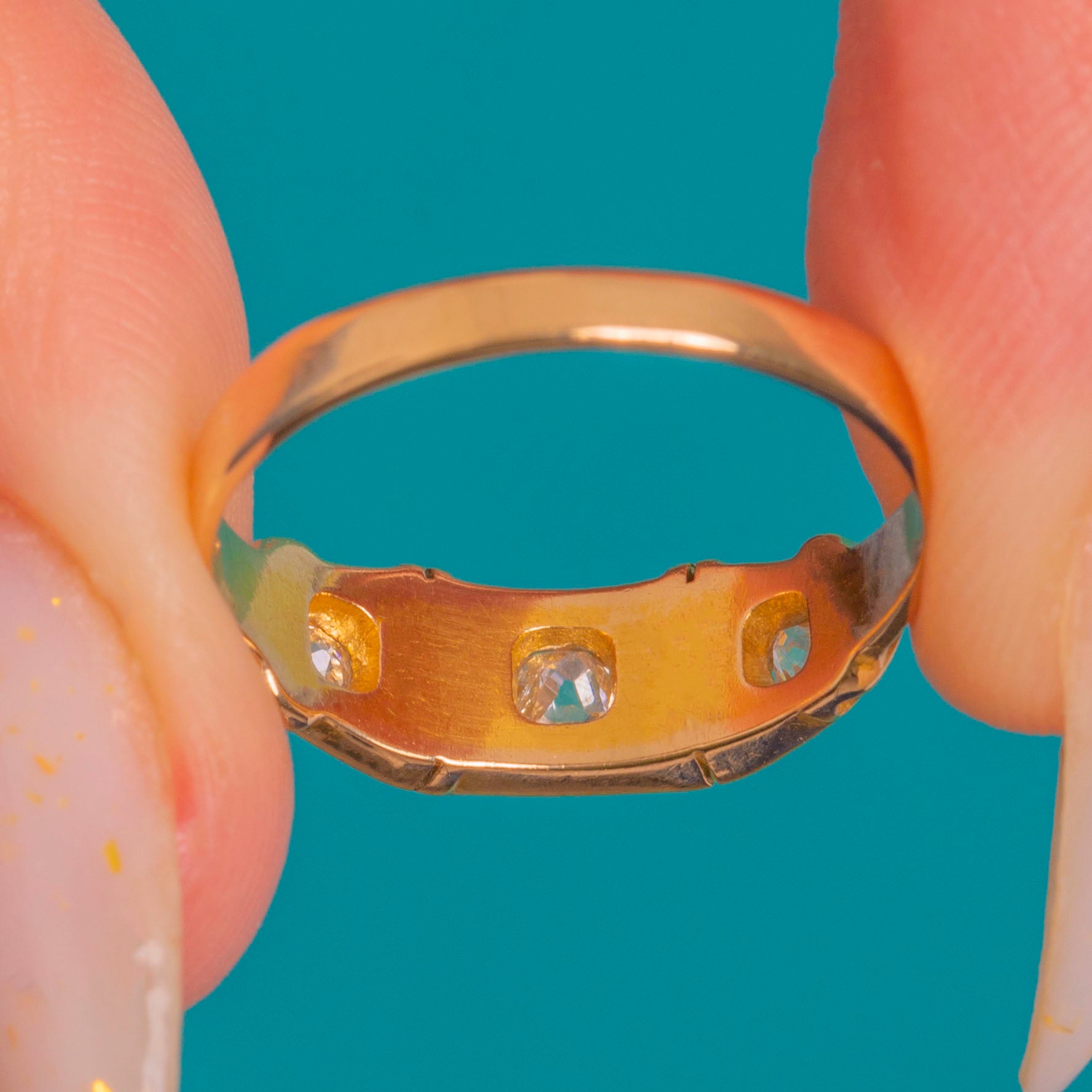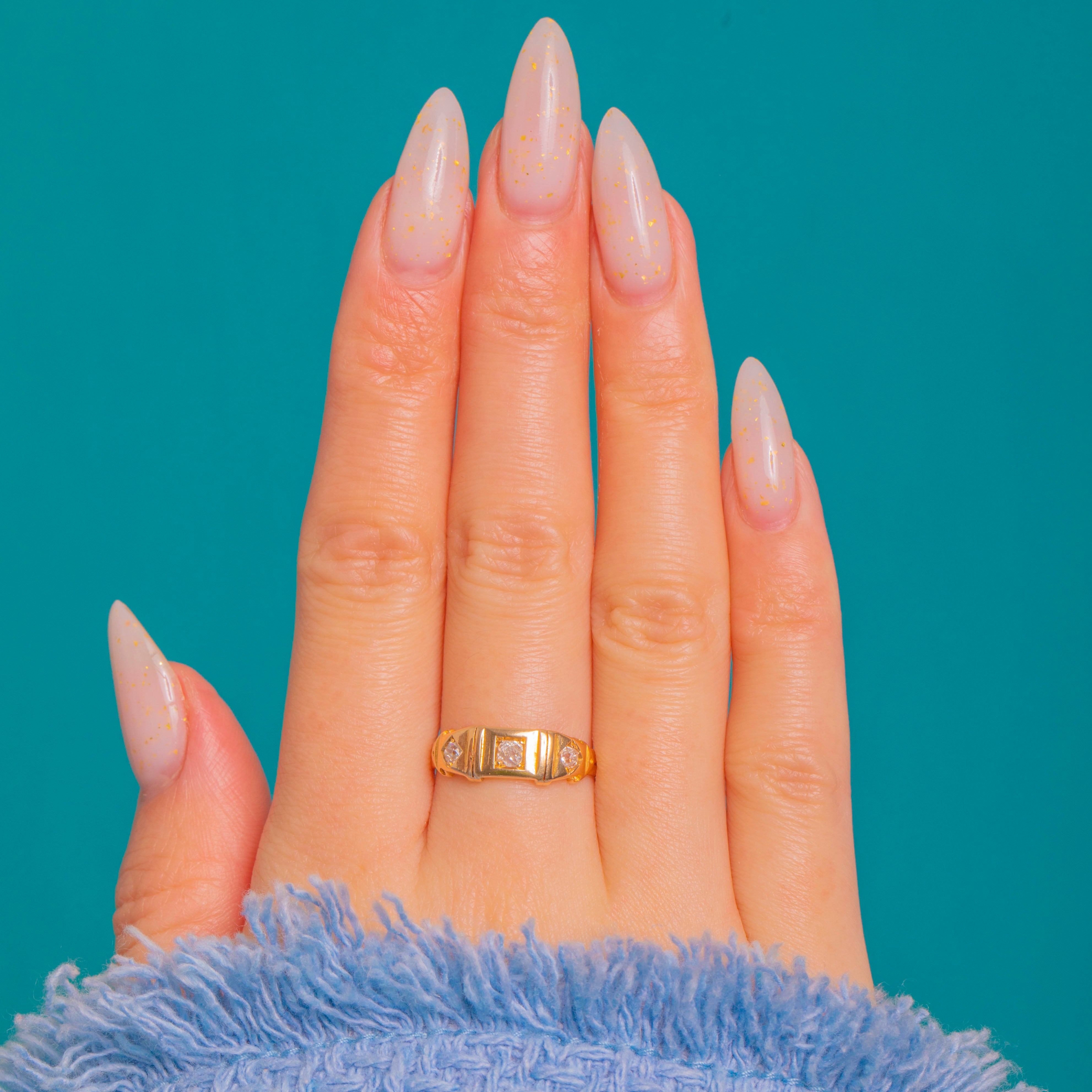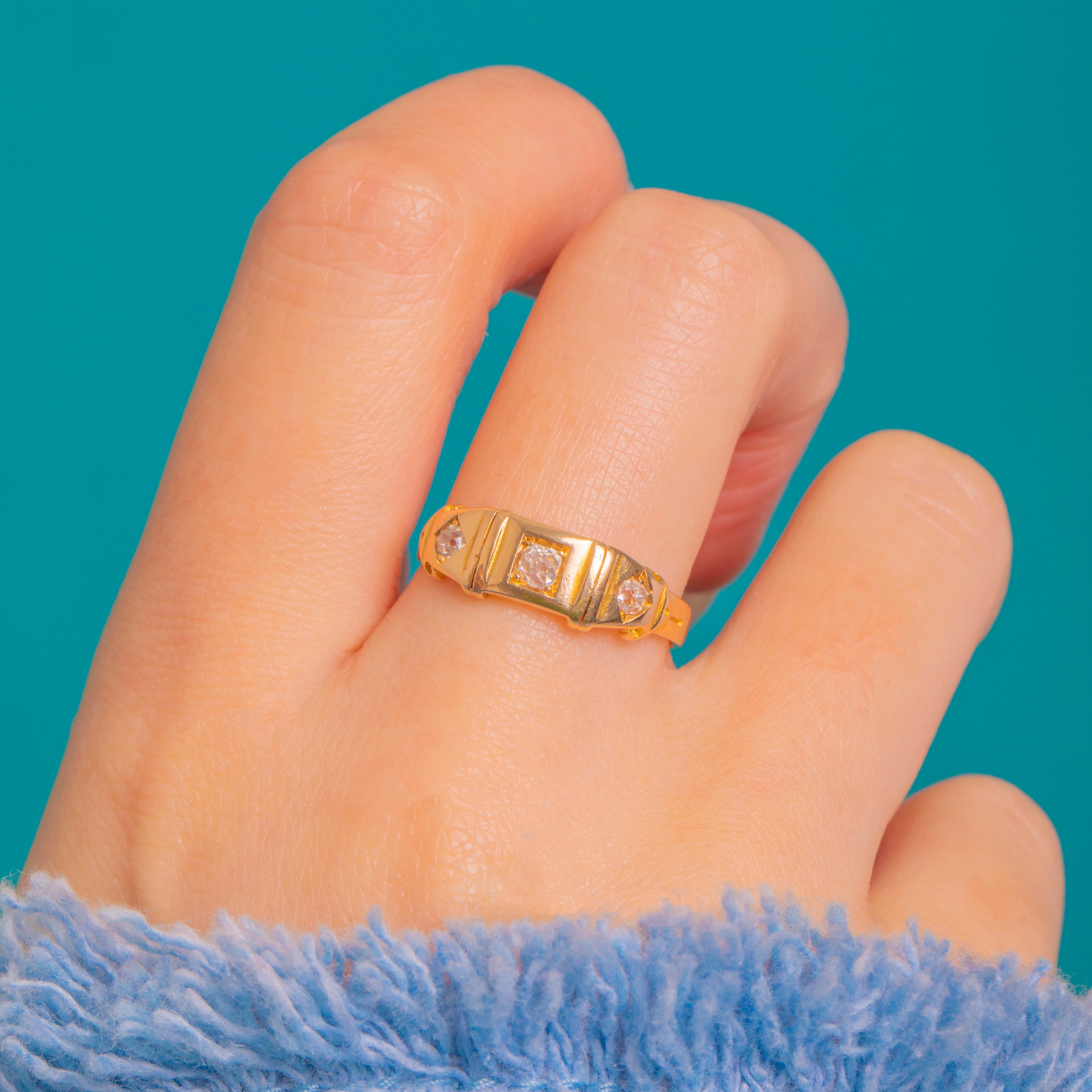 A refined Victorian 18ct Gold buckle ring set with a crisp trio of gypsy-set Diamonds. The low-profile band and sleek, geometric head give this antique classic a streamlined, architectural presence, while the flush settings lend a smooth, comfortable fit and understated sparkle.