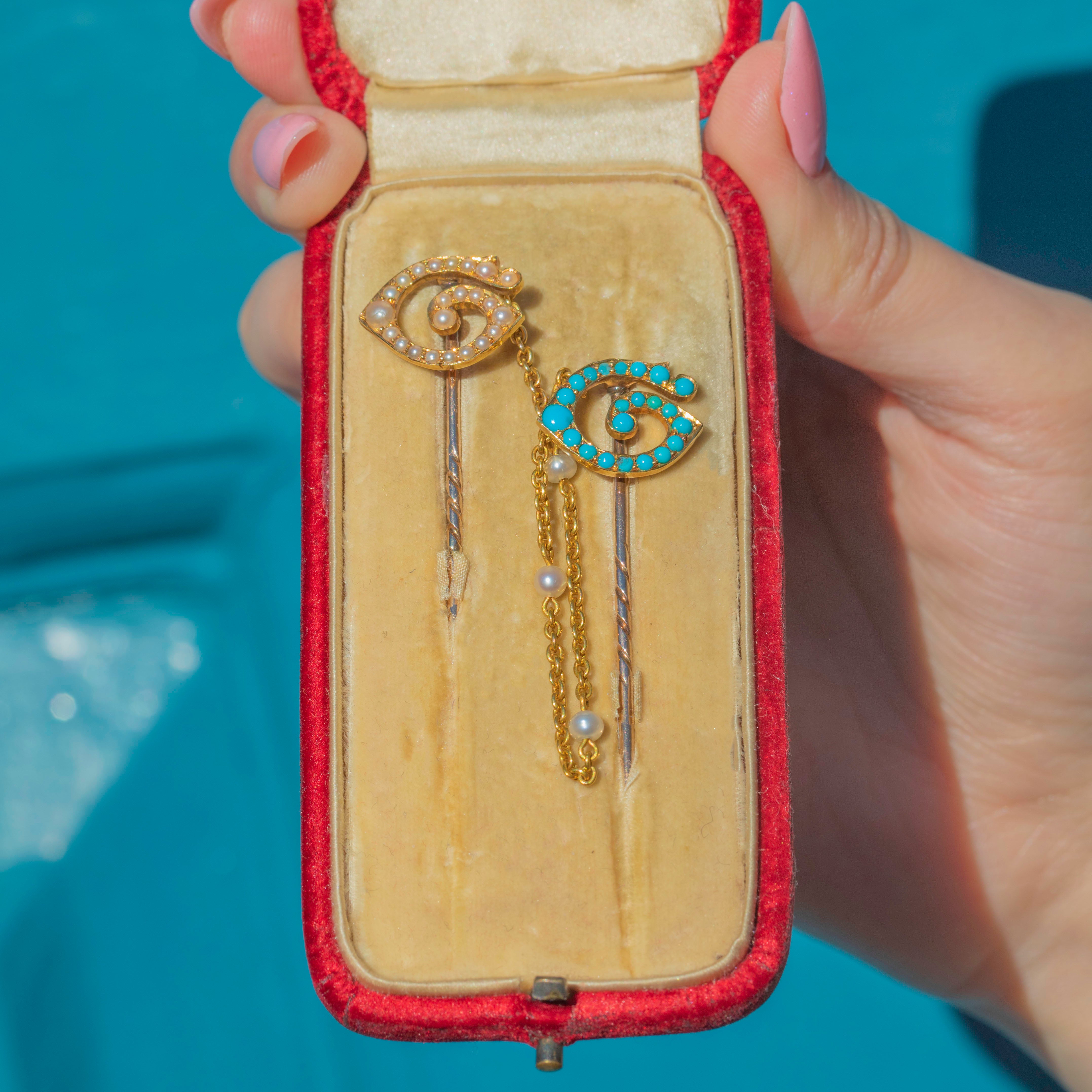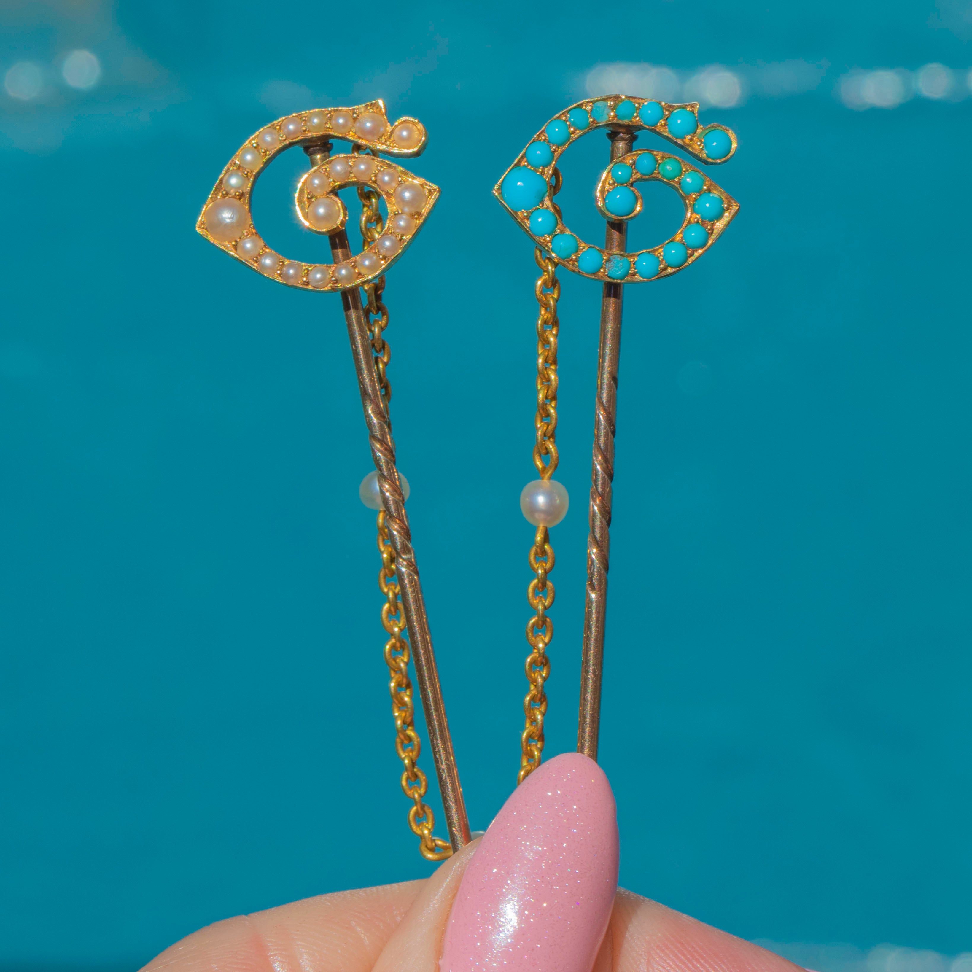 If you have a penchant for unusual jewels, this antique 18ct Gold Egyptian Revival Turquoise Pearl stick pins set will make a superb addition to your collection! Undeniably striking, each stick pin displays an Eye of Ra, a motif that celebrates the sun god Ra and was used as a powerful symbol of the protective and radiant qualities of the sun.