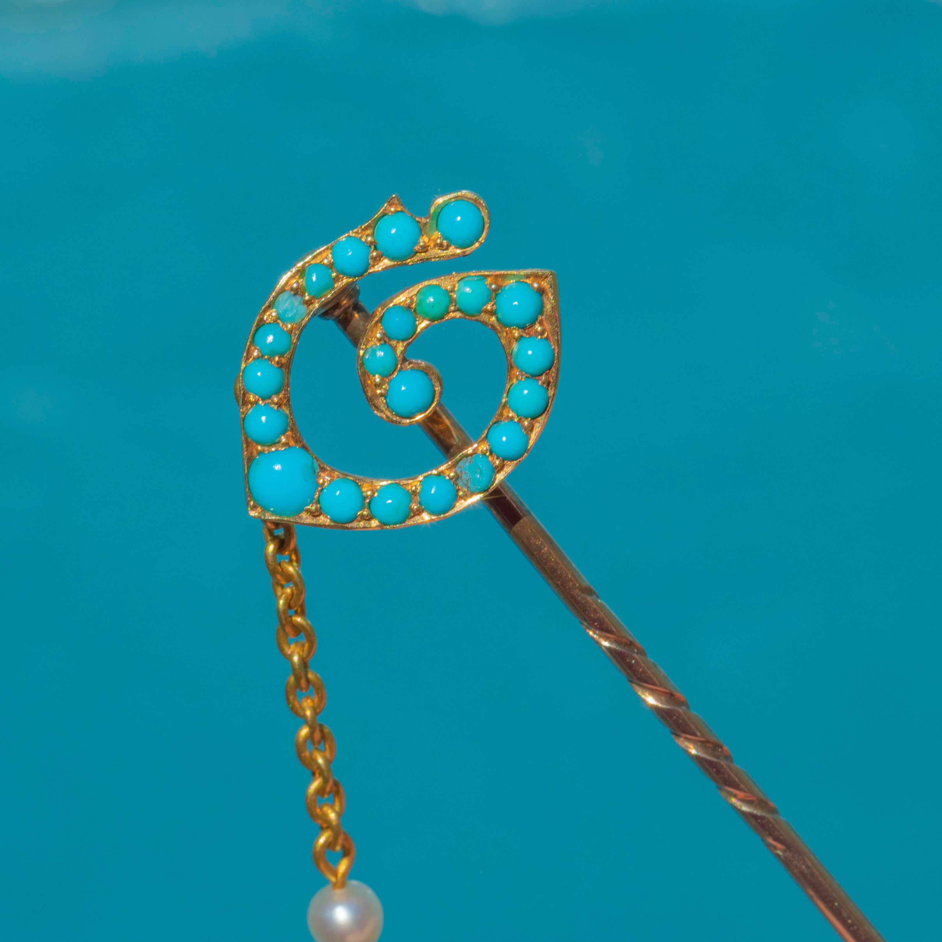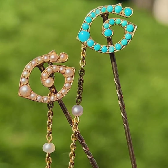 Antique 18ct Gold Egyptian Revival Turquoise Pearl Stick Pins Set in Original Antique Box
